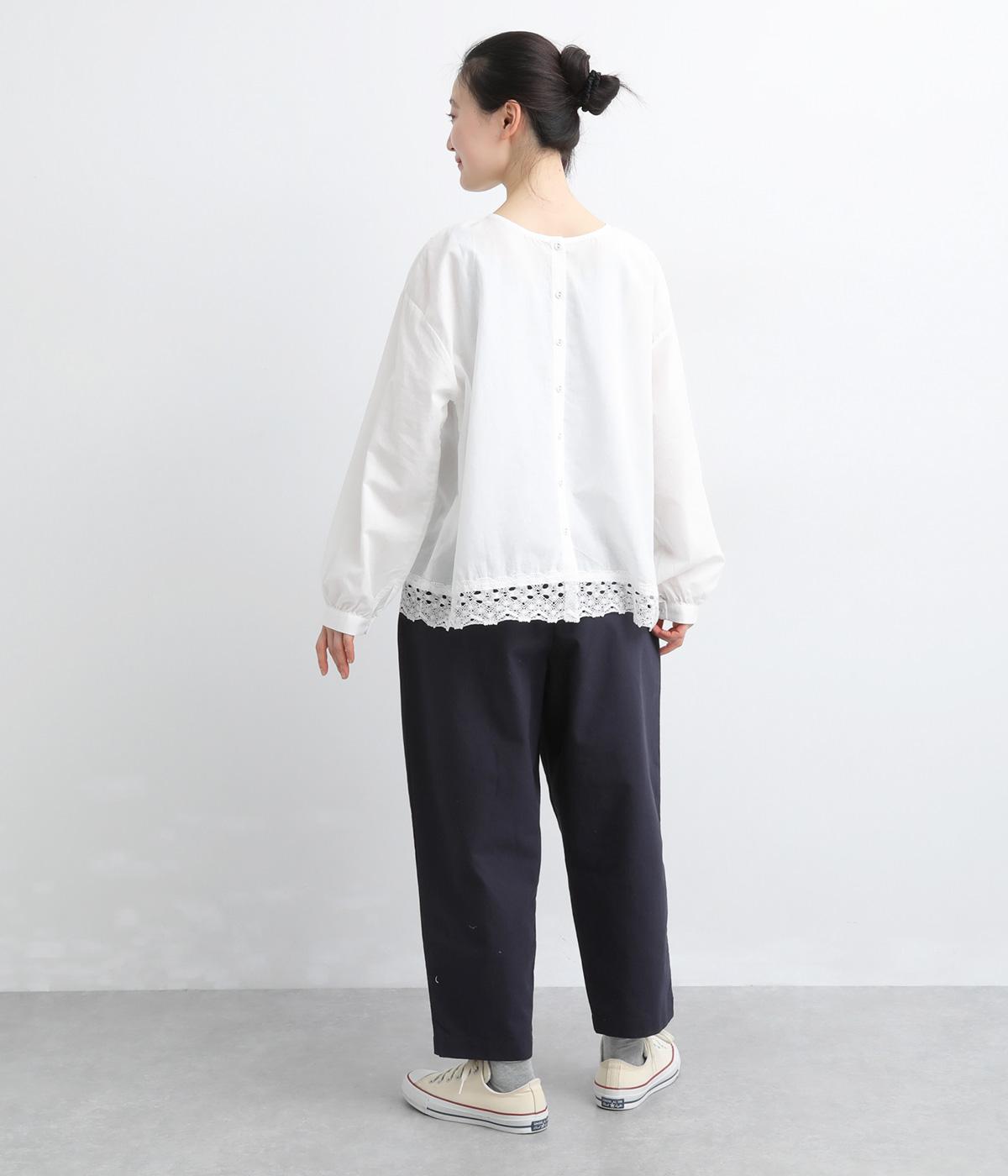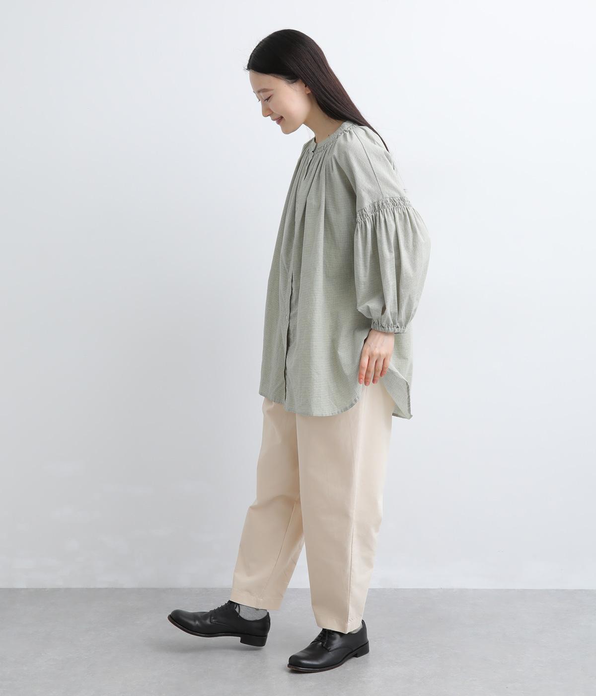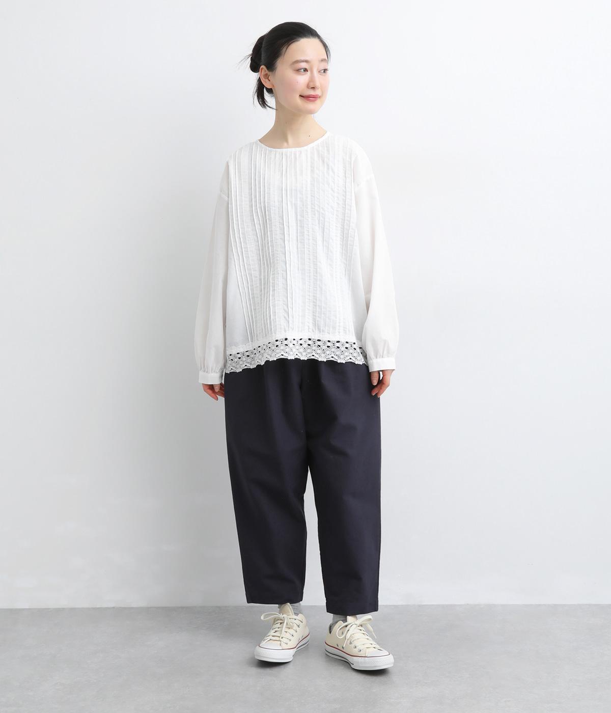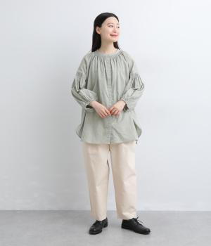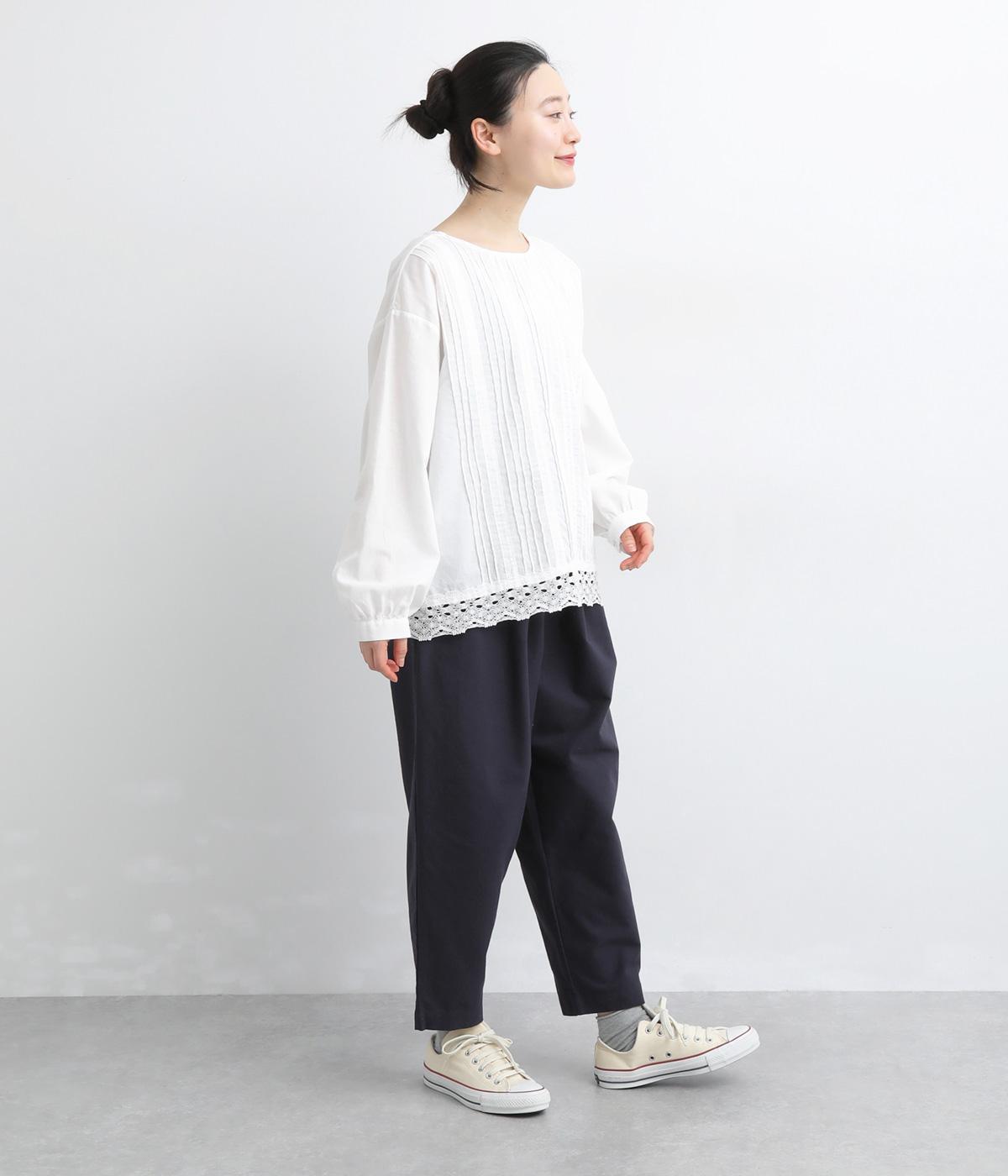 タックを入れて腰まわりにゆとりを持たせたテーパードパンツ。ふくらみのある素材が自然な立体感を描き、シンプルながらも雰囲気のいい着こなしに。ウエストはフィット感のいい総ゴムに調整紐を入れました。