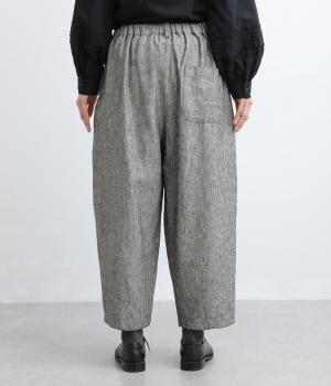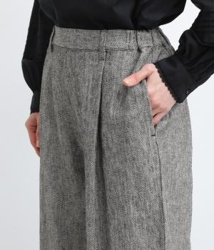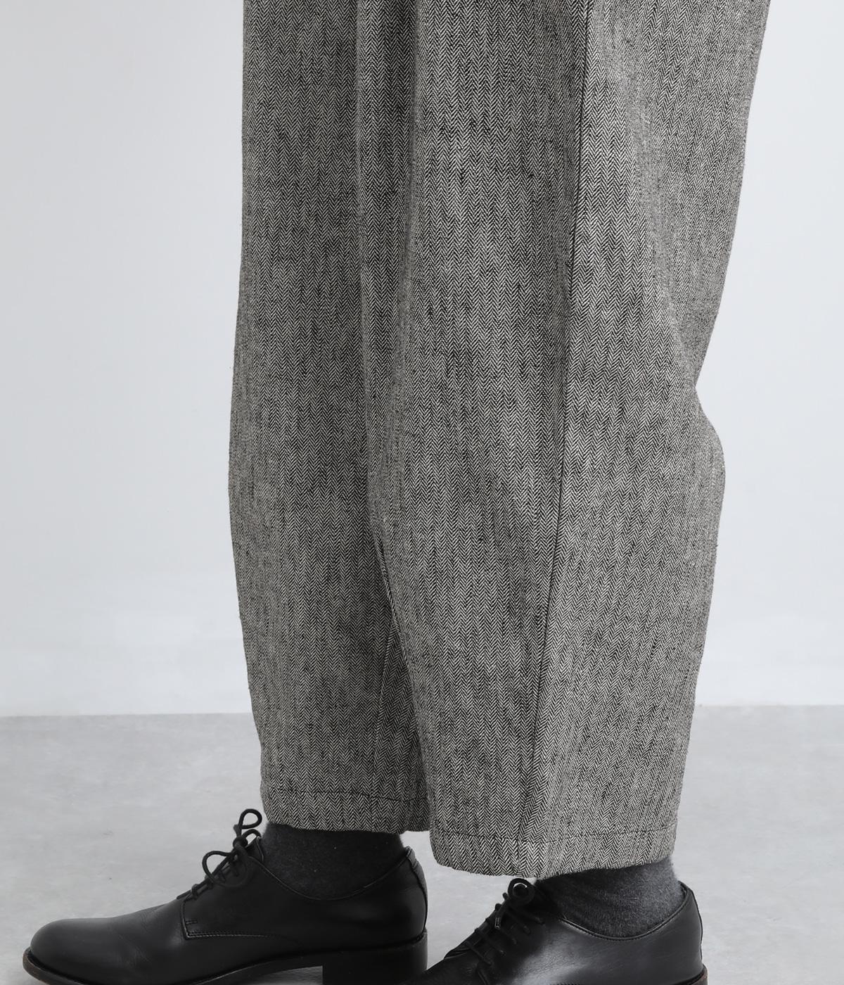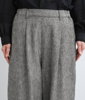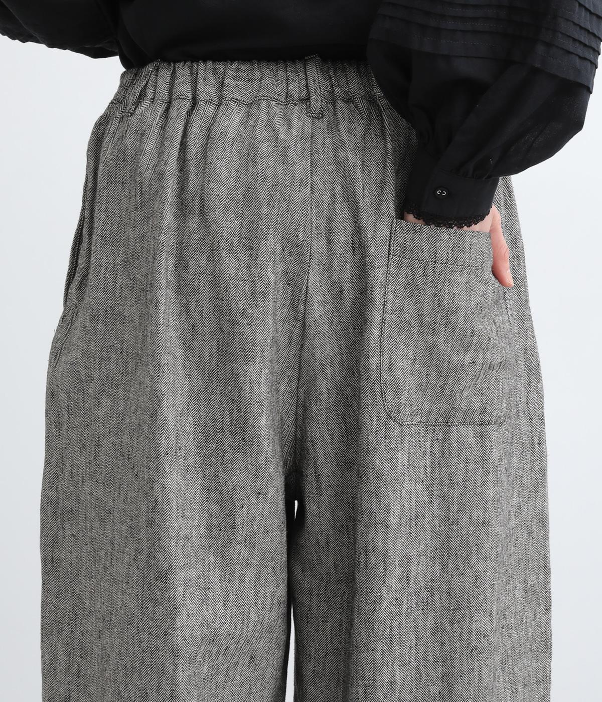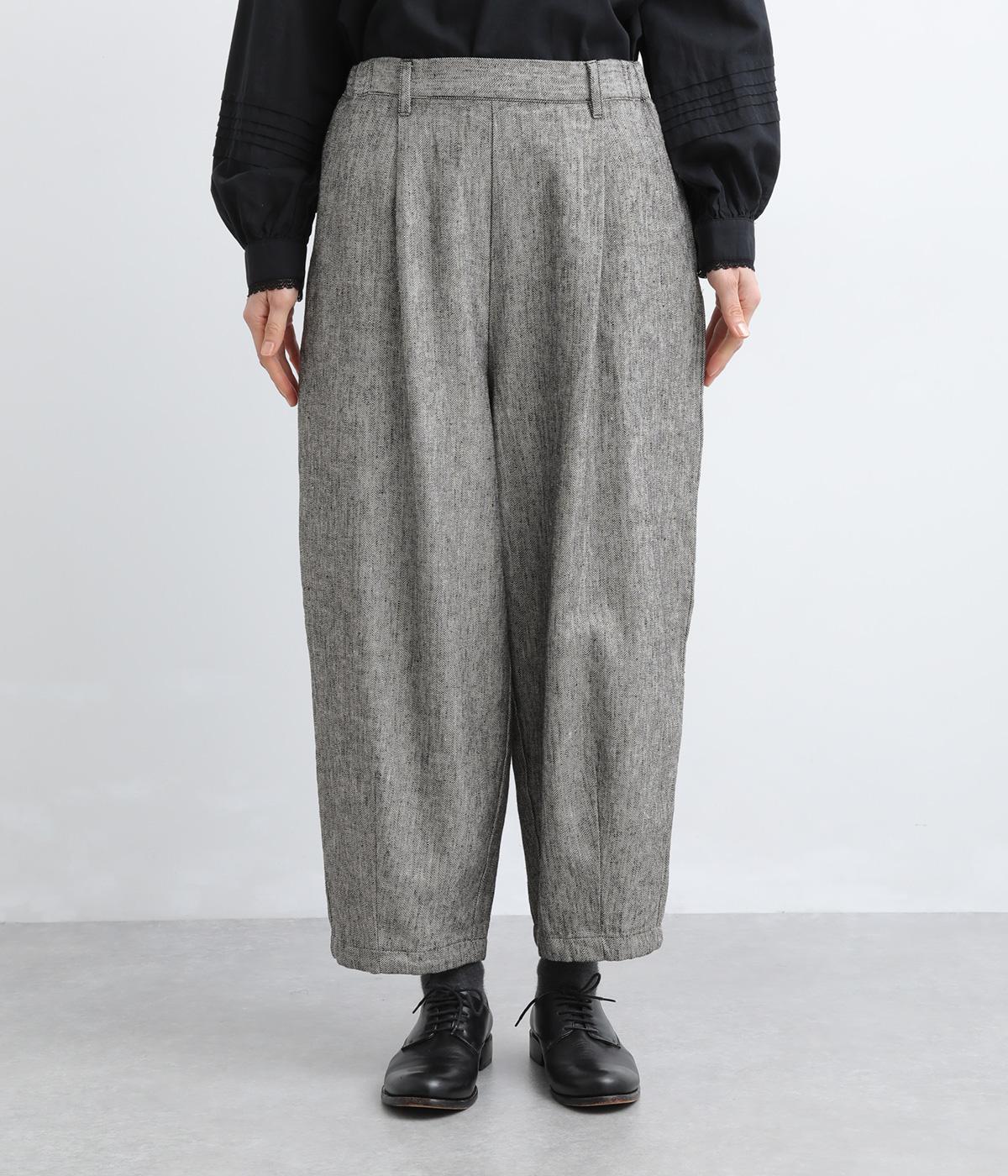腰にタック、裾にダーツを入れて立体感をもたせたコクーンパンツ。ヘリンボーンのきちんと感と、ゆるさのあるシルエットが好バランスで、きちんと見えもお洒落感もどちらも◎。ウエストは後ろゴム入りでトップスインもおすすめ。