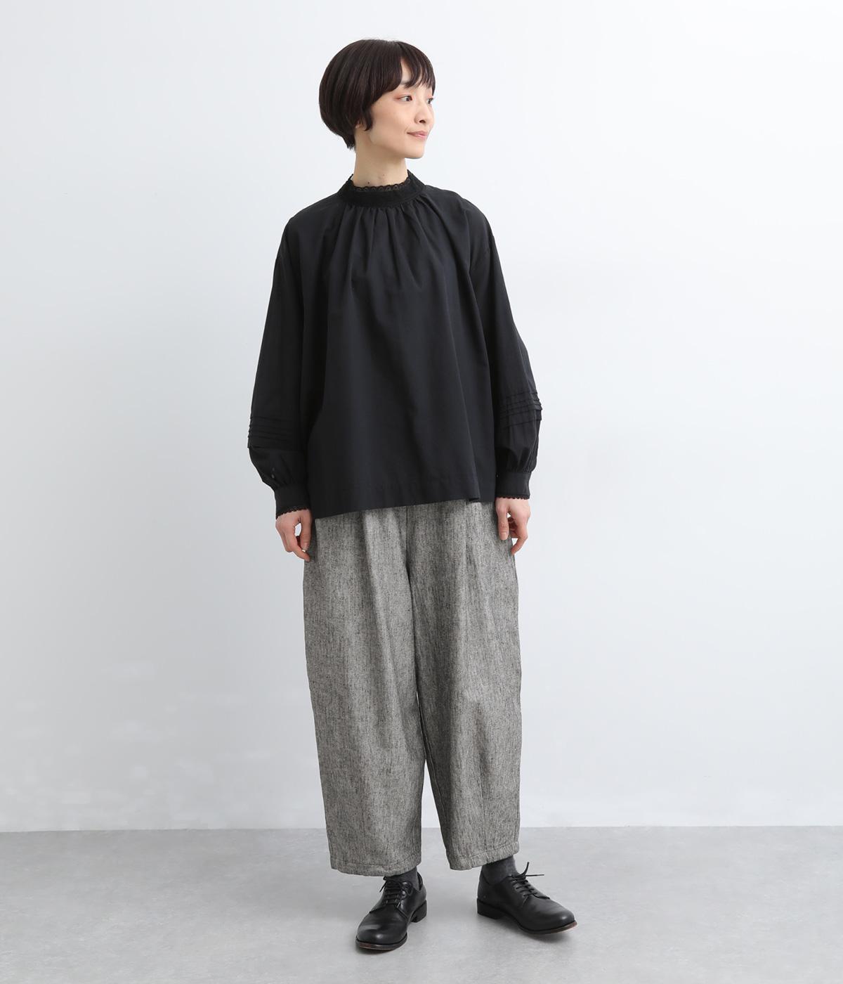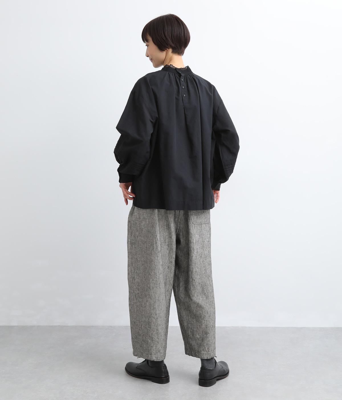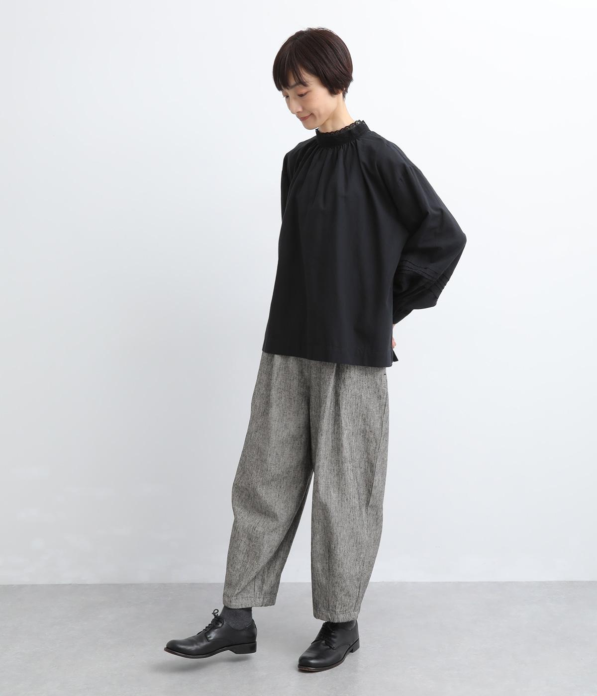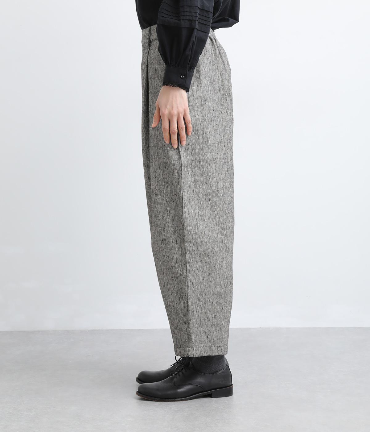 腰にタック、裾にダーツを入れて立体感をもたせたコクーンパンツ。ヘリンボーンのきちんと感と、ゆるさのあるシルエットが好バランスで、きちんと見えもお洒落感もどちらも◎。ウエストは後ろゴム入りでトップスインもおすすめ。