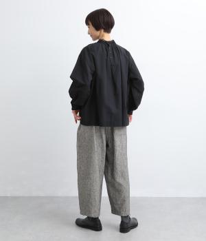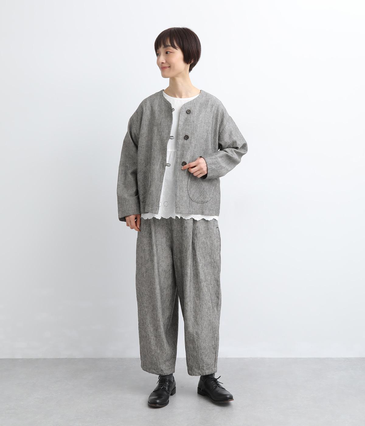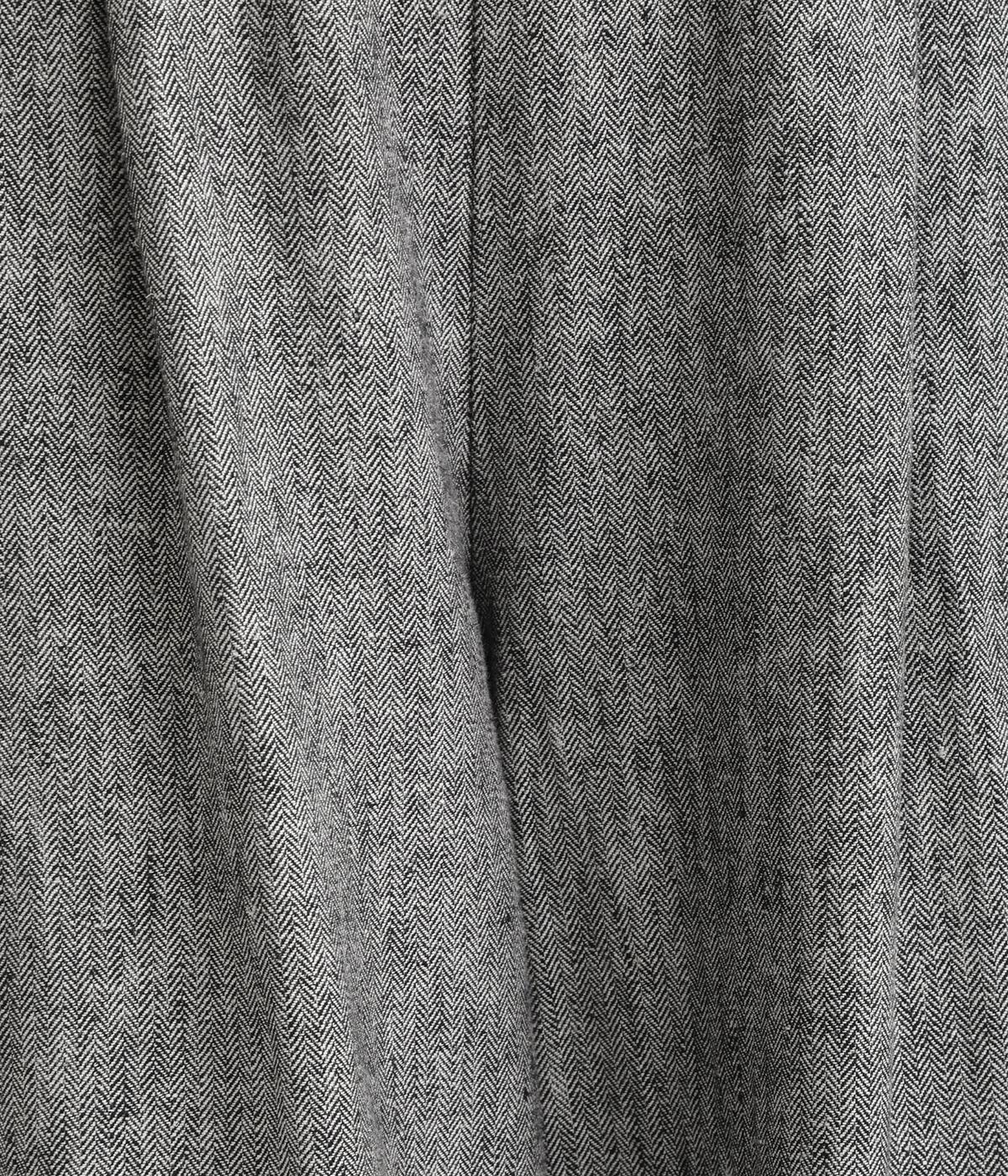 コットンにリネンをまぜ、ほのかに起毛をかけてあたたかみと優しい風合いをつけたヘリンボーン生地を使用。適度にふくらみのある中厚手ではきやすい仕上がりです。