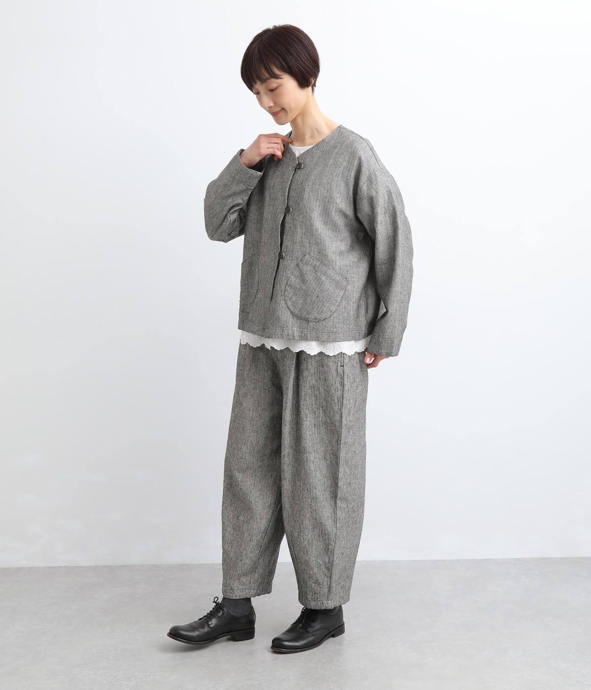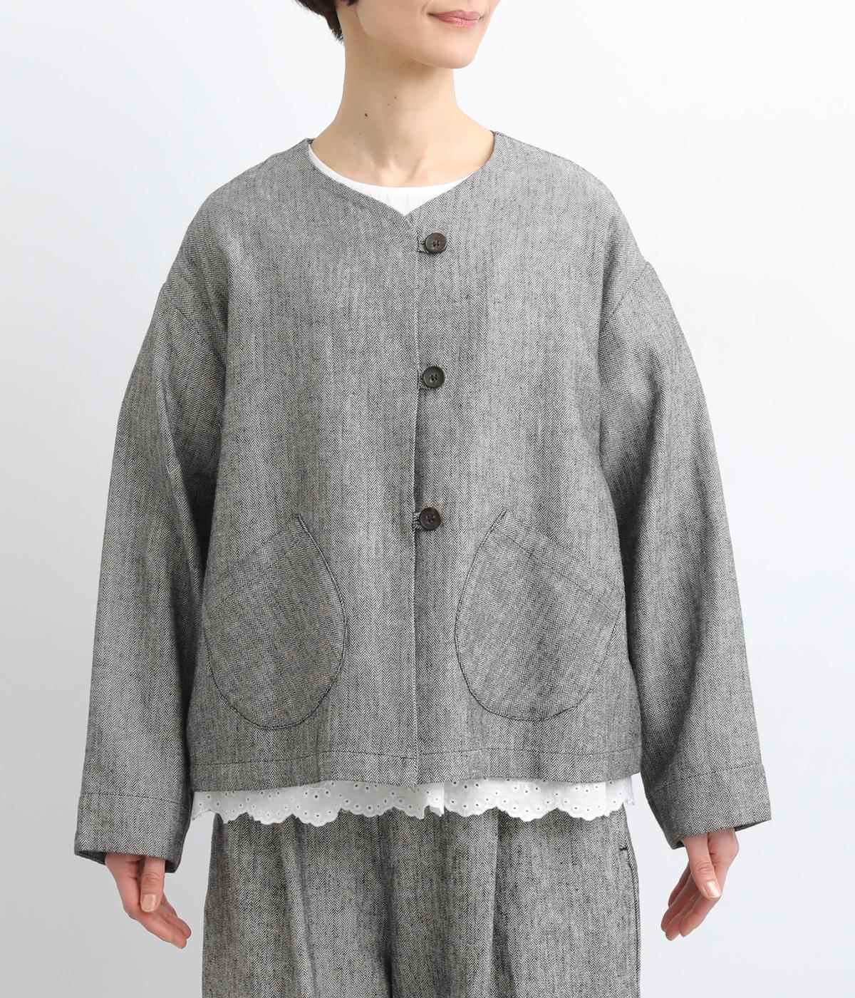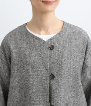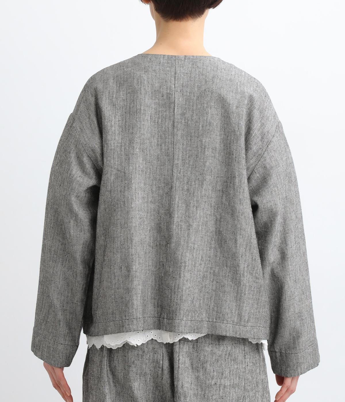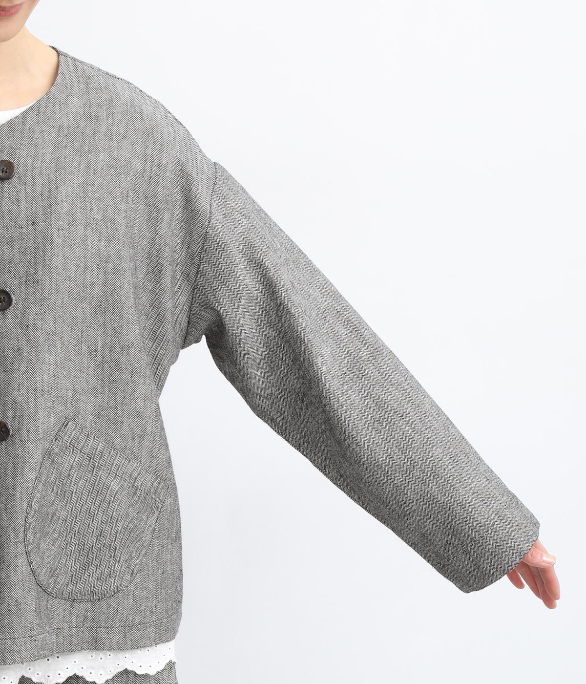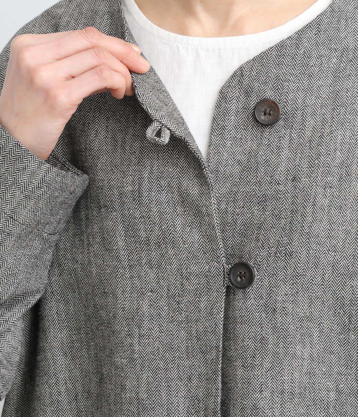 シックできちんと感のあるヘリンボーンジャケットを、ななめポケットやノーカラーで抜け感のあるデザインに仕上げました。すっきりした丈感で着こなしやすく、インのトップスを軽くのぞかせても◎。同素材パンツあわせでセットアップにするのもおすすめ。