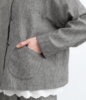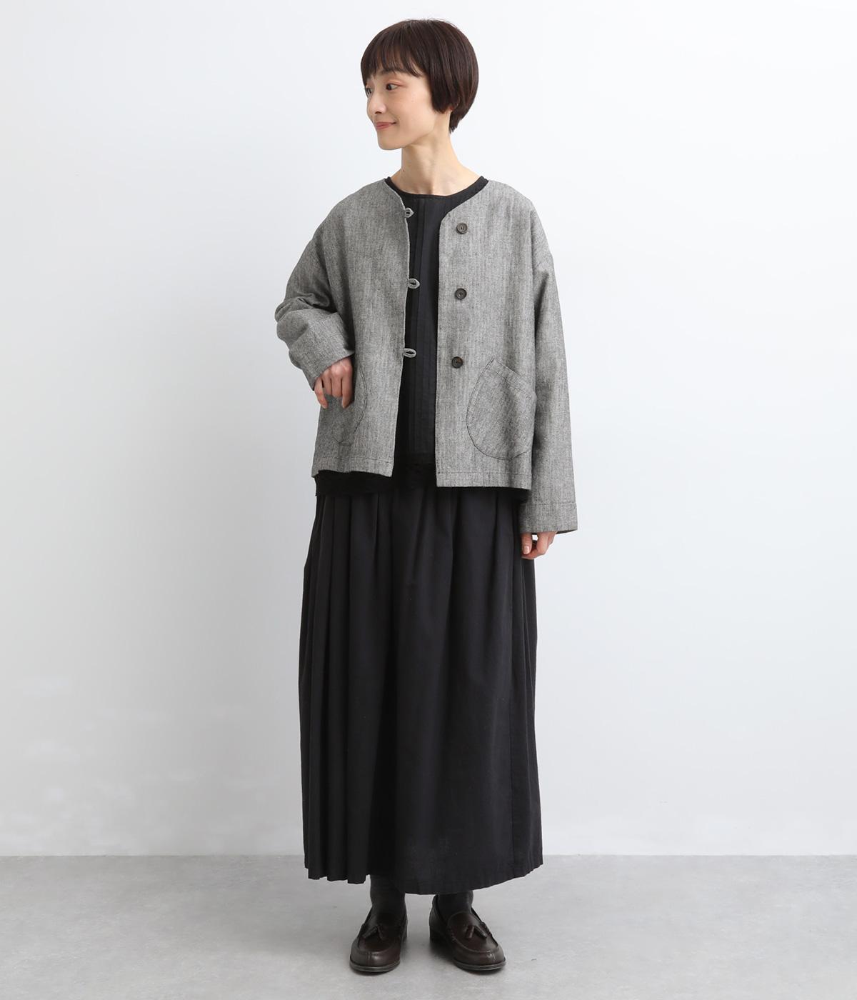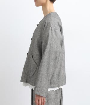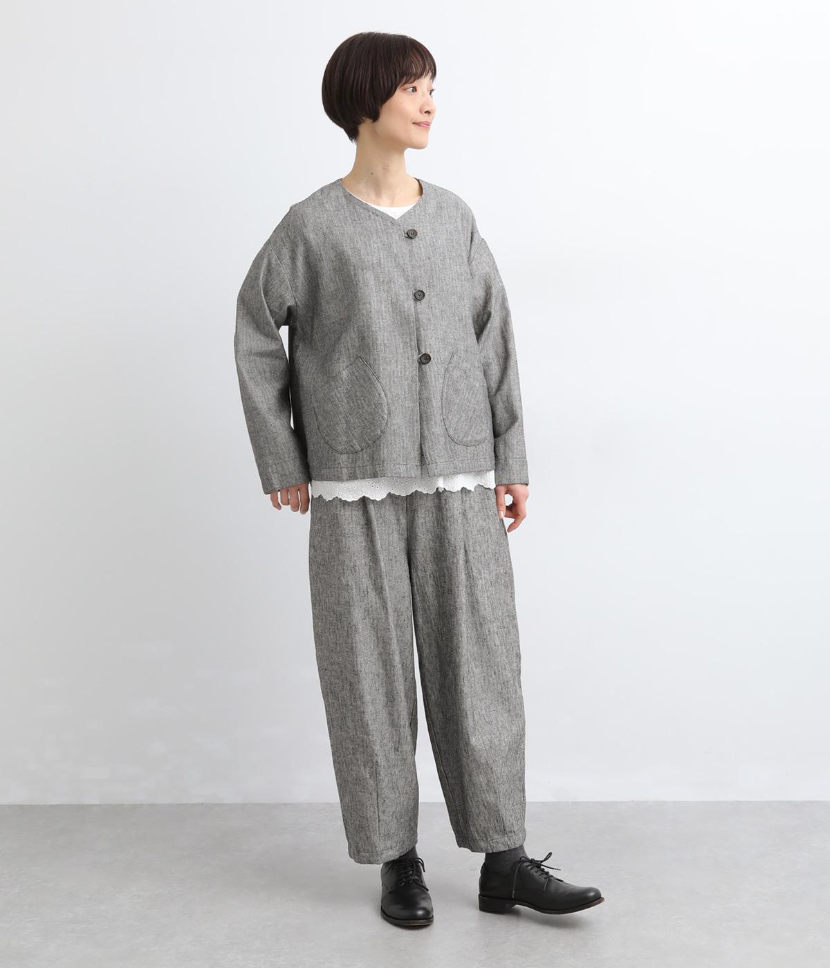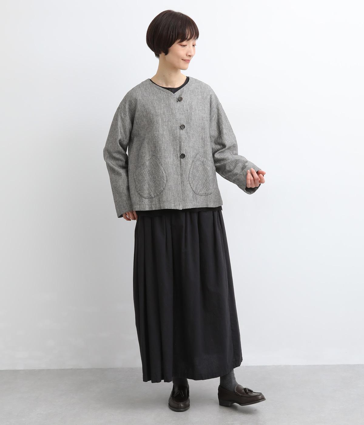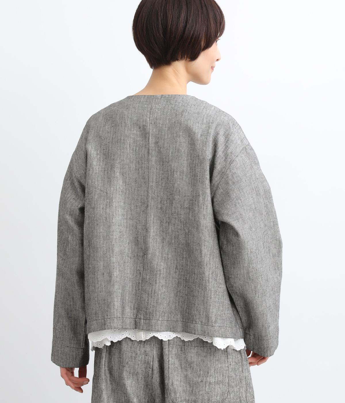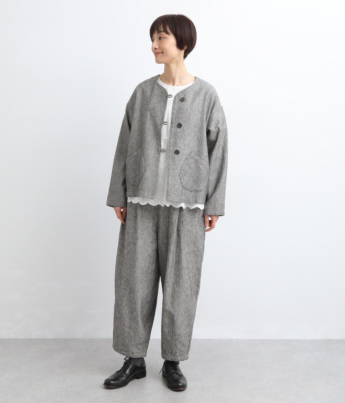 シックできちんと感のあるヘリンボーンジャケットを、ななめポケットやノーカラーで抜け感のあるデザインに仕上げました。すっきりした丈感で着こなしやすく、インのトップスを軽くのぞかせても◎。同素材パンツあわせでセットアップにするのもおすすめ。