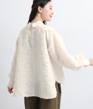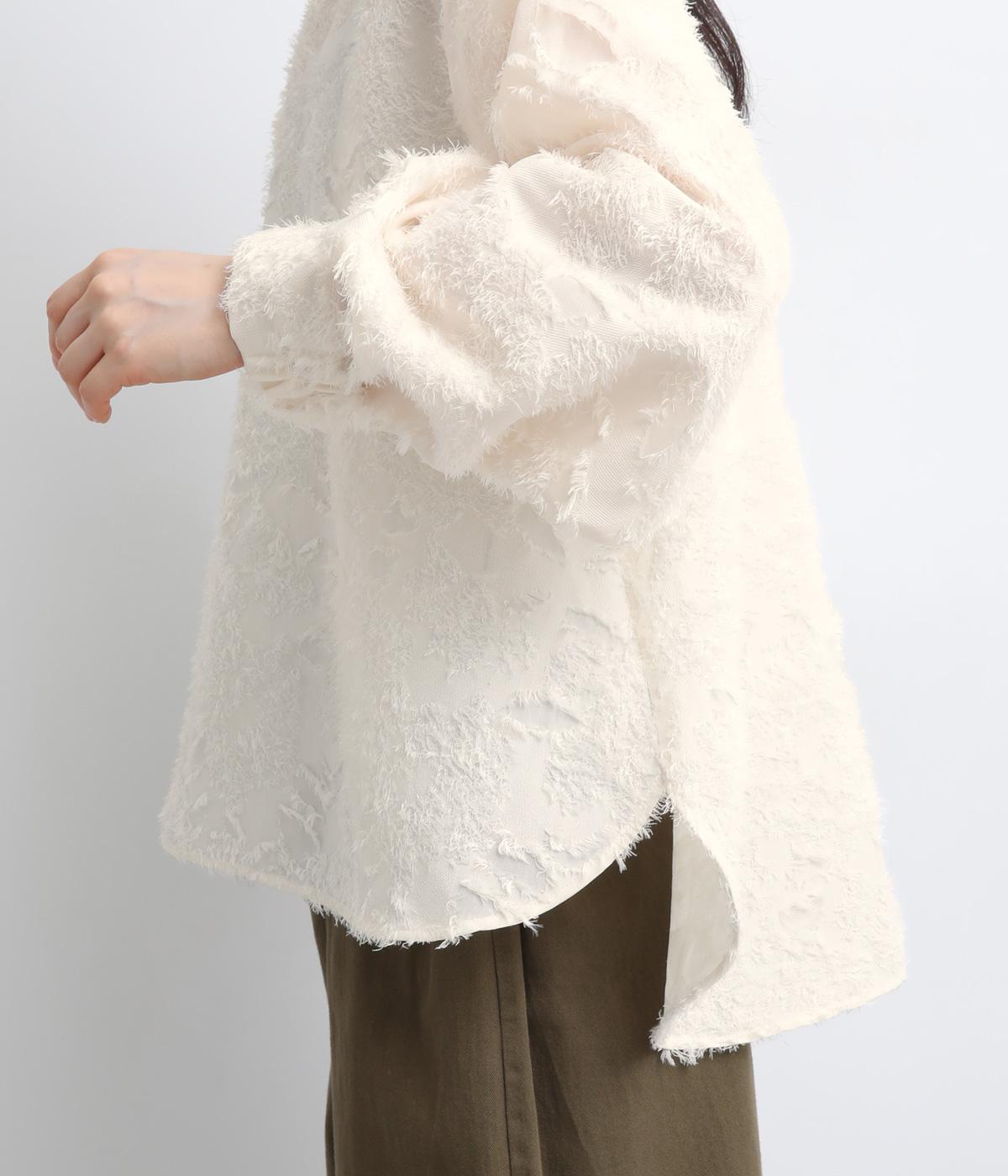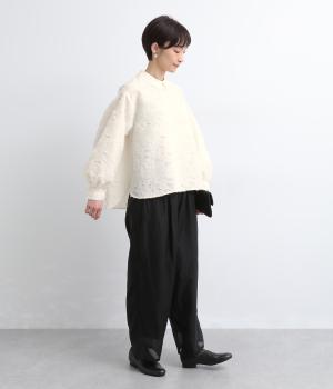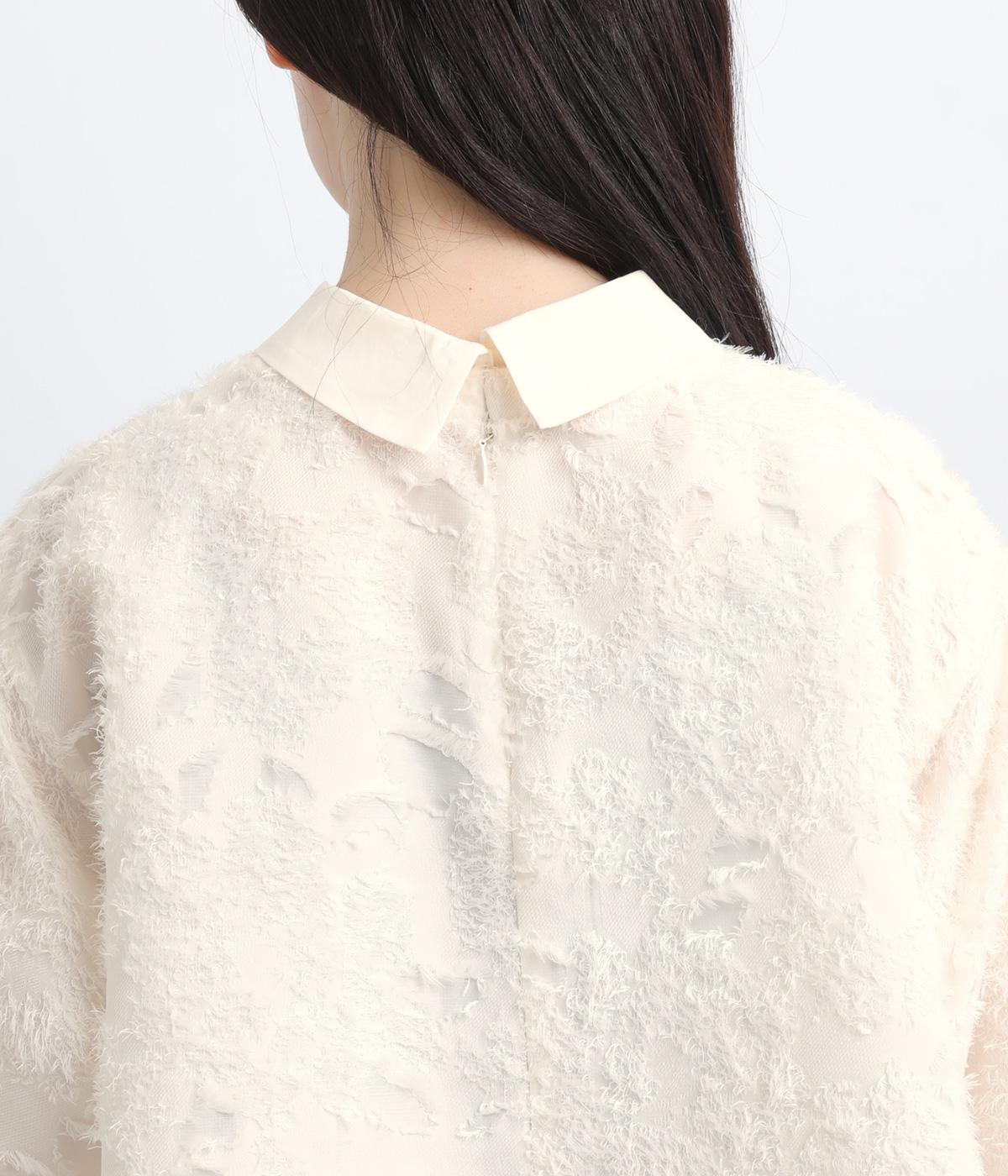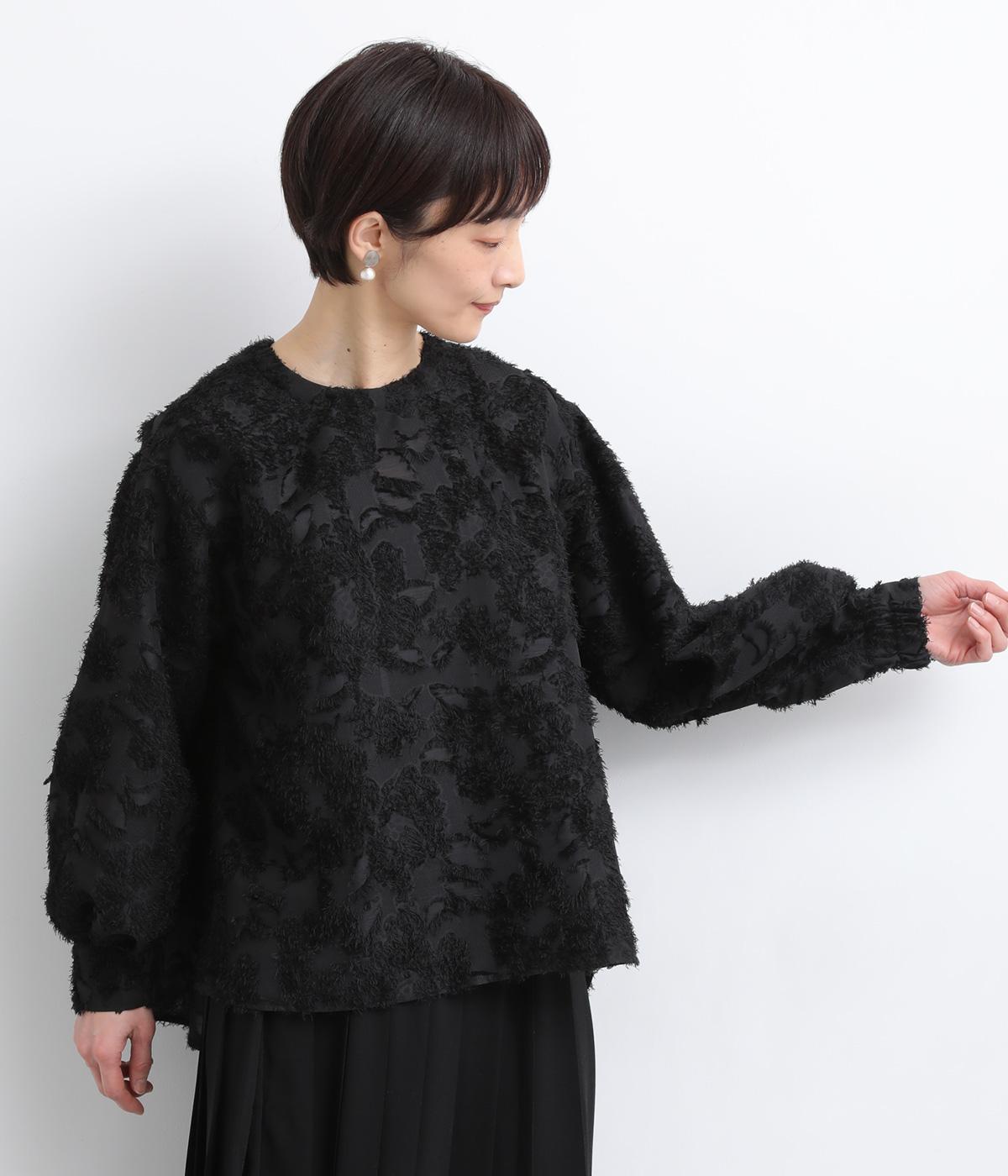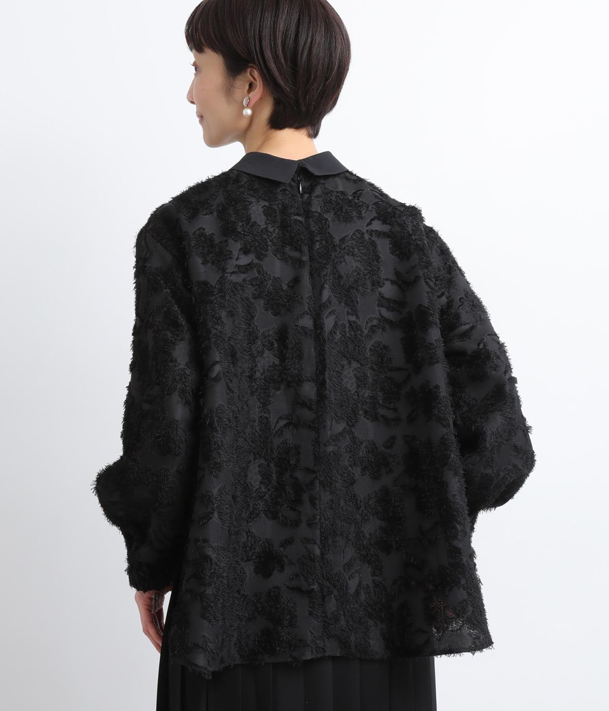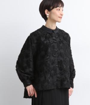 ヴィンテージ感のあるフラワー柄のカットジャカードが、華やかな存在感を放つブラウスです。立体的な柄が装いに奥行きを与えます。取り外し可能な襟つきで、フォーマルな着こなしから、襟をはずした軽やかなスタイルまで幅広く対応。シーンを問わず活躍する一枚です。