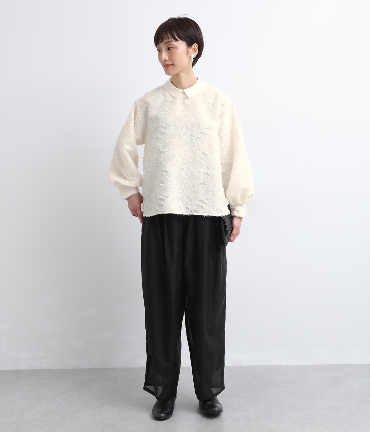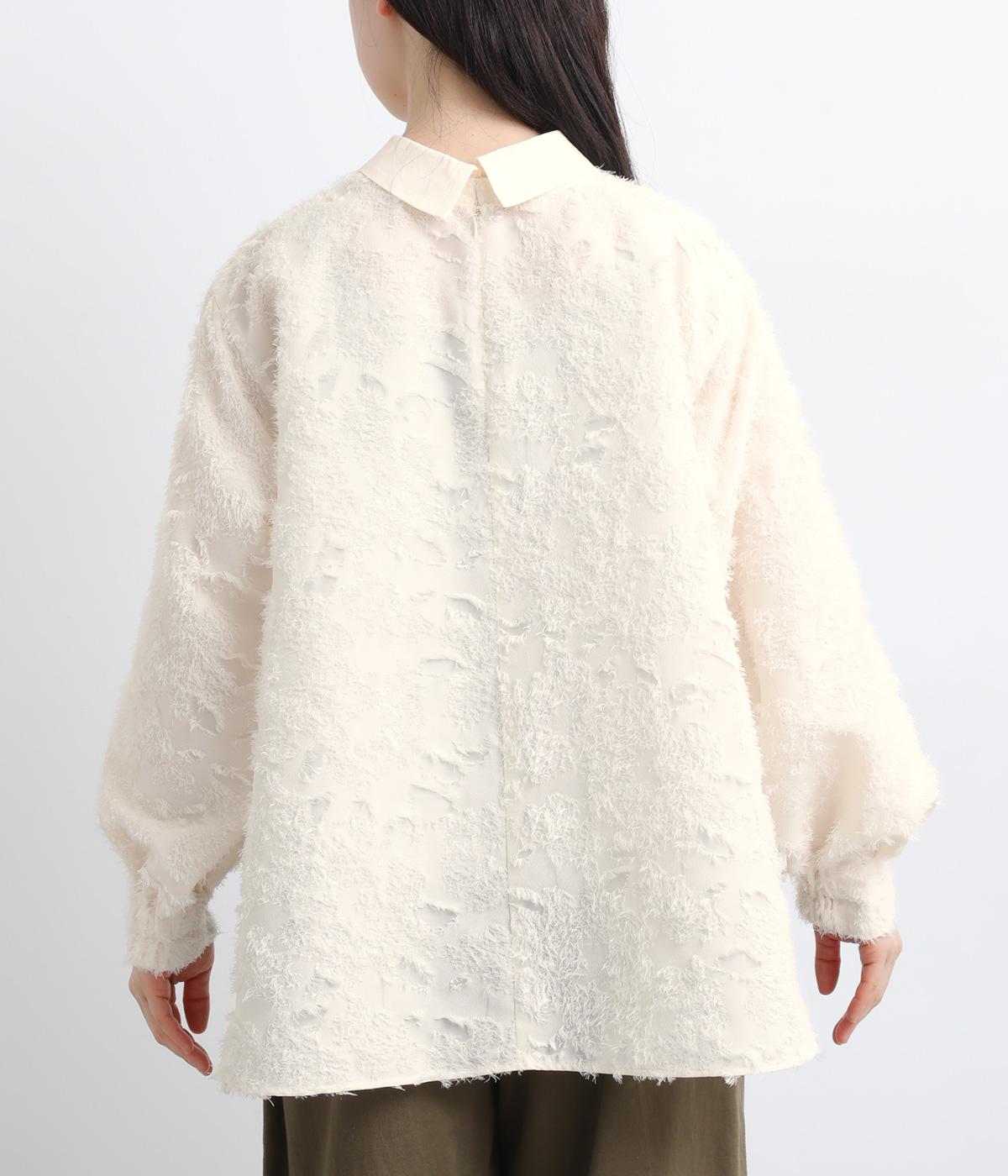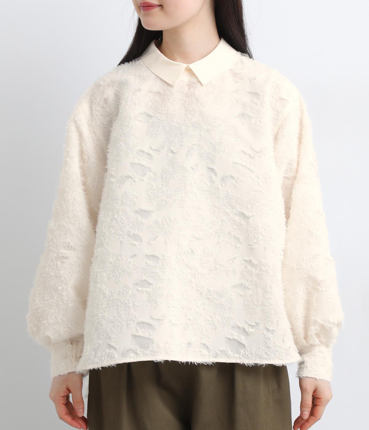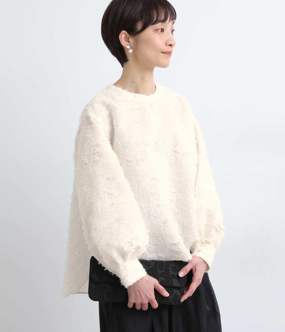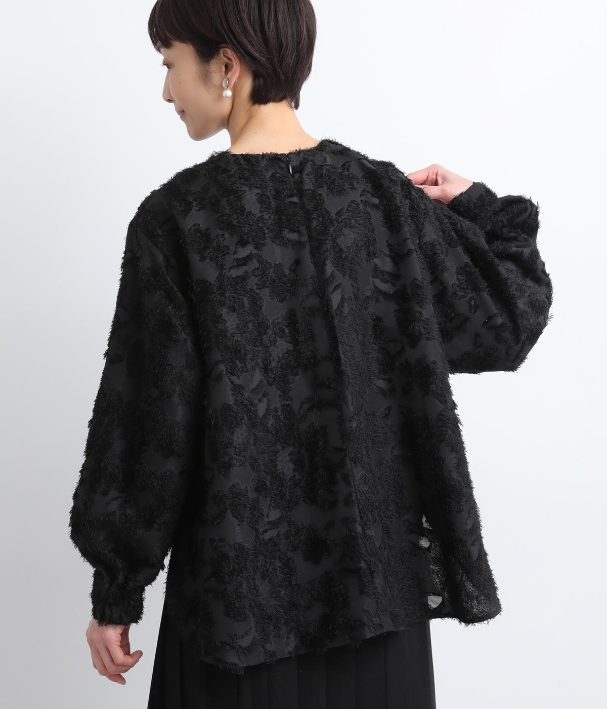 ヴィンテージ感のあるフラワー柄のカットジャカードが、華やかな存在感を放つブラウスです。立体的な柄が装いに奥行きを与えます。取り外し可能な襟つきで、フォーマルな着こなしから、襟をはずした軽やかなスタイルまで幅広く対応。シーンを問わず活躍する一枚です。
