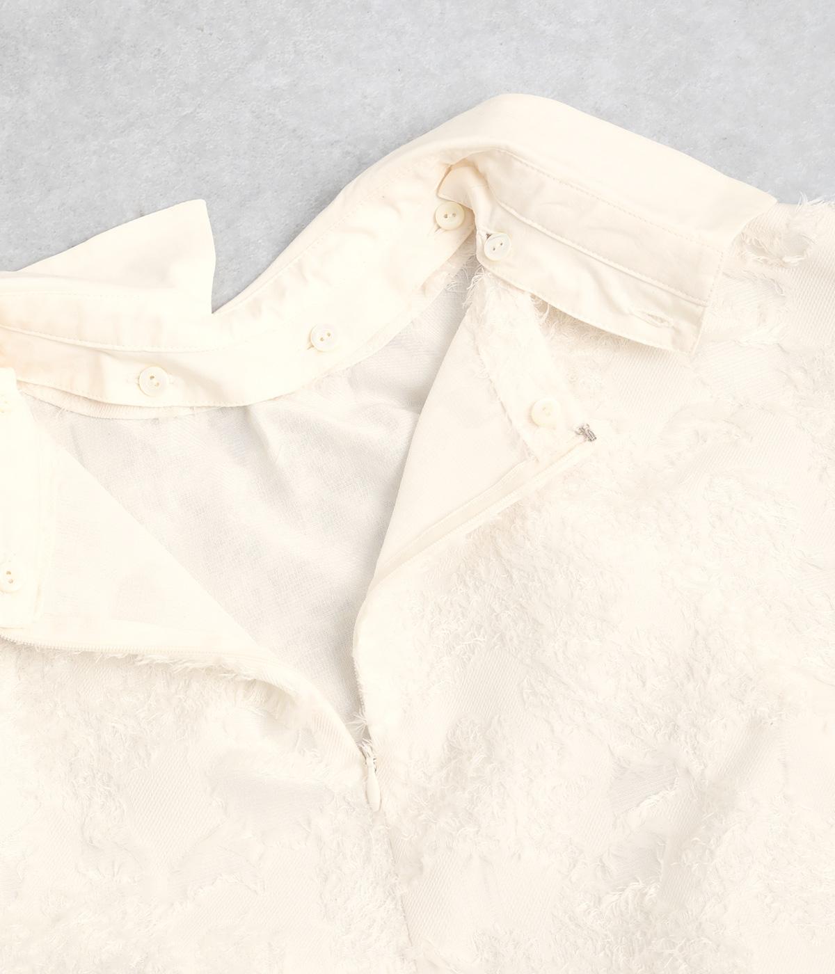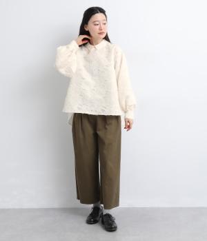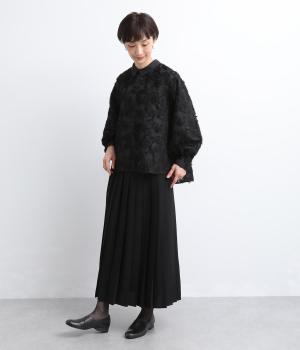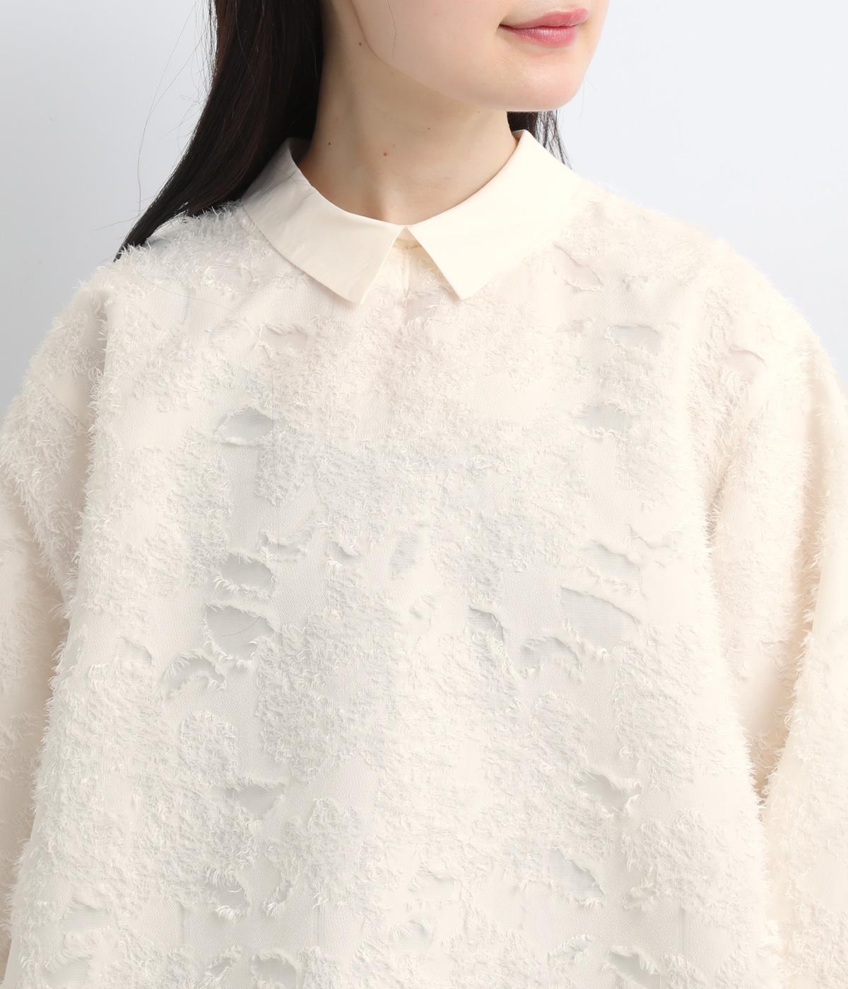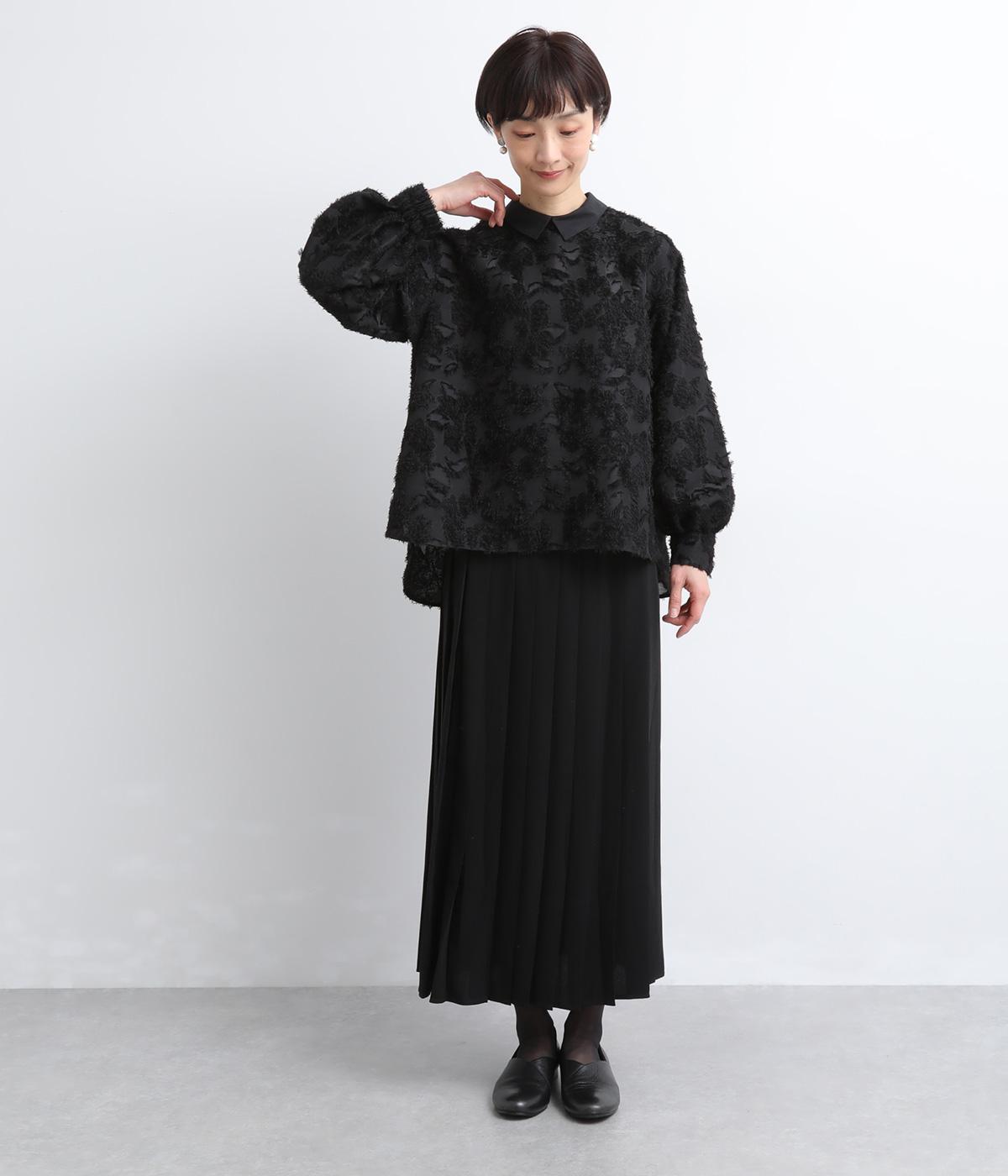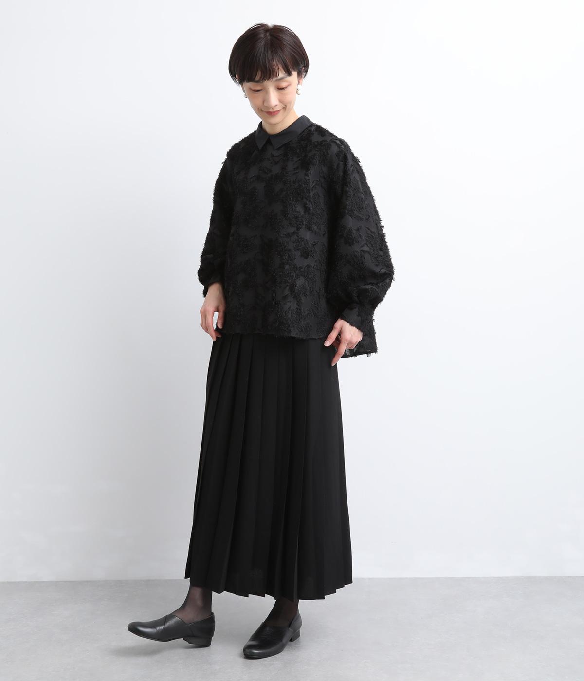 ヴィンテージ感のあるフラワー柄のカットジャカードが、華やかな存在感を放つブラウスです。立体的な柄が装いに奥行きを与えます。取り外し可能な襟つきで、フォーマルな着こなしから、襟をはずした軽やかなスタイルまで幅広く対応。シーンを問わず活躍する一枚です。