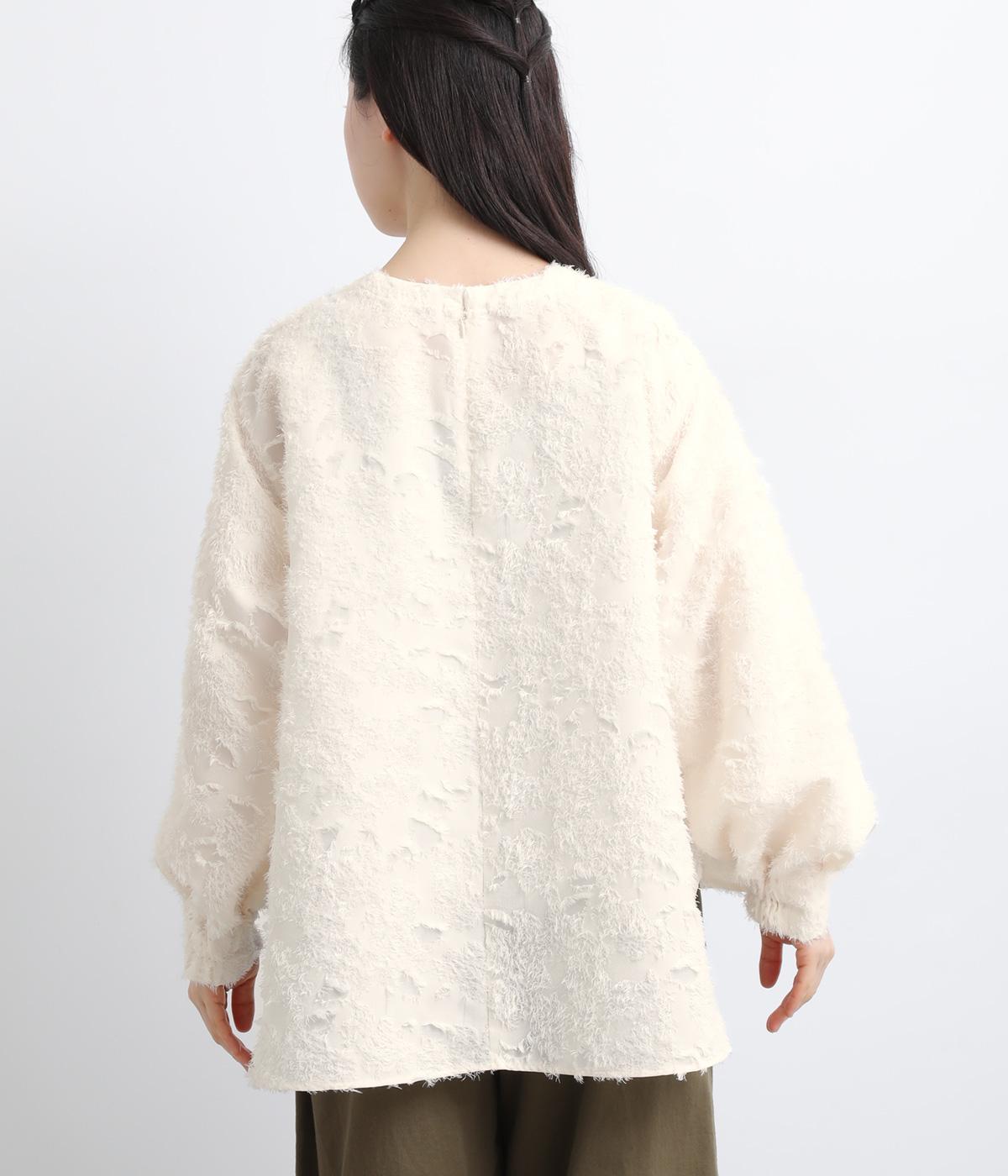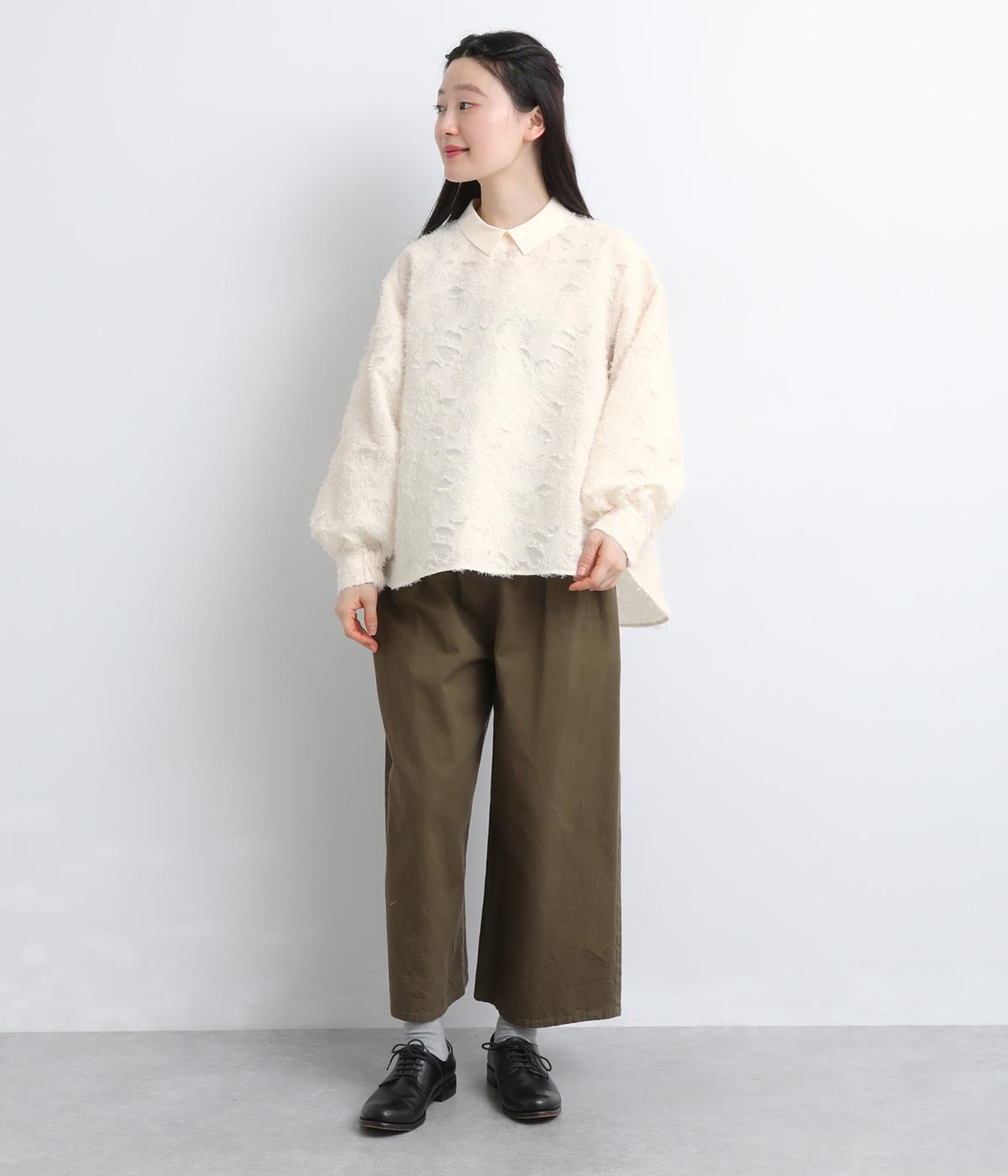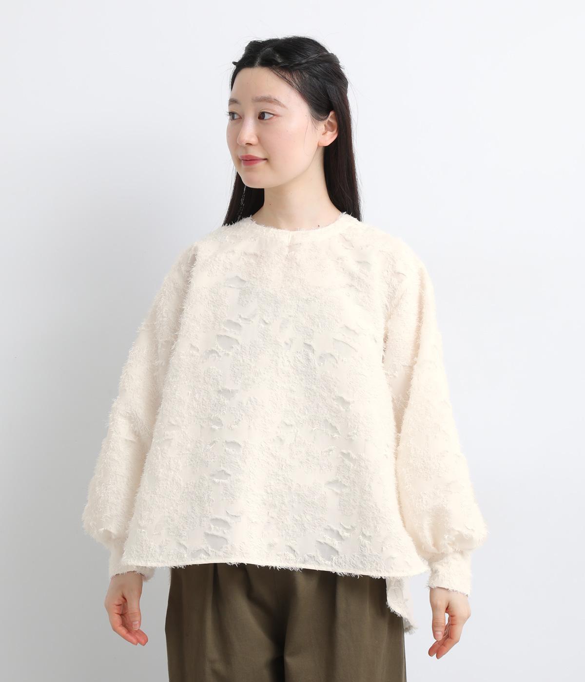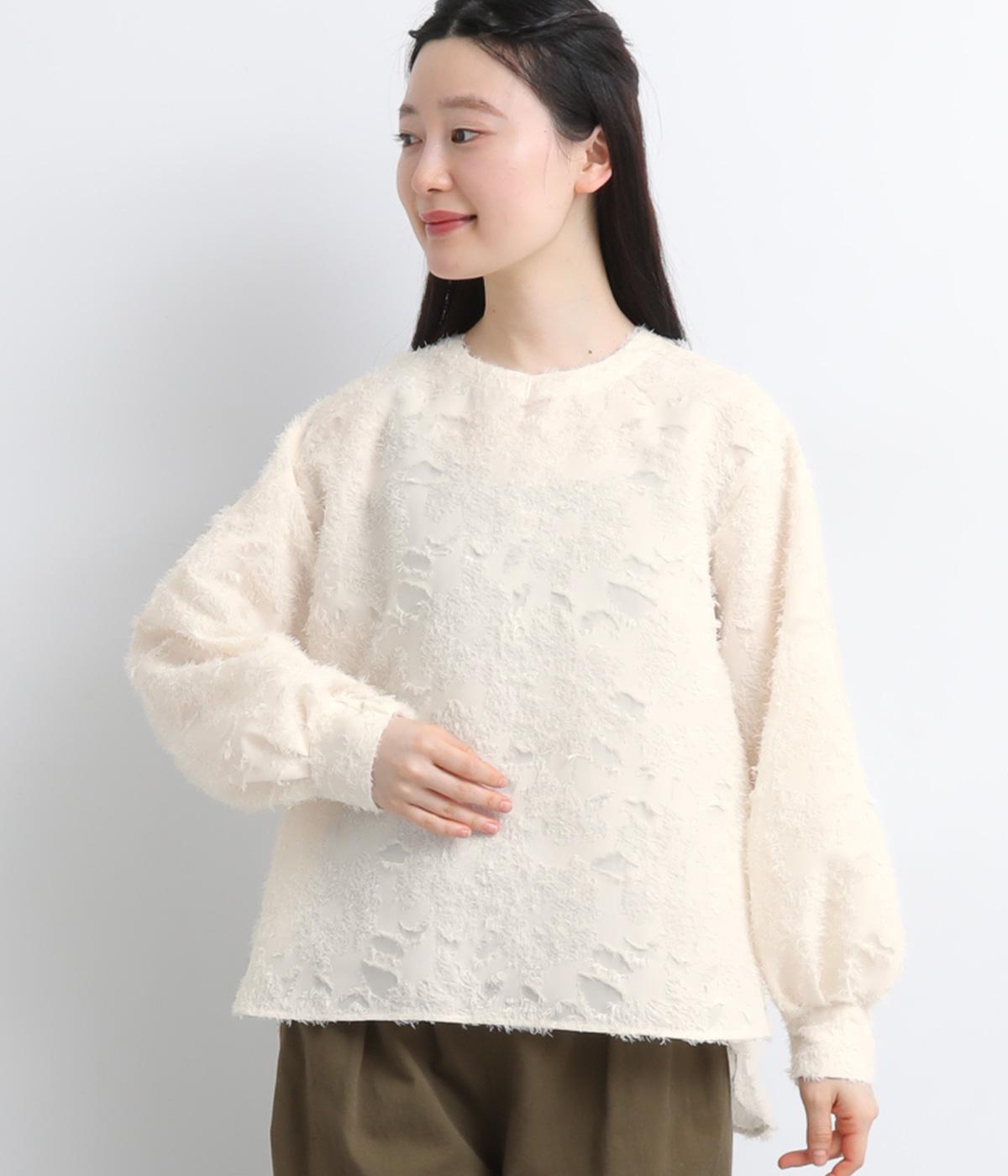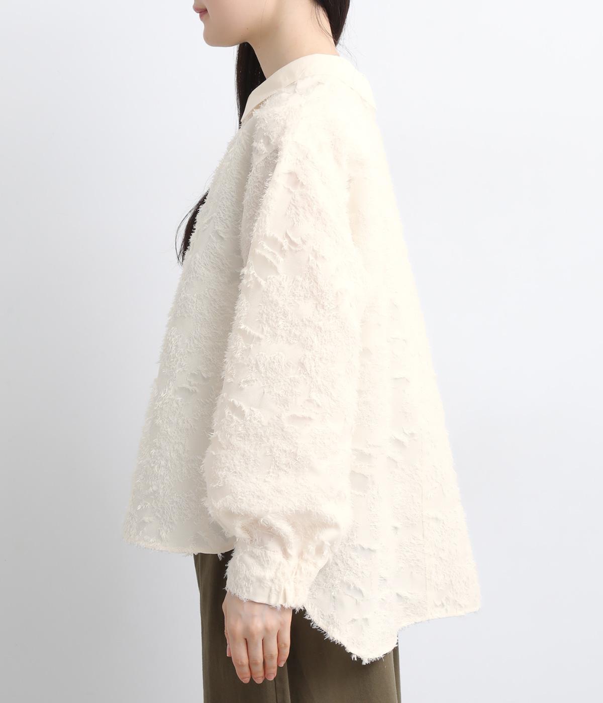 ヴィンテージ感のあるフラワー柄のカットジャカードが、華やかな存在感を放つブラウスです。立体的な柄が装いに奥行きを与えます。取り外し可能な襟つきで、フォーマルな着こなしから、襟をはずした軽やかなスタイルまで幅広く対応。シーンを問わず活躍する一枚です。