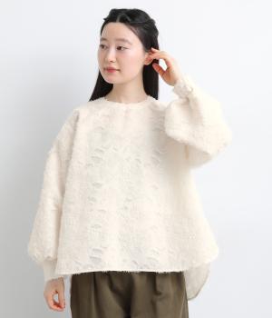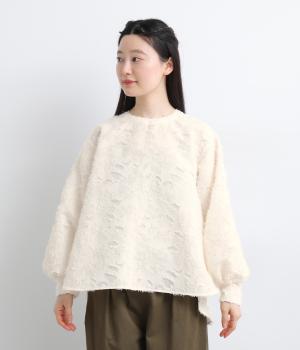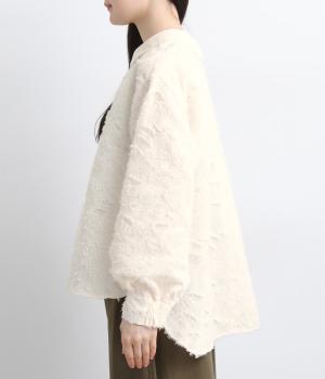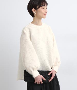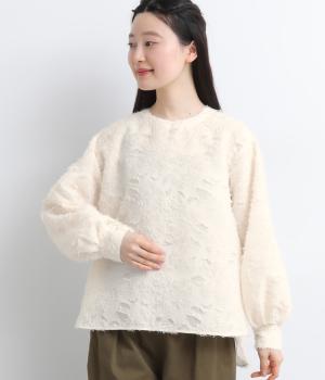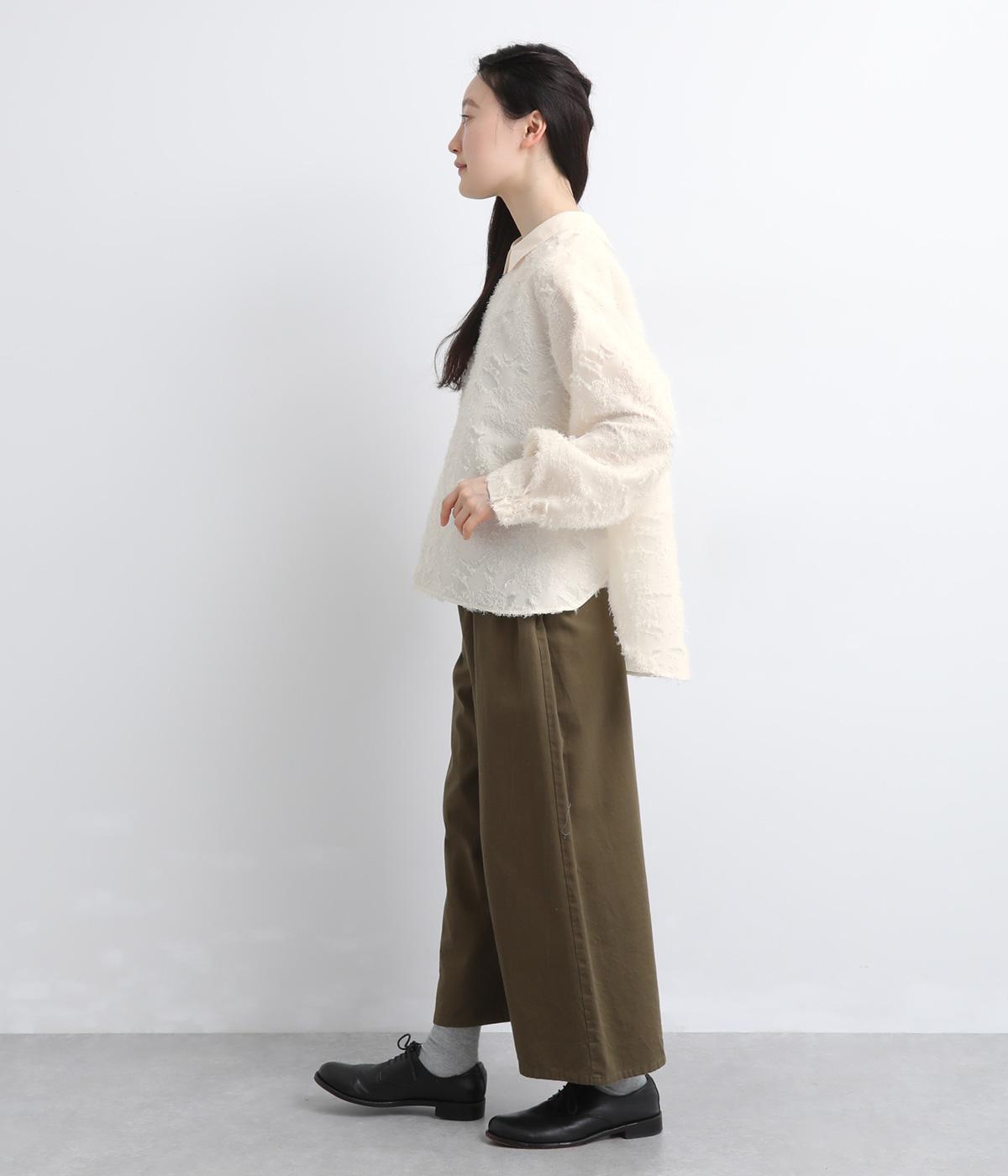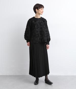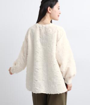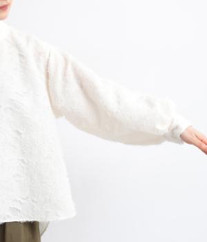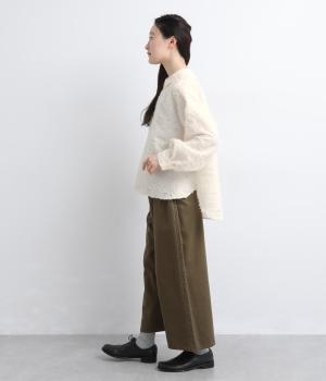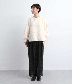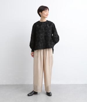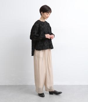 ヴィンテージ感のあるカットジャカード生地を使用しました。表面はふんわりとした立体的な風合いで、やさしい表情を生み出します。裏側はさらりと肌ばなれのよい織りで、快適な着心地に。光沢感が上品さを添え、シワになりにくく手洗いできる扱いやすさも魅力です。