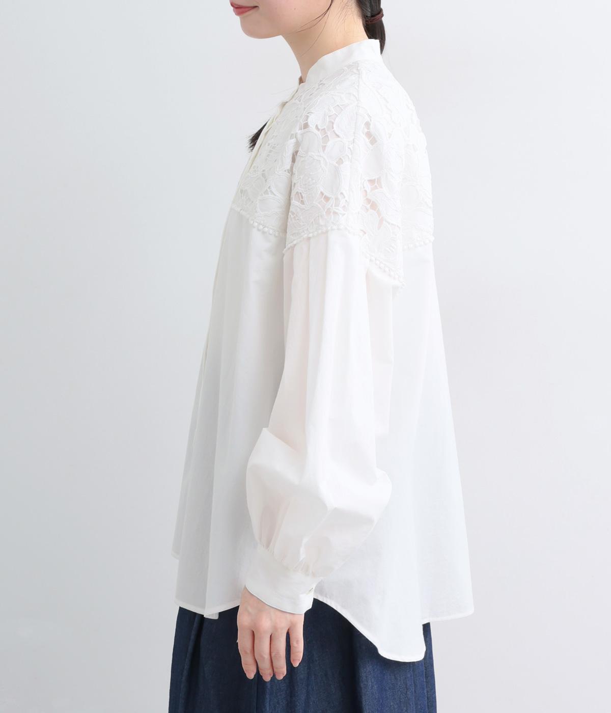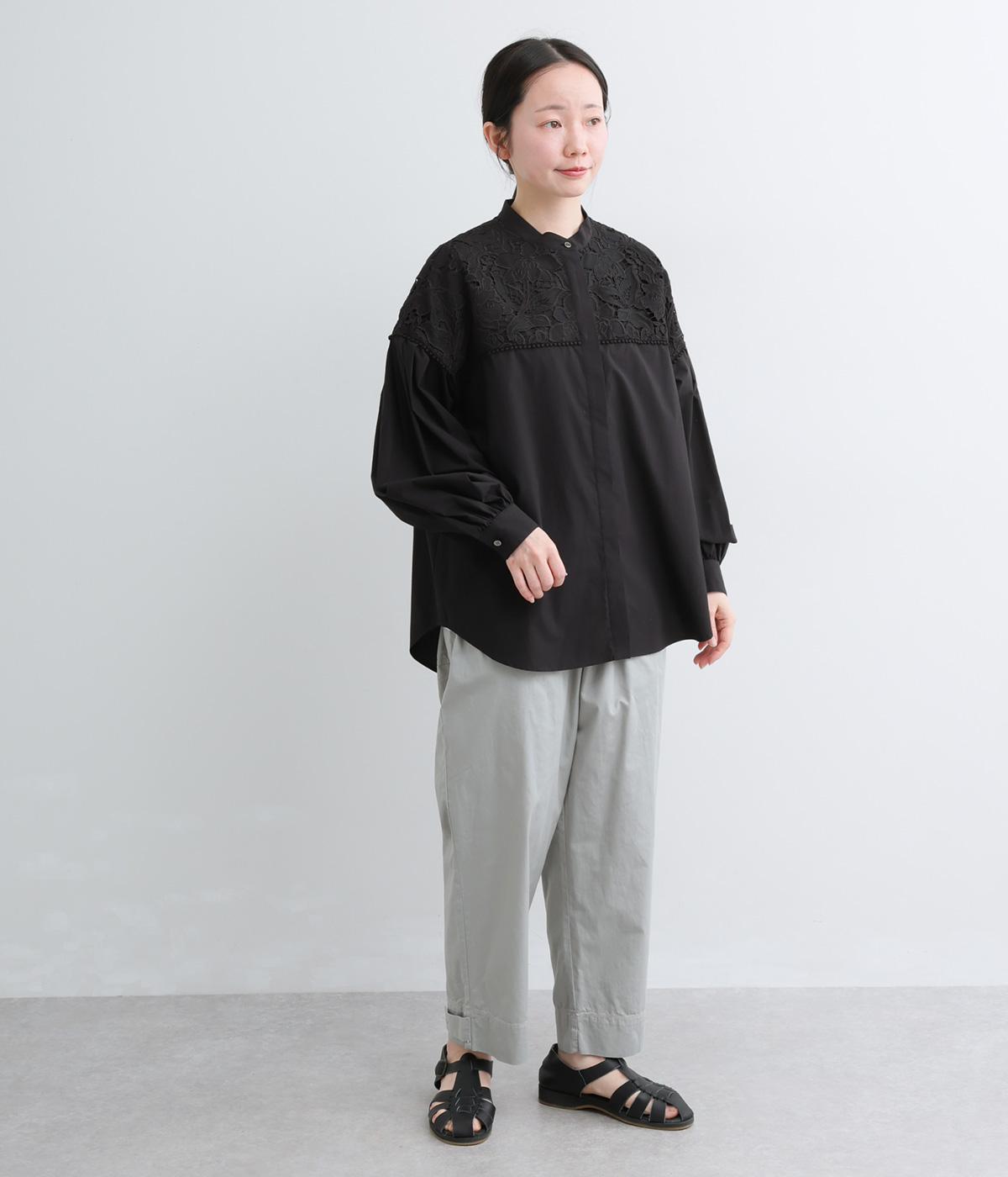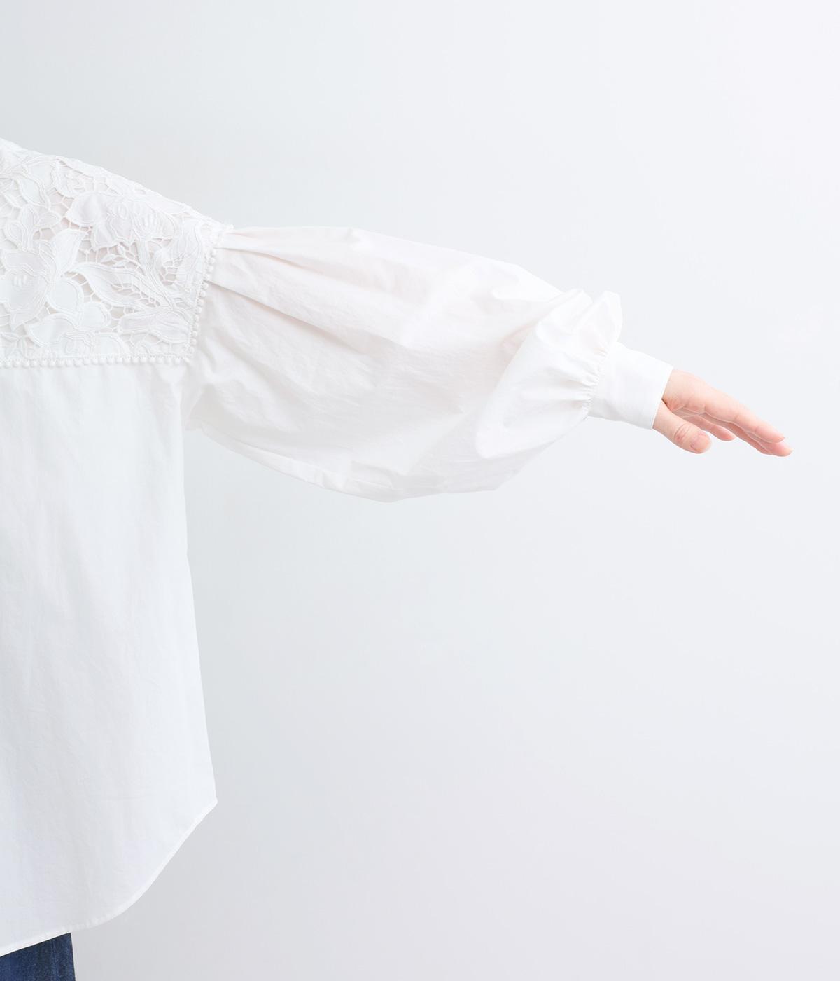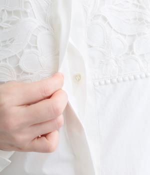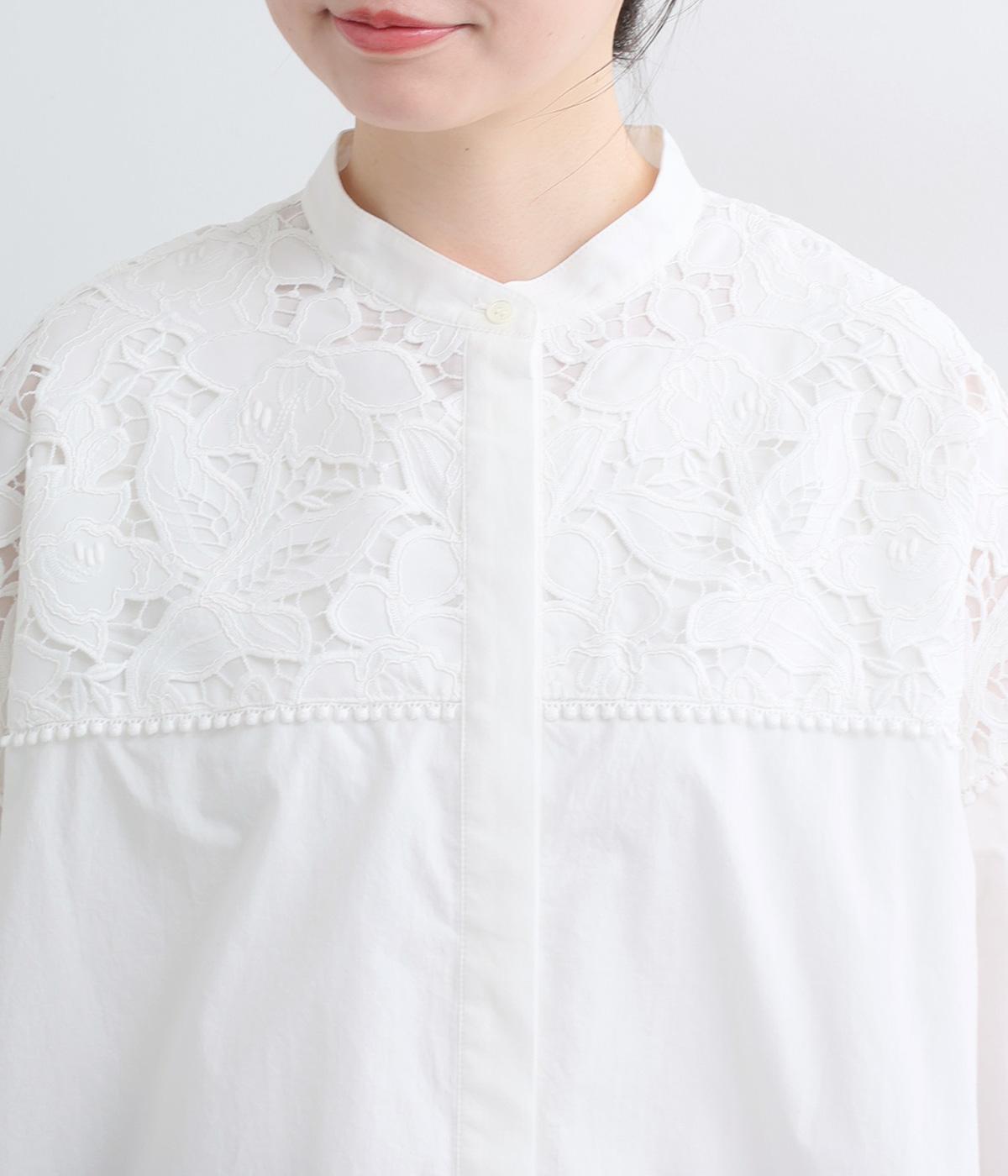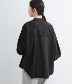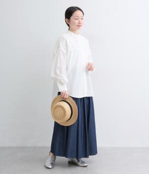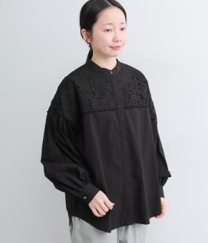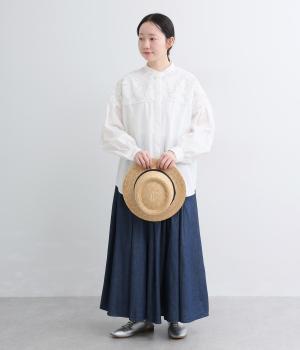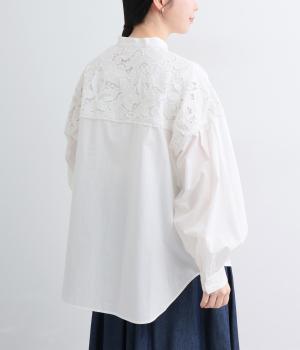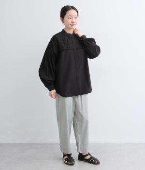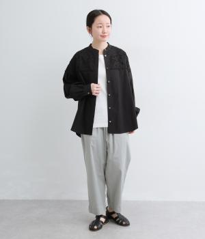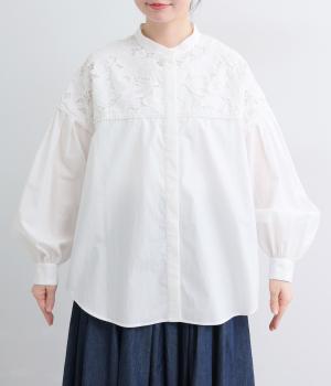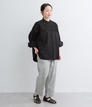 身頃部分には軽やかなハリが特徴のコットンタイプライターを。ヨーク部分には刺しゅう生地を配しています。全体的にさらりとした肌触りで、華やかながらも快適な着心地です。
