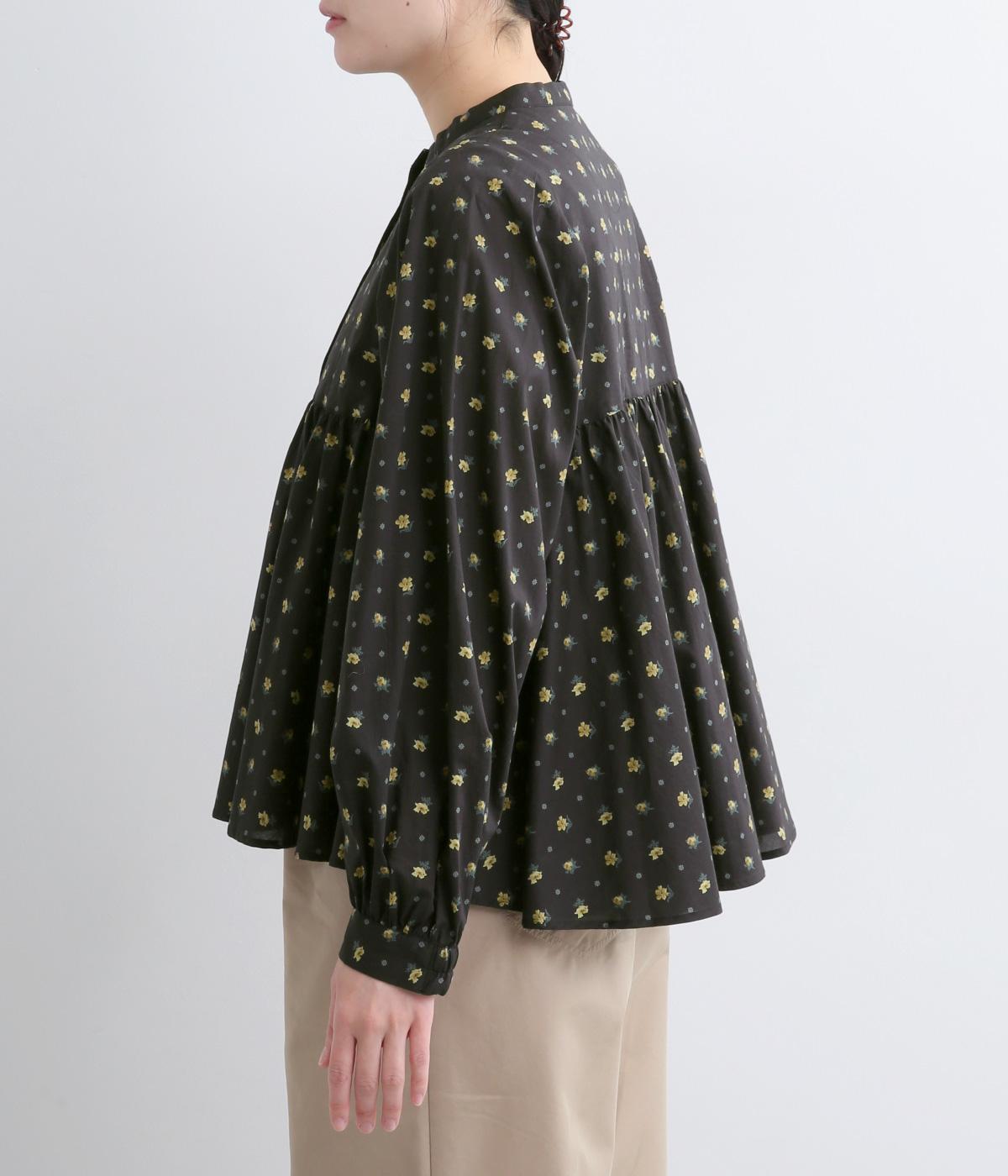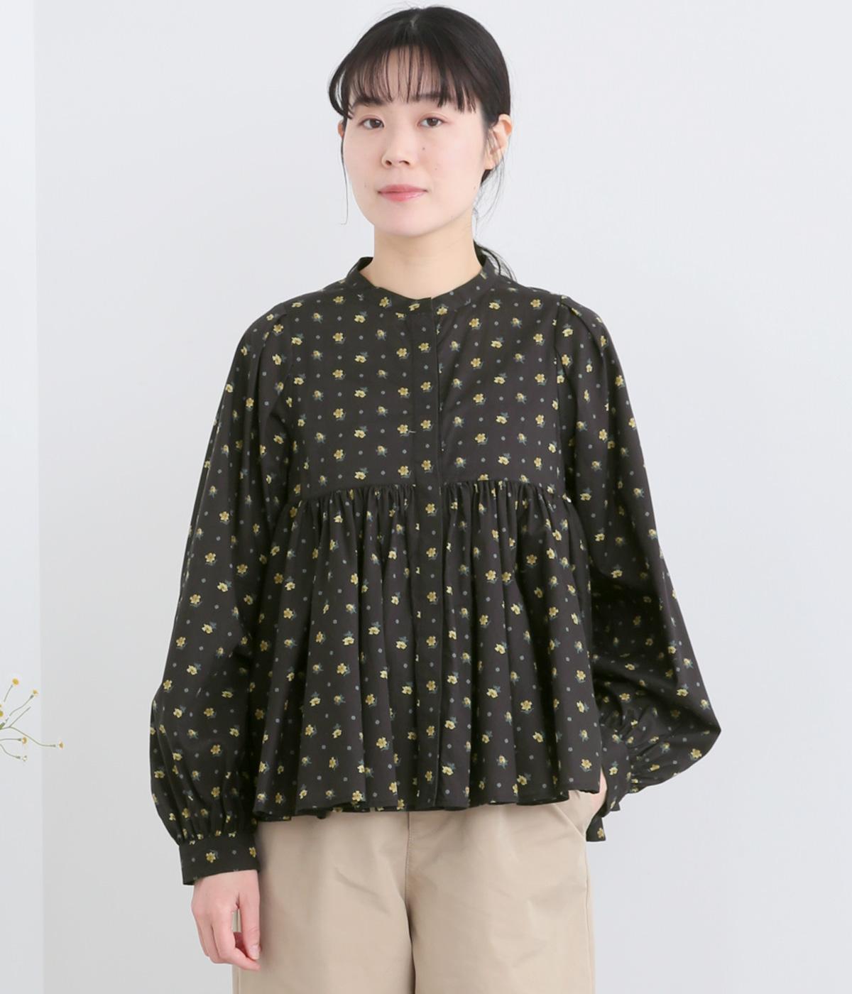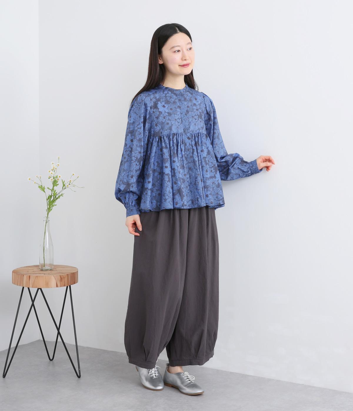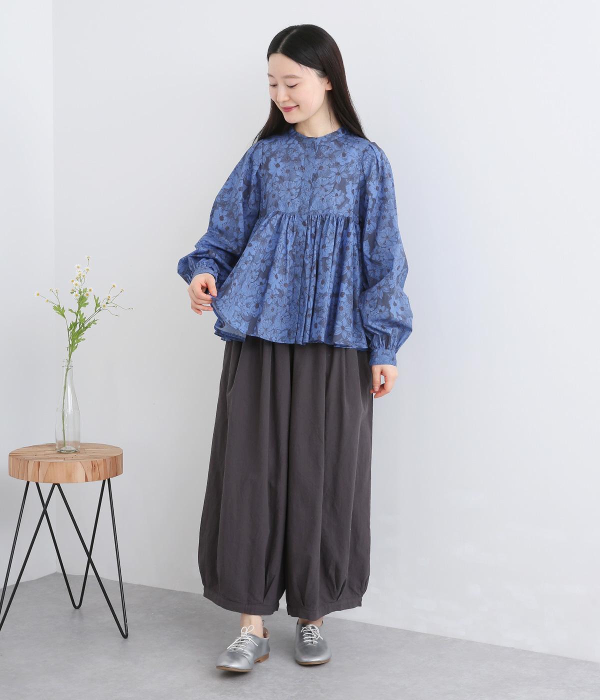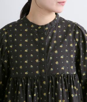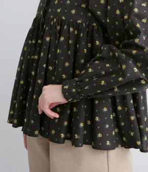 モデルのkazumiさんとのコラボレーションアイテム。リバティプリント生地を贅沢に用いたブラウスです。切り替え下にたっぷりとほどこしたギャザーがふんわりとしたシルエットを描き、華やかさを添えています。
