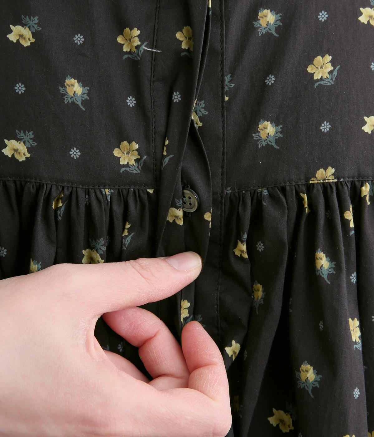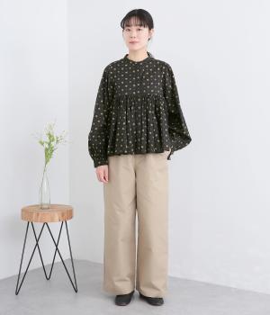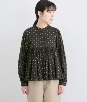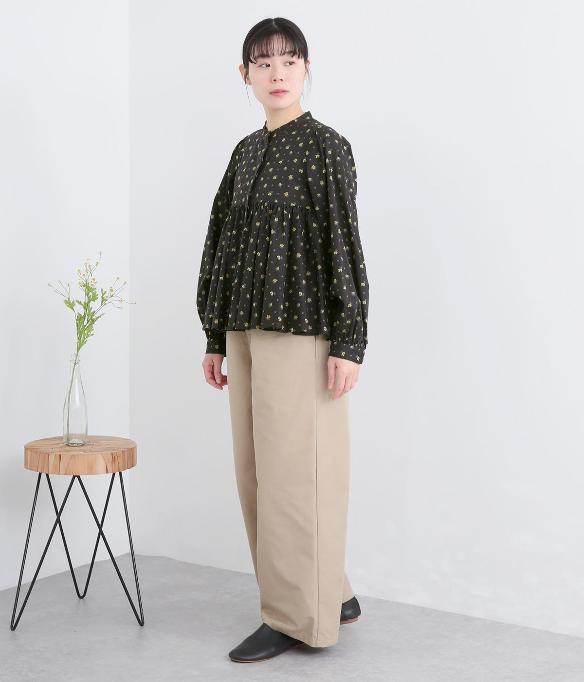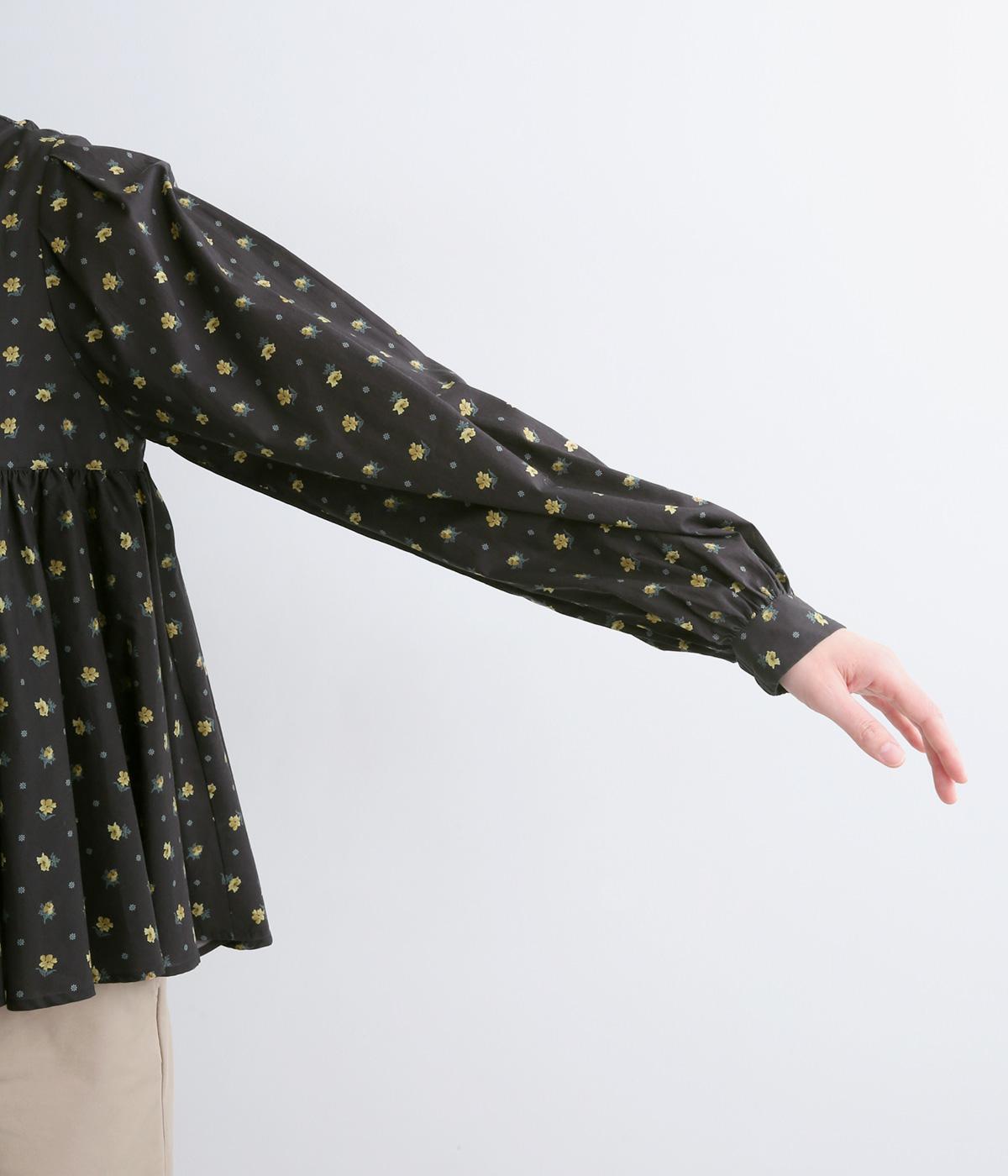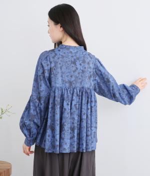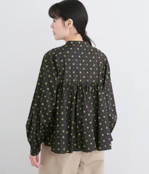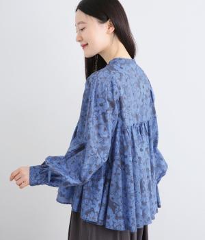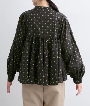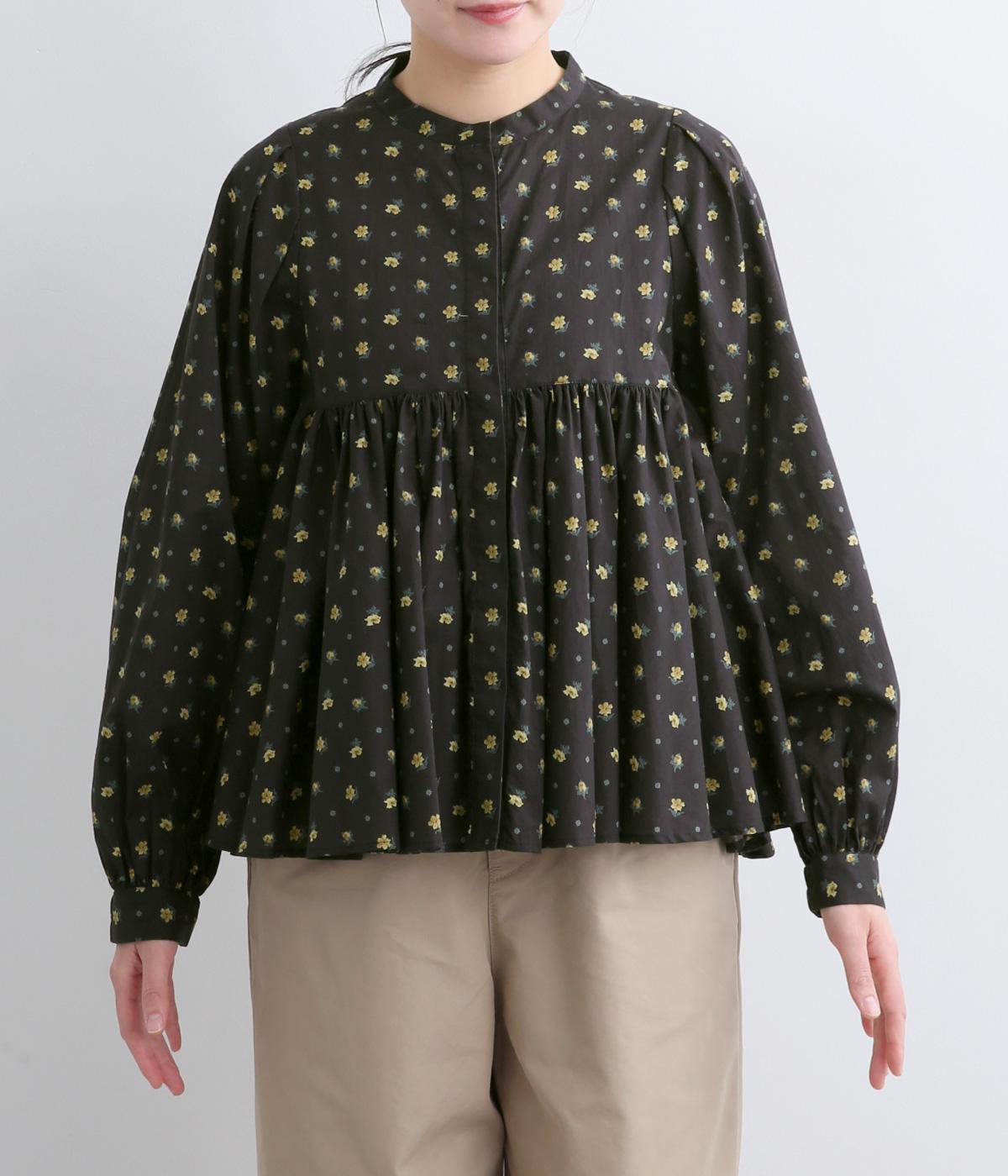 モデルのkazumiさんとのコラボレーションアイテム。リバティプリント生地を贅沢に用いたブラウスです。切り替え下にたっぷりとほどこしたギャザーがふんわりとしたシルエットを描き、華やかさを添えています。