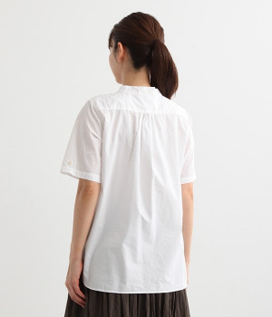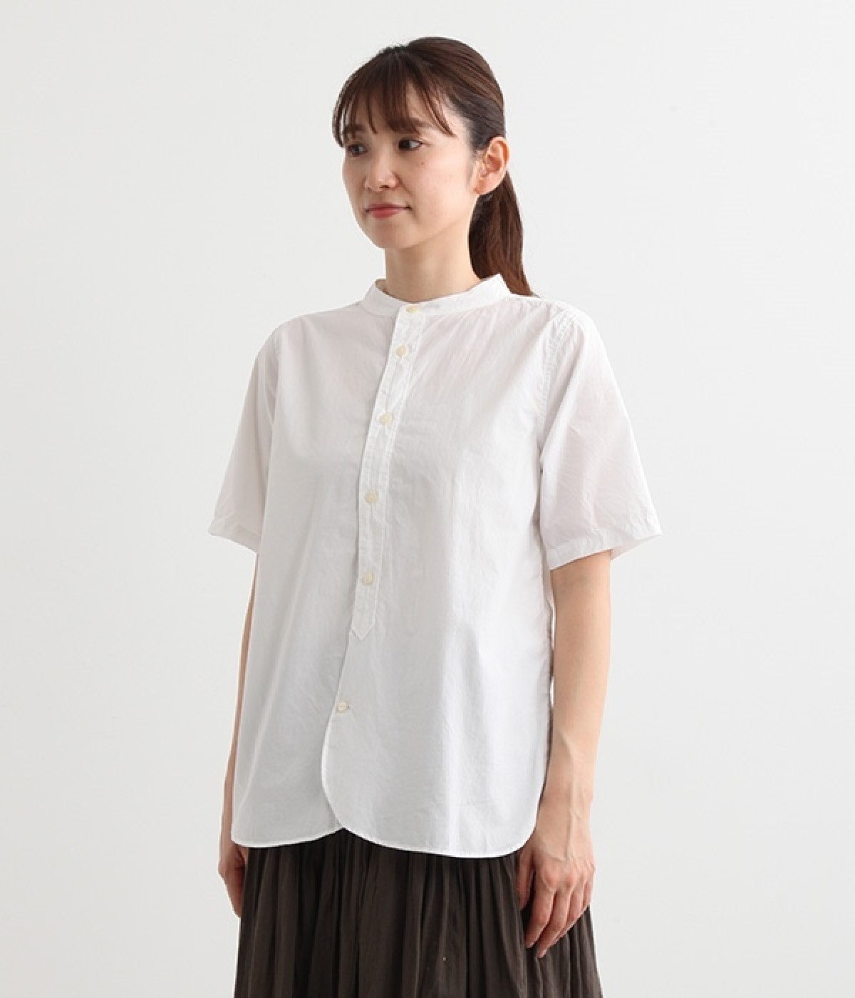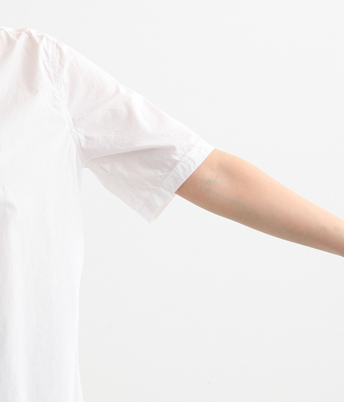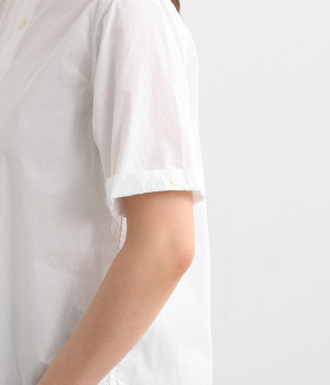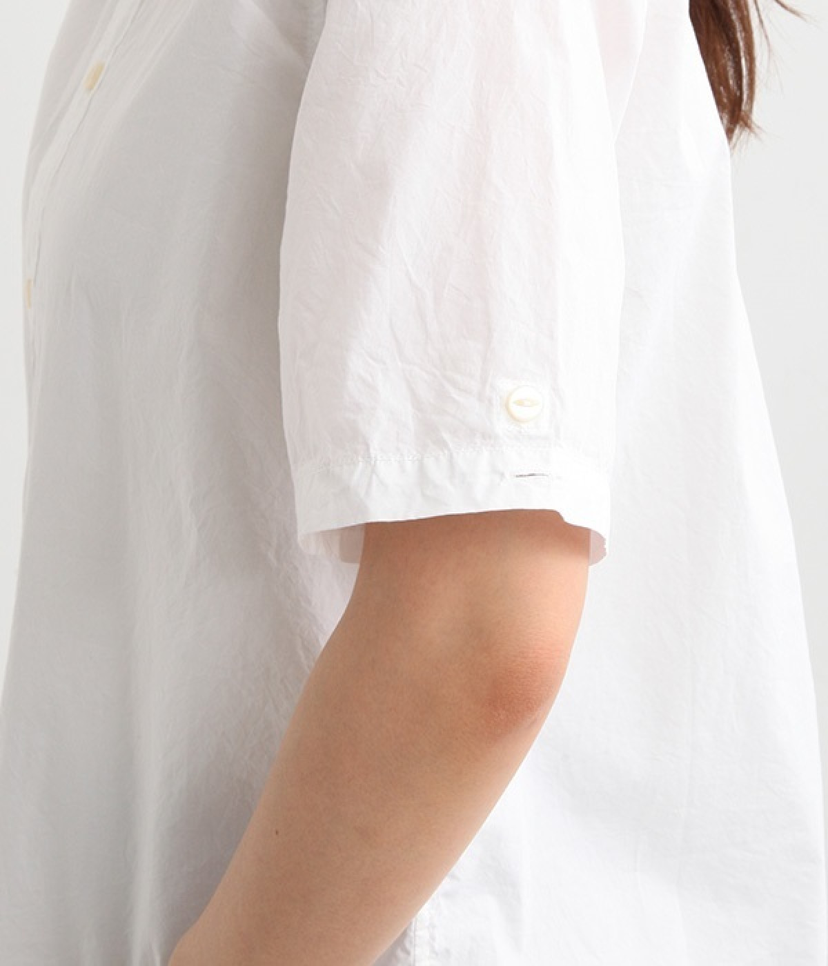しなやかでハリ・コシのあるタイプライター生地で仕立てた半袖シャツです。ほどよいゆとりがありながらも、すっきりと見えるシルエットが秀逸な一枚。すっと立ち上がったスタンド襟が大人っぽい印象に見せてくれます。裾をきちんとインすると、少しきれいめな装いにも対応可能。袖口を折り返したアレンジもおすすめです。