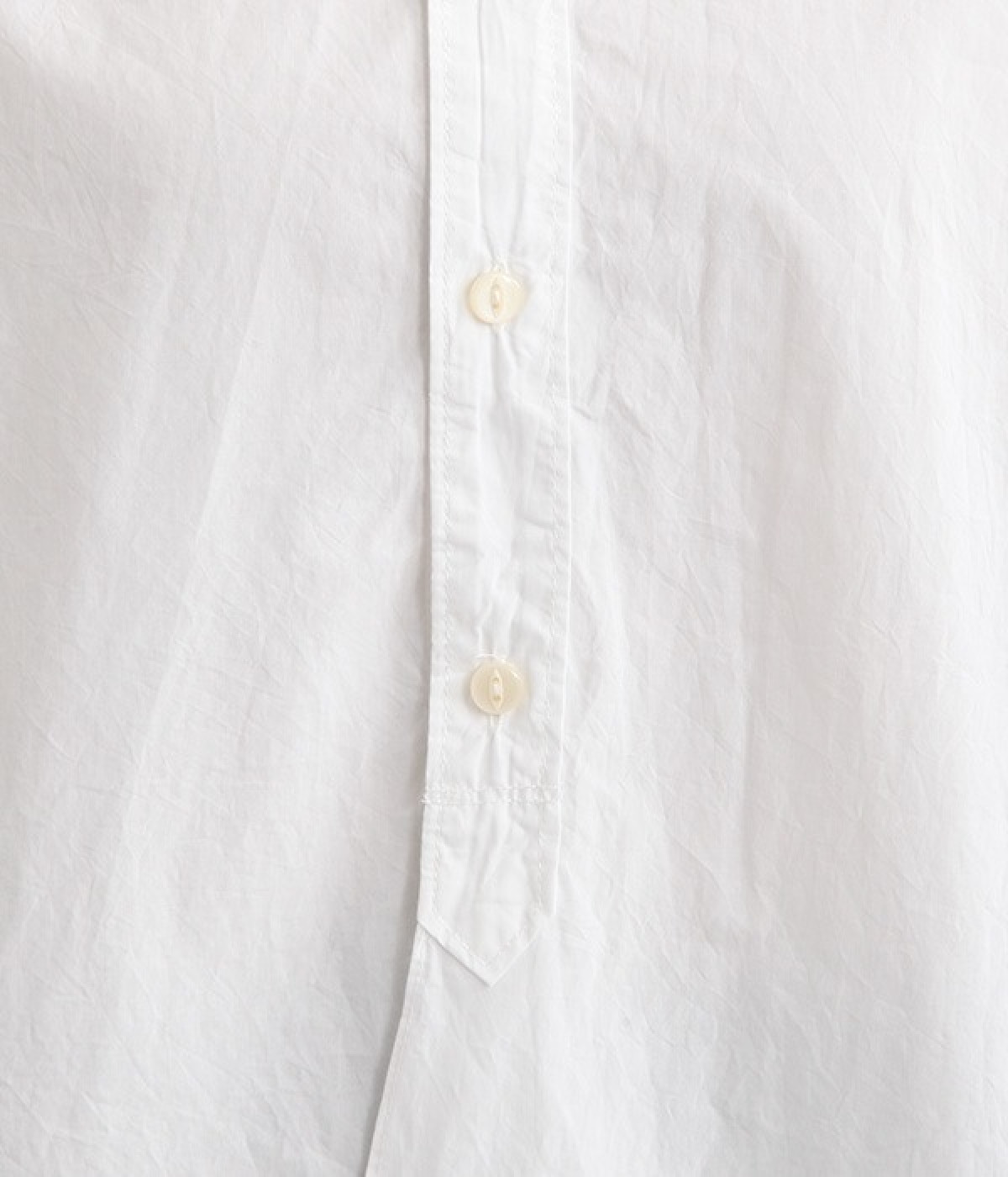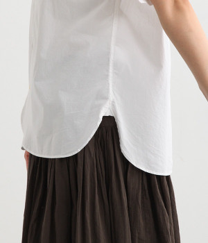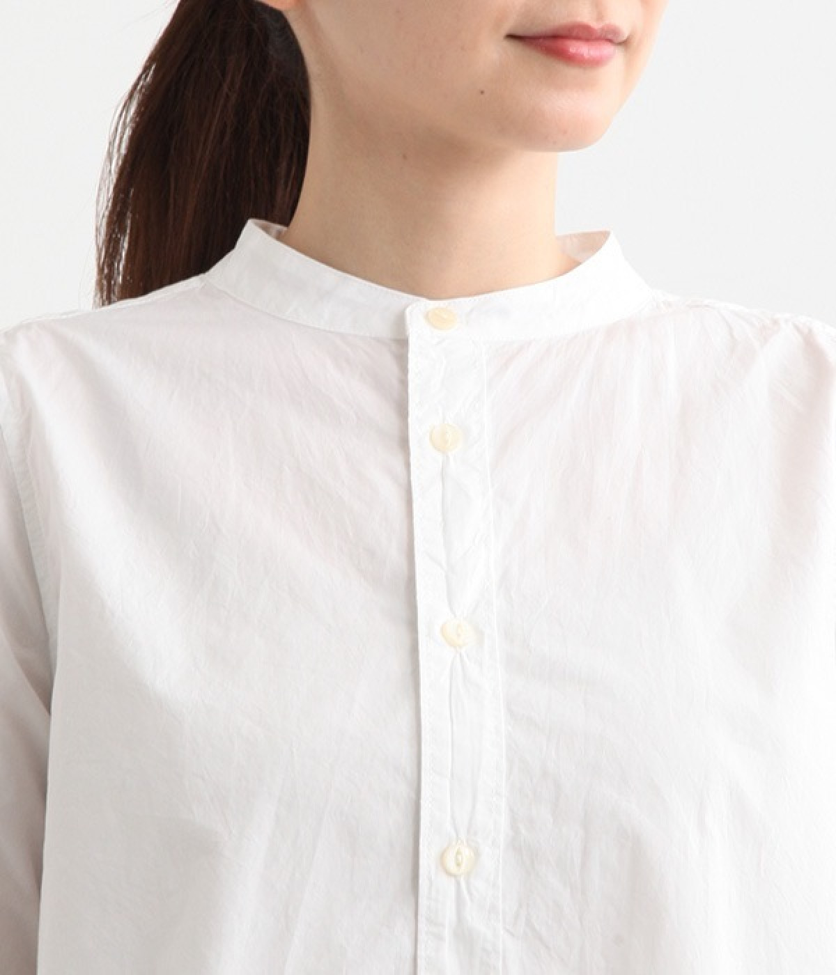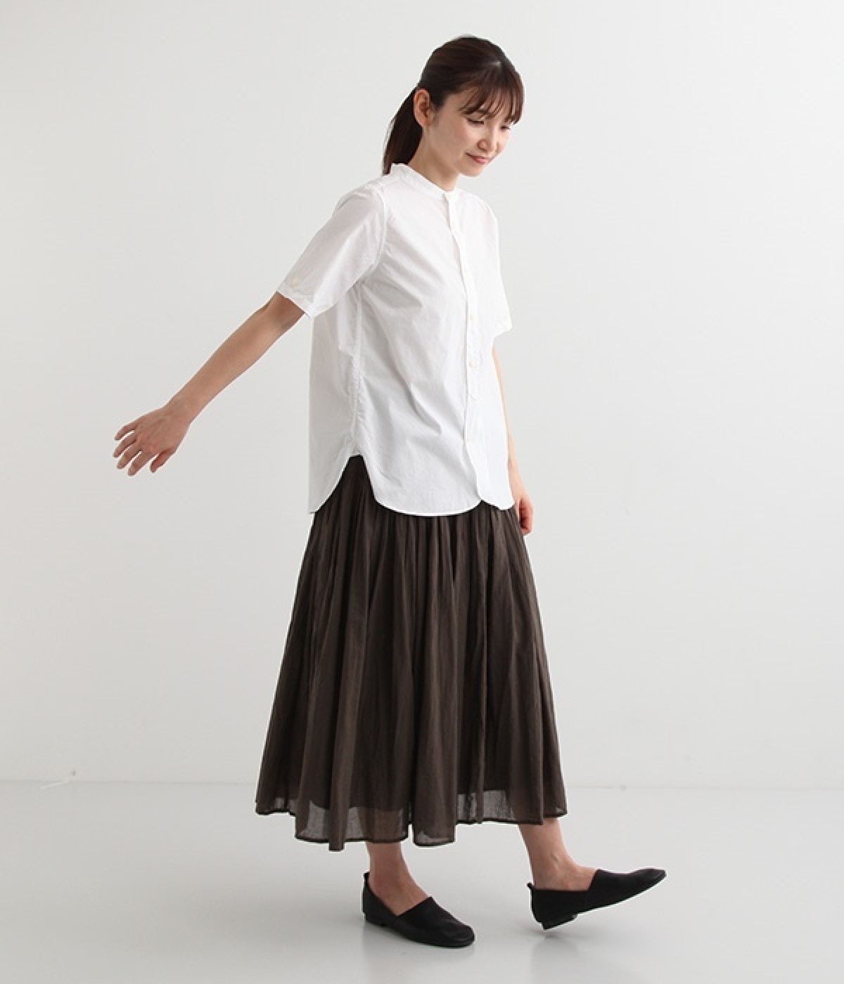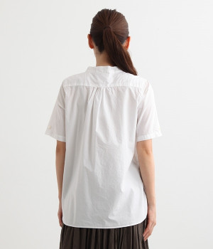 しなやかでハリ・コシのあるタイプライター生地で仕立てた半袖シャツです。ほどよいゆとりがありながらも、すっきりと見えるシルエットが秀逸な一枚。すっと立ち上がったスタンド襟が大人っぽい印象に見せてくれます。裾をきちんとインすると、少しきれいめな装いにも対応可能。袖口を折り返したアレンジもおすすめです。