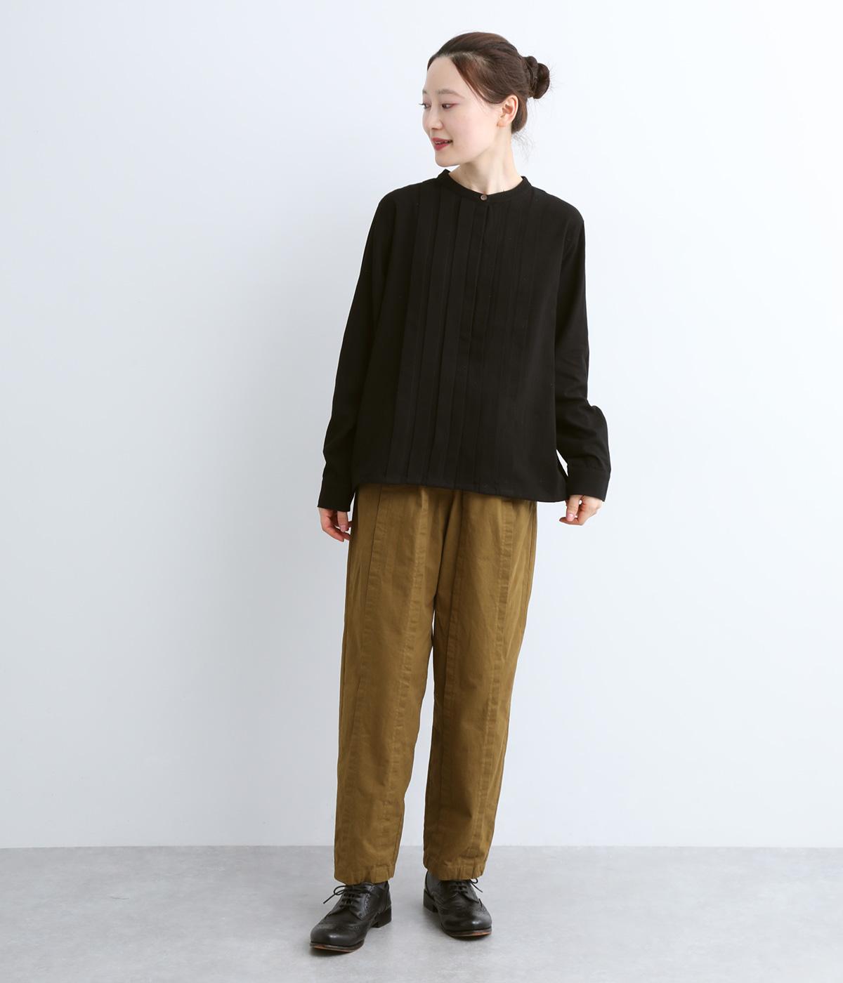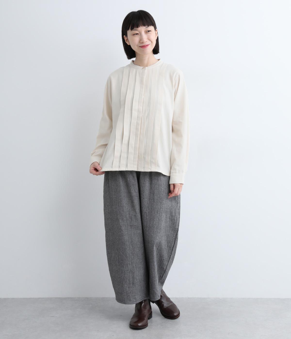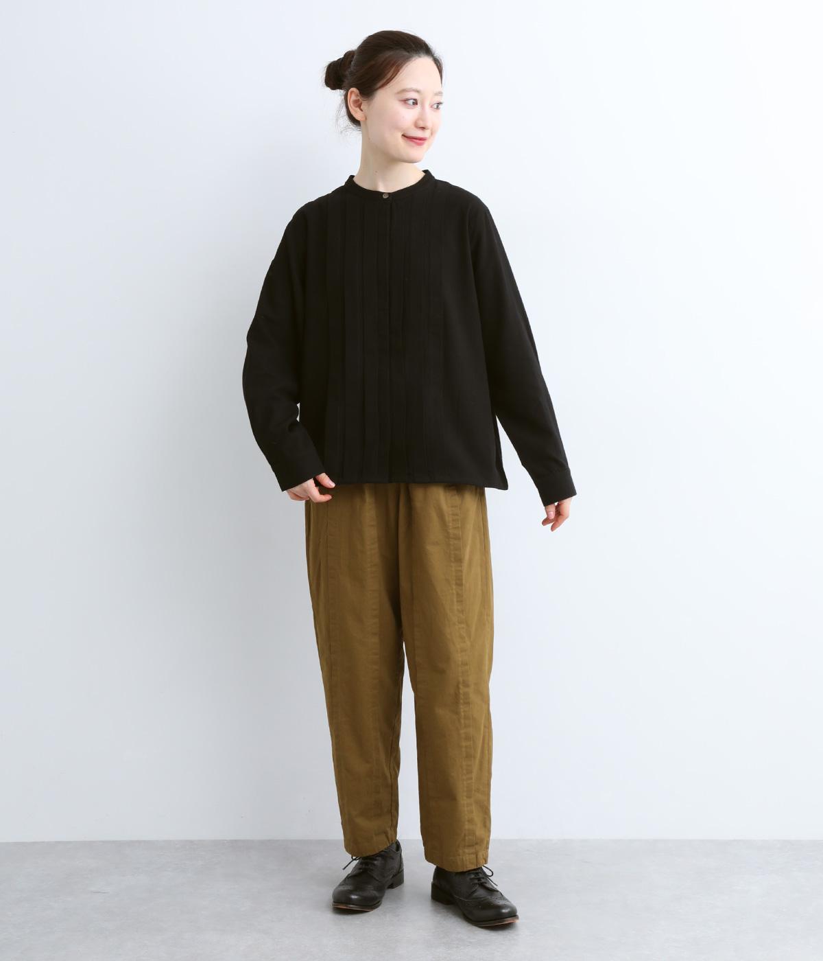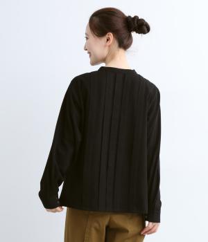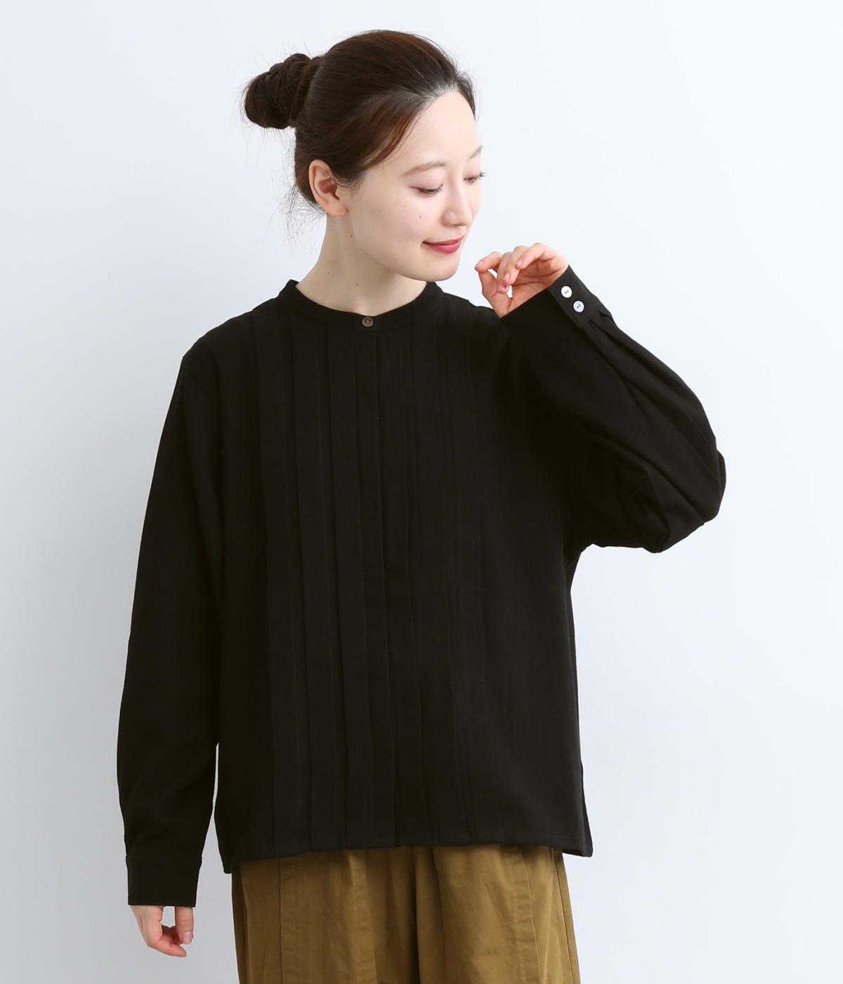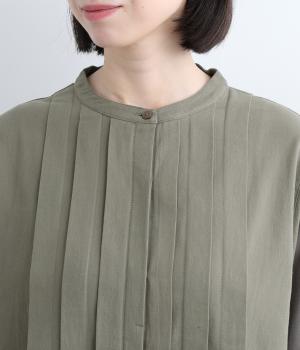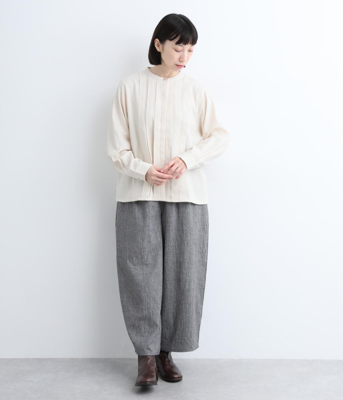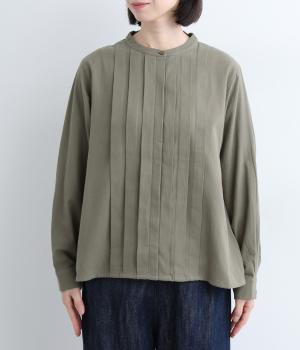 シンプルなスタンドカラーブラウスのフロントにプリーツ加工を施し、自然な奥行きを持たせました。太めのひだは、上半身の体型カバーにも効果を発揮。プリーツ以外は無駄をはぶいた洗練されたデザインで、スタイリッシュに着こなせます。