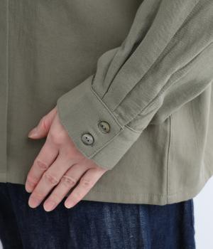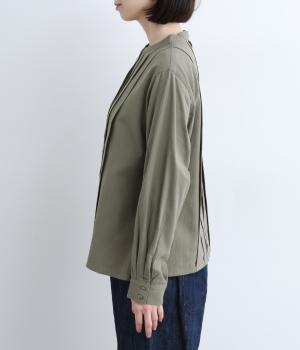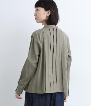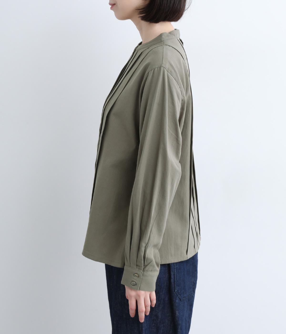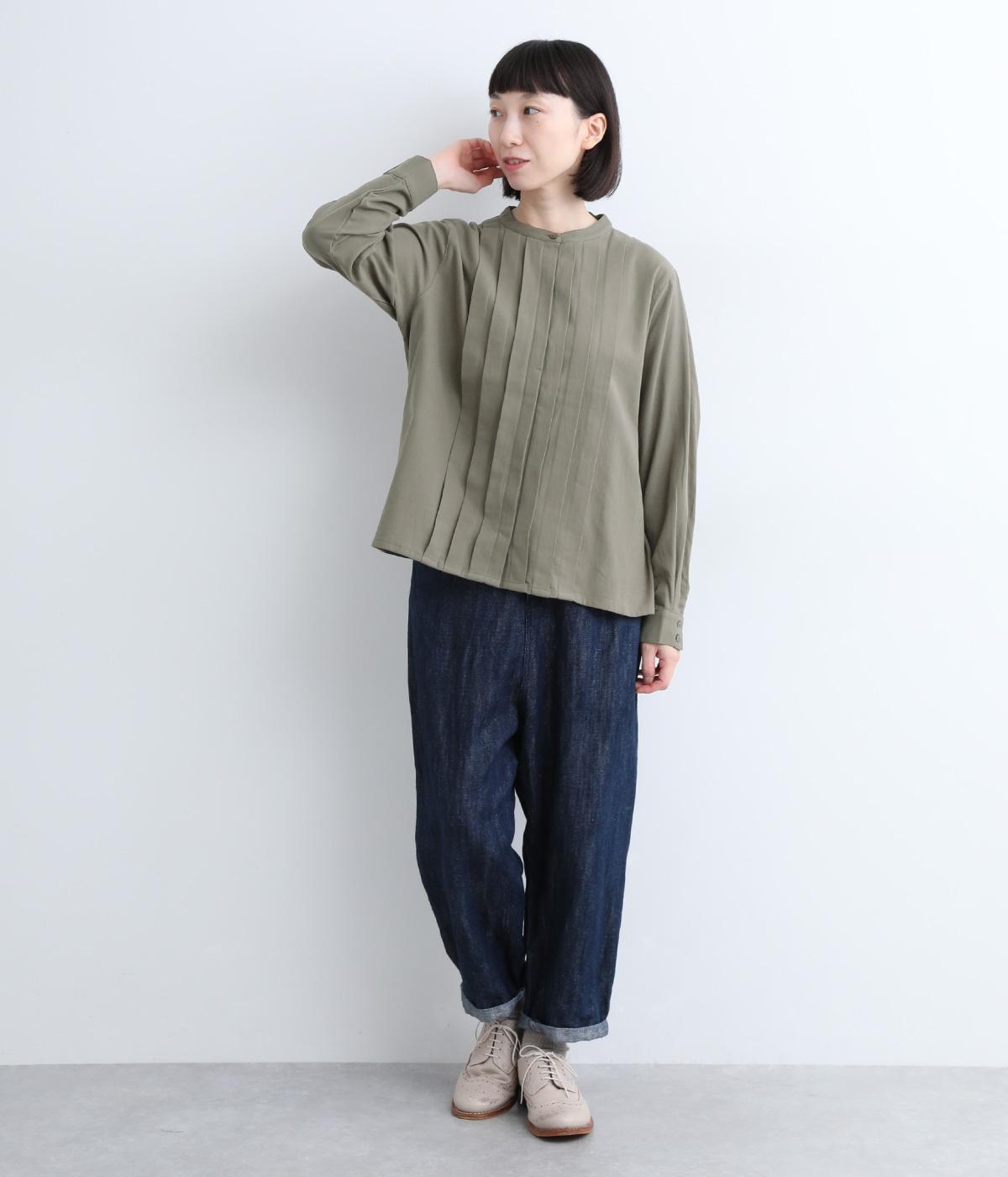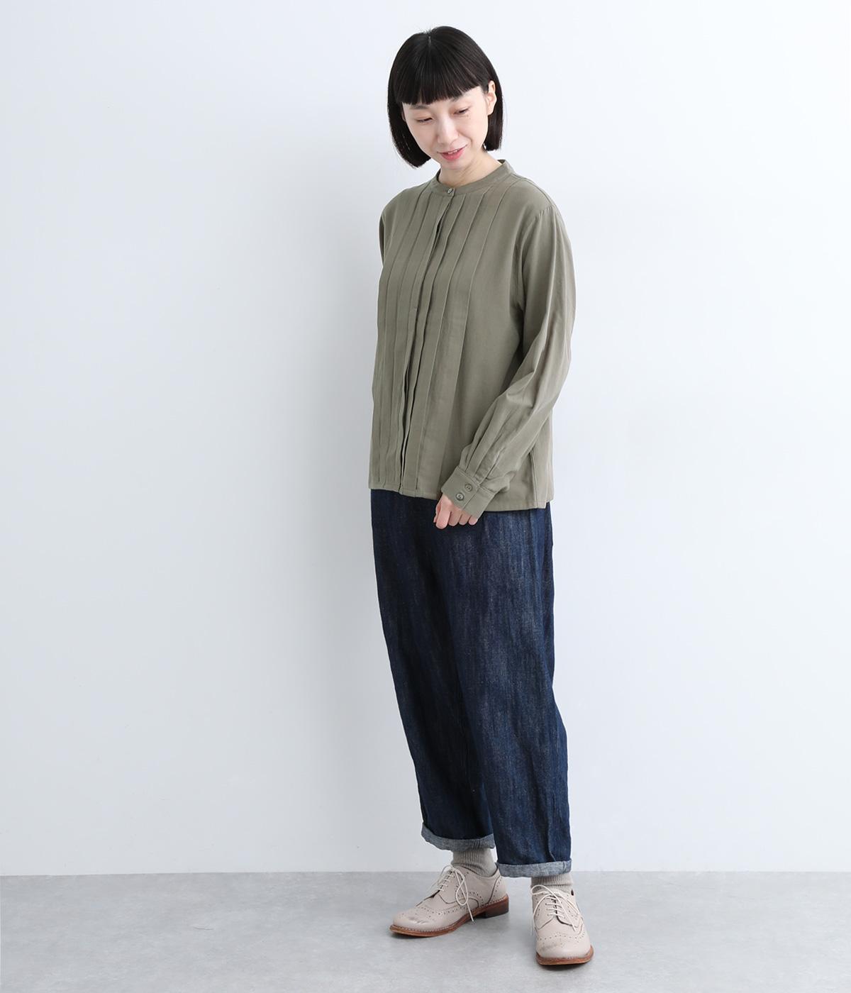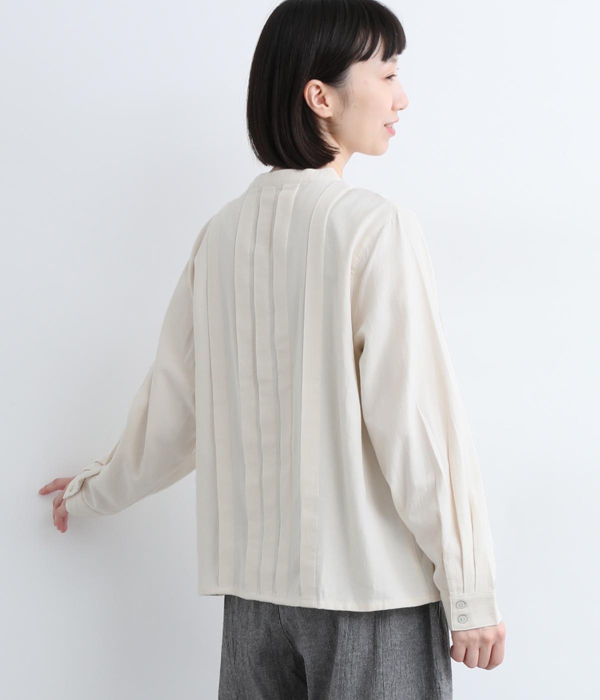 シンプルなスタンドカラーブラウスのフロントにプリーツ加工を施し、自然な奥行きを持たせました。太めのひだは、上半身の体型カバーにも効果を発揮。プリーツ以外は無駄をはぶいた洗練されたデザインで、スタイリッシュに着こなせます。