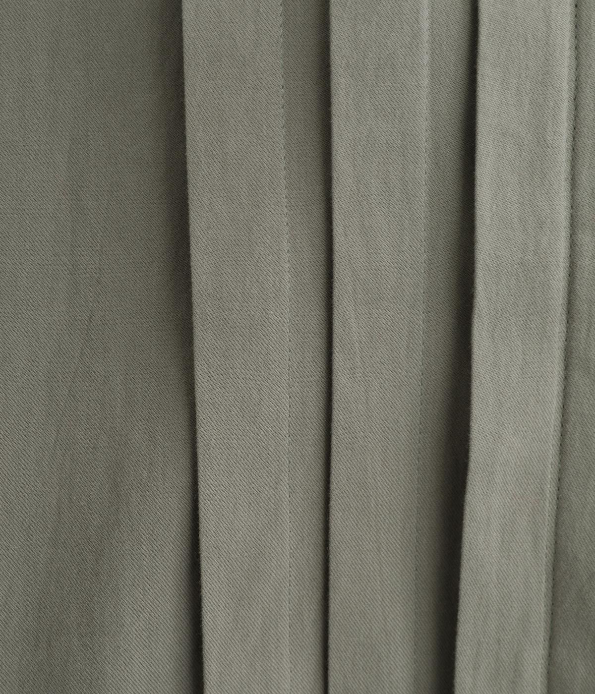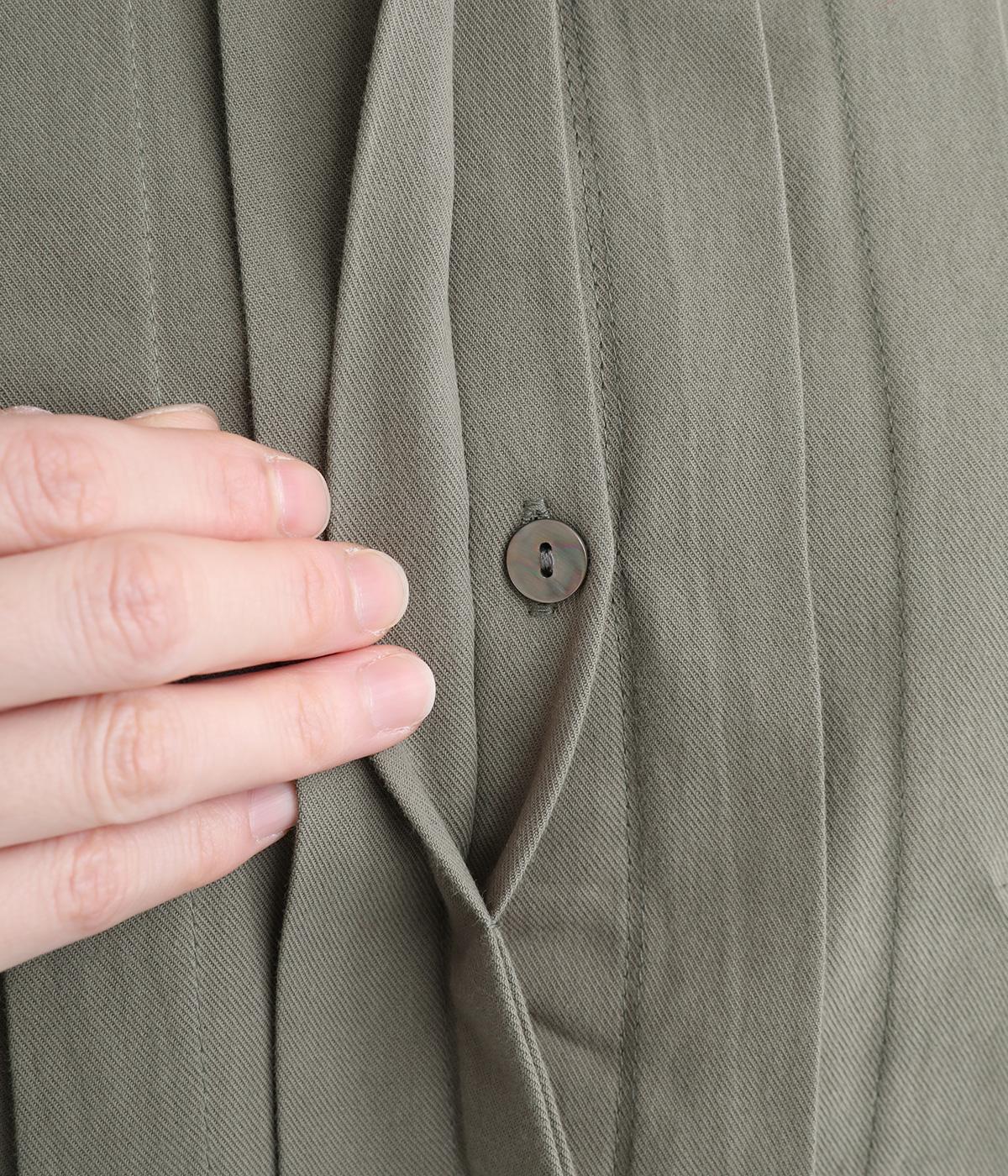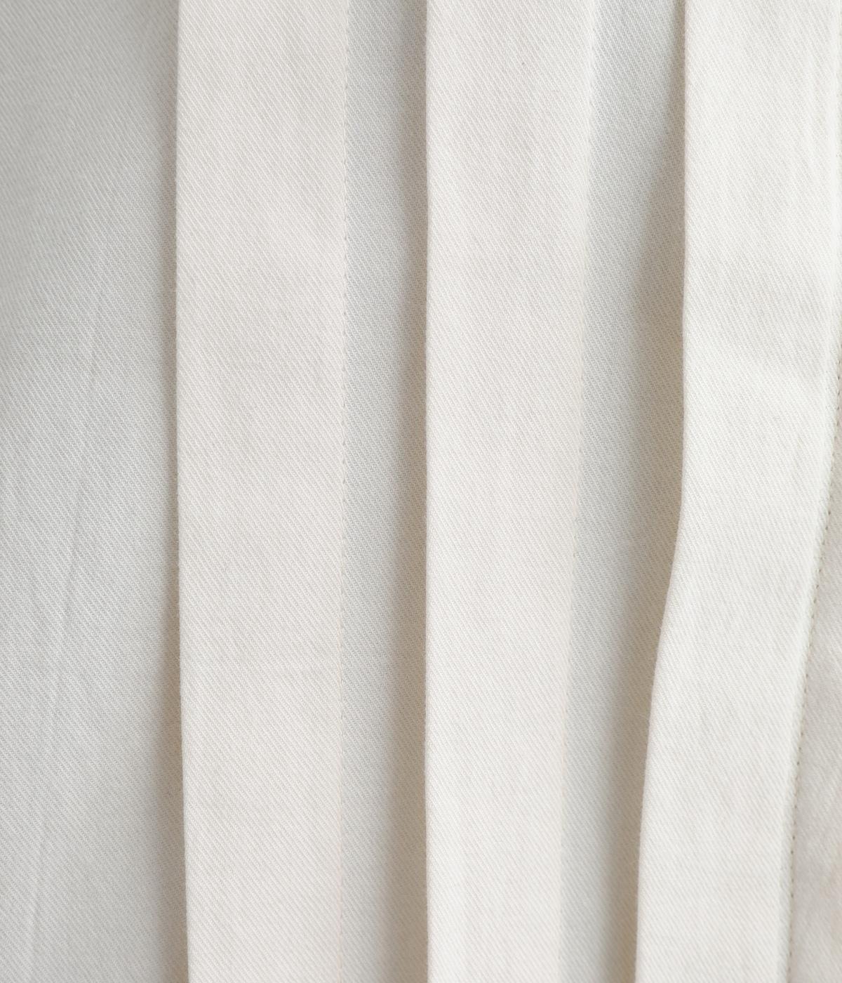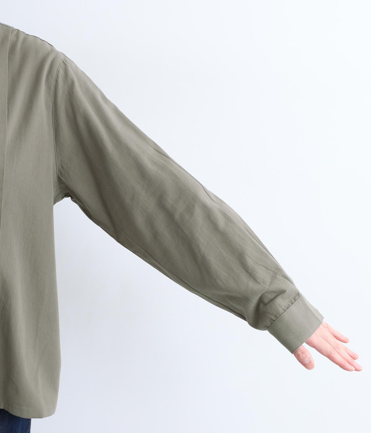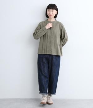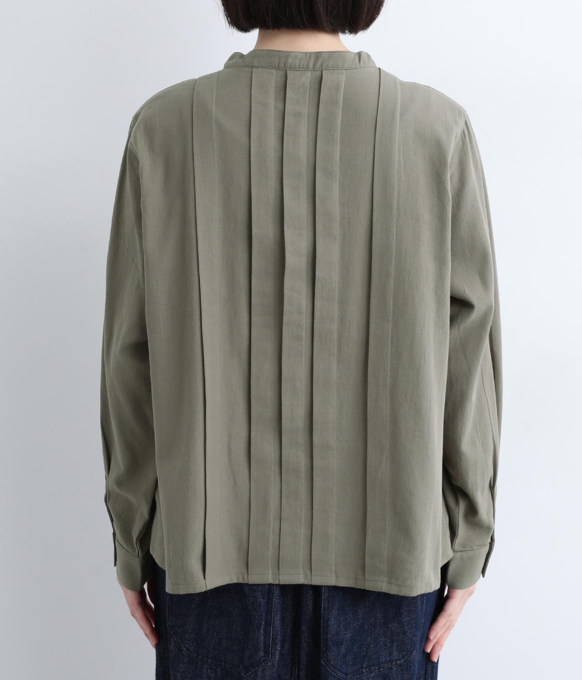 シンプルなスタンドカラーブラウスのフロントにプリーツ加工を施し、自然な奥行きを持たせました。太めのひだは、上半身の体型カバーにも効果を発揮。プリーツ以外は無駄をはぶいた洗練されたデザインで、スタイリッシュに着こなせます。