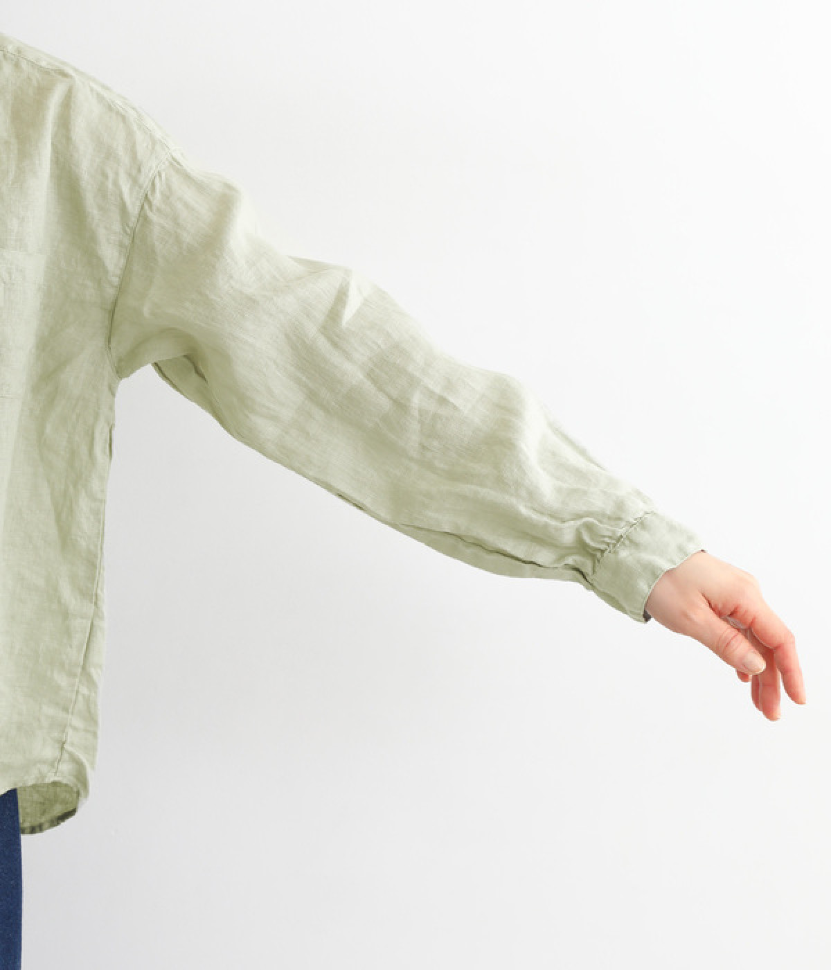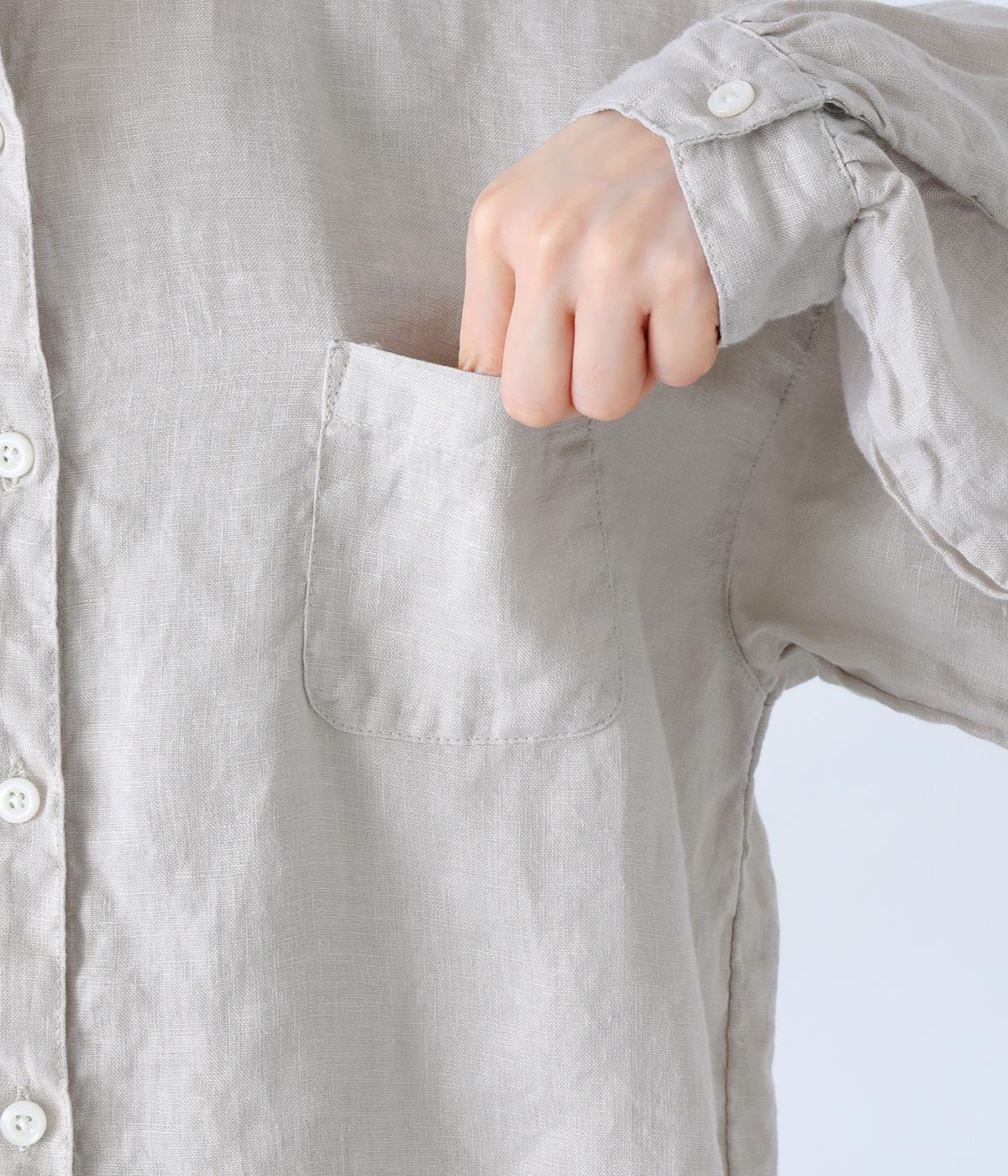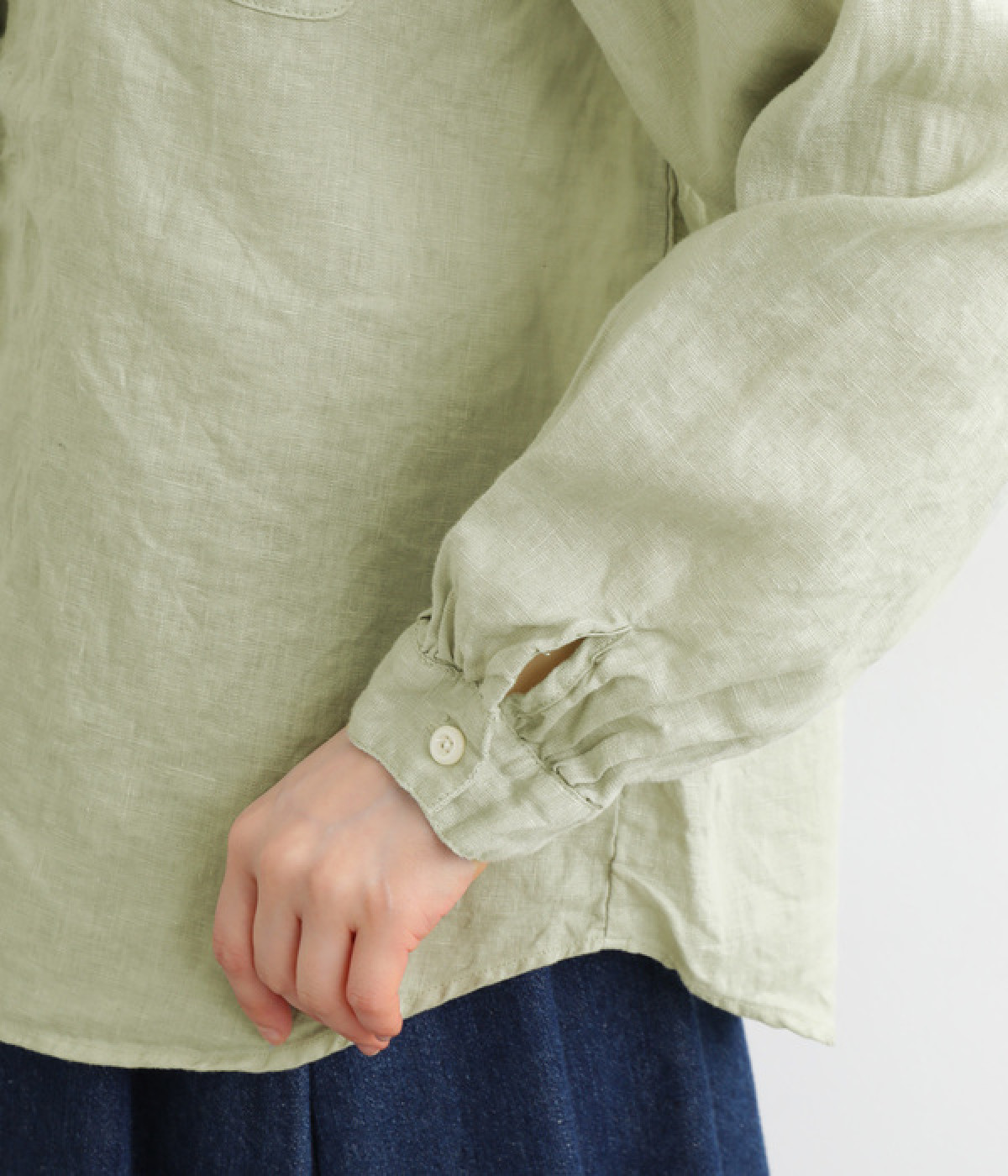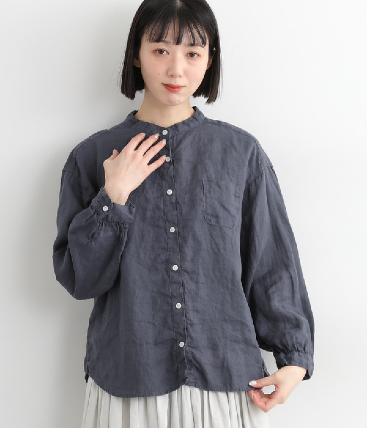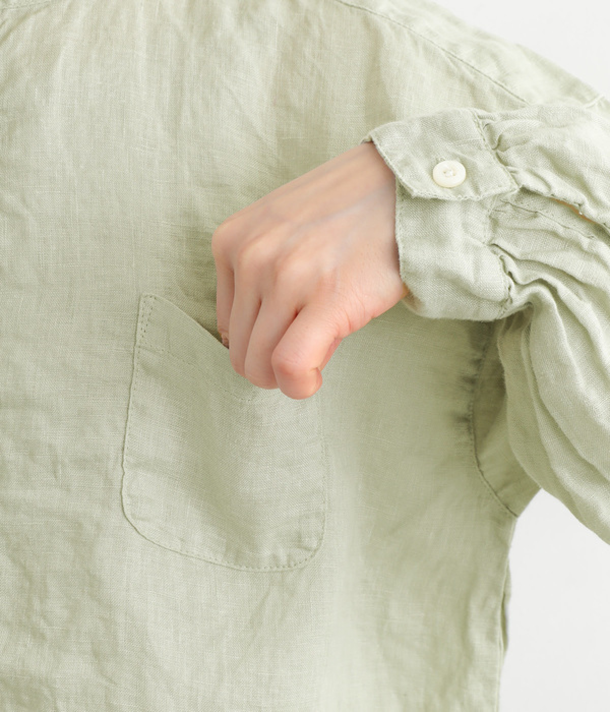 リネン生地の独特な風合いを引き立てたシンプルなシャツ。低めのスタンドカラーと左胸のポケットがきちんと感を添えてくれます。袖口にはギャザーをあしらってフェミニンなポイントに。さまざまなボトムスとなじみやすくする、緩やかに曲線を描くヘムラインも◎です。