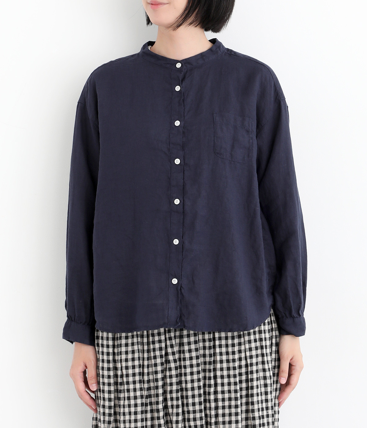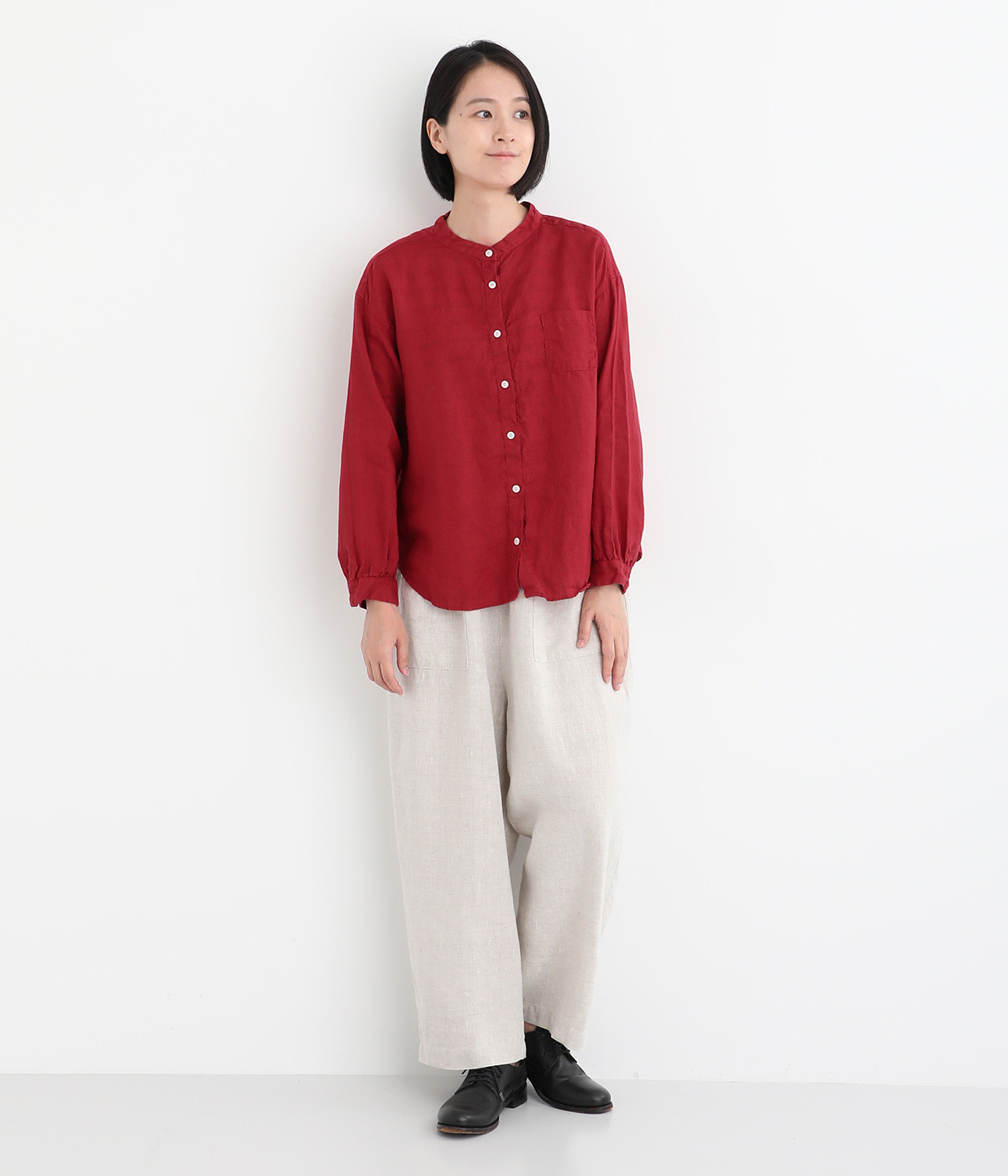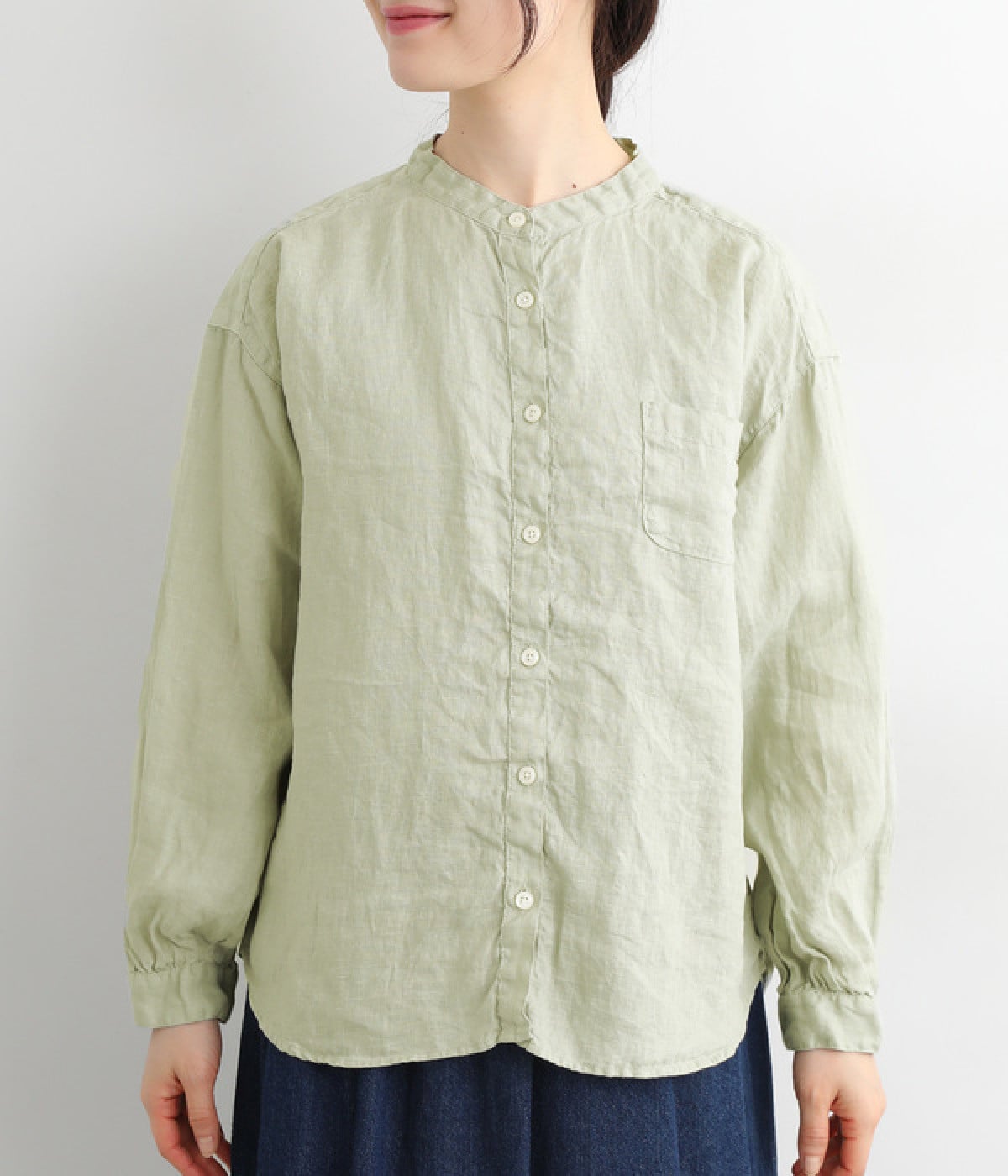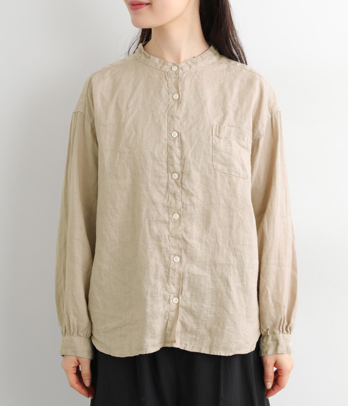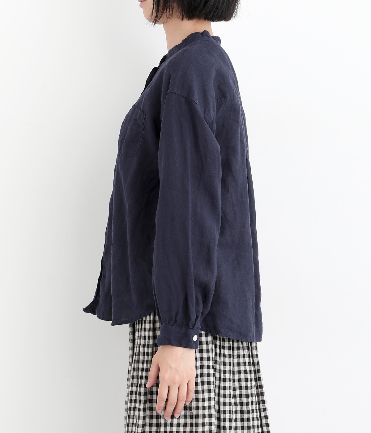 リネン生地の独特な風合いを引き立てたシンプルなシャツ。低めのスタンドカラーと左胸のポケットがきちんと感を添えてくれます。袖口にはギャザーをあしらってフェミニンなポイントに。さまざまなボトムスとなじみやすくする、緩やかに曲線を描くヘムラインも◎です。