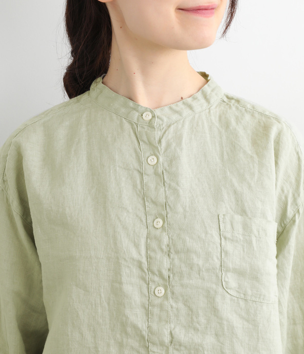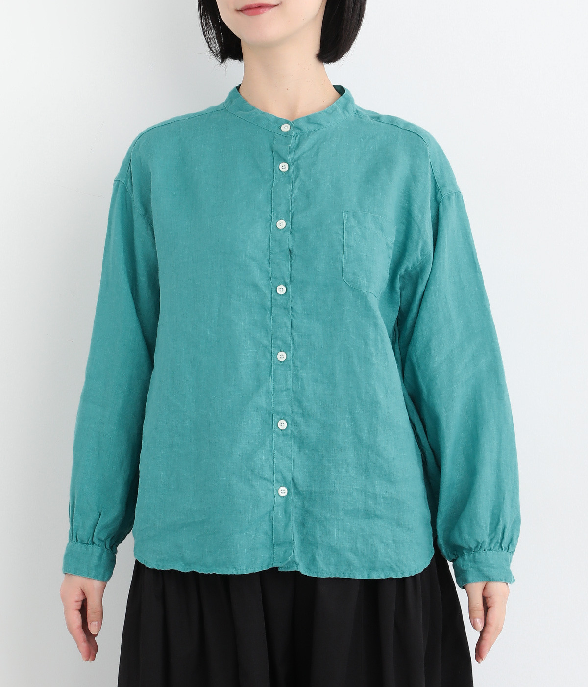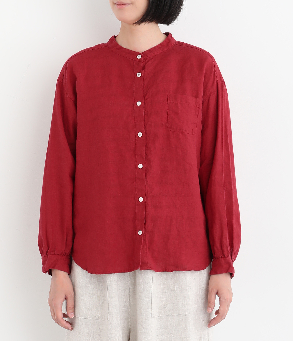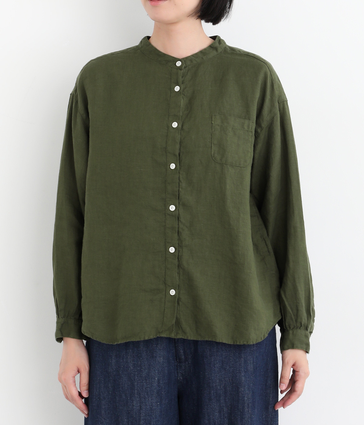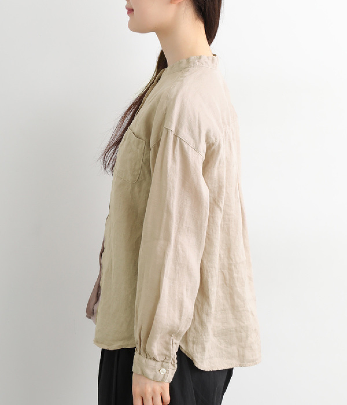 リネン生地の独特な風合いを引き立てたシンプルなシャツ。低めのスタンドカラーと左胸のポケットがきちんと感を添えてくれます。袖口にはギャザーをあしらってフェミニンなポイントに。さまざまなボトムスとなじみやすくする、緩やかに曲線を描くヘムラインも◎です。