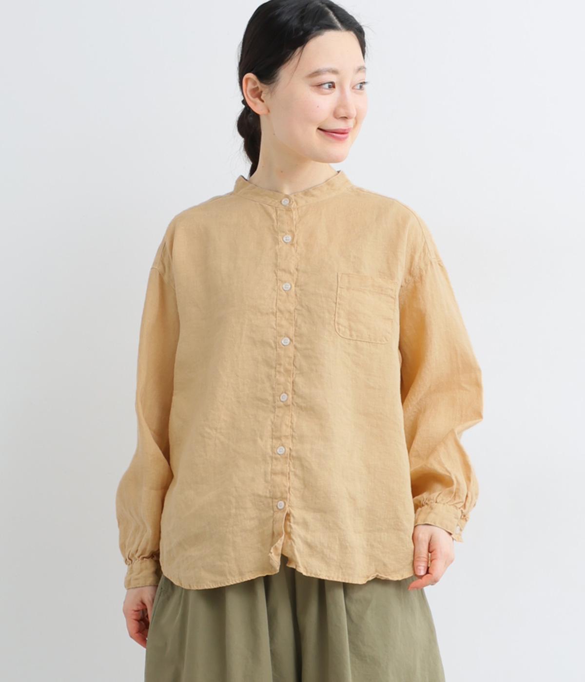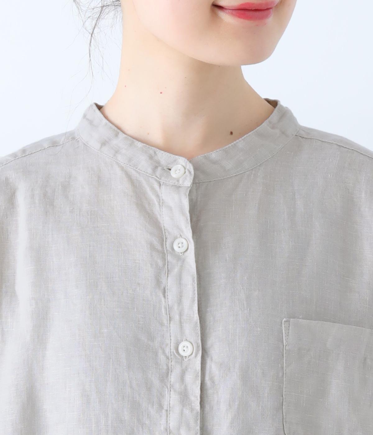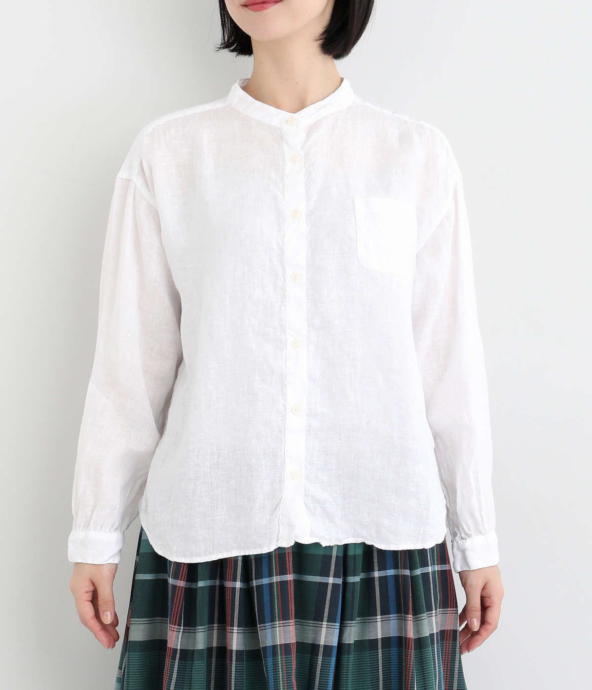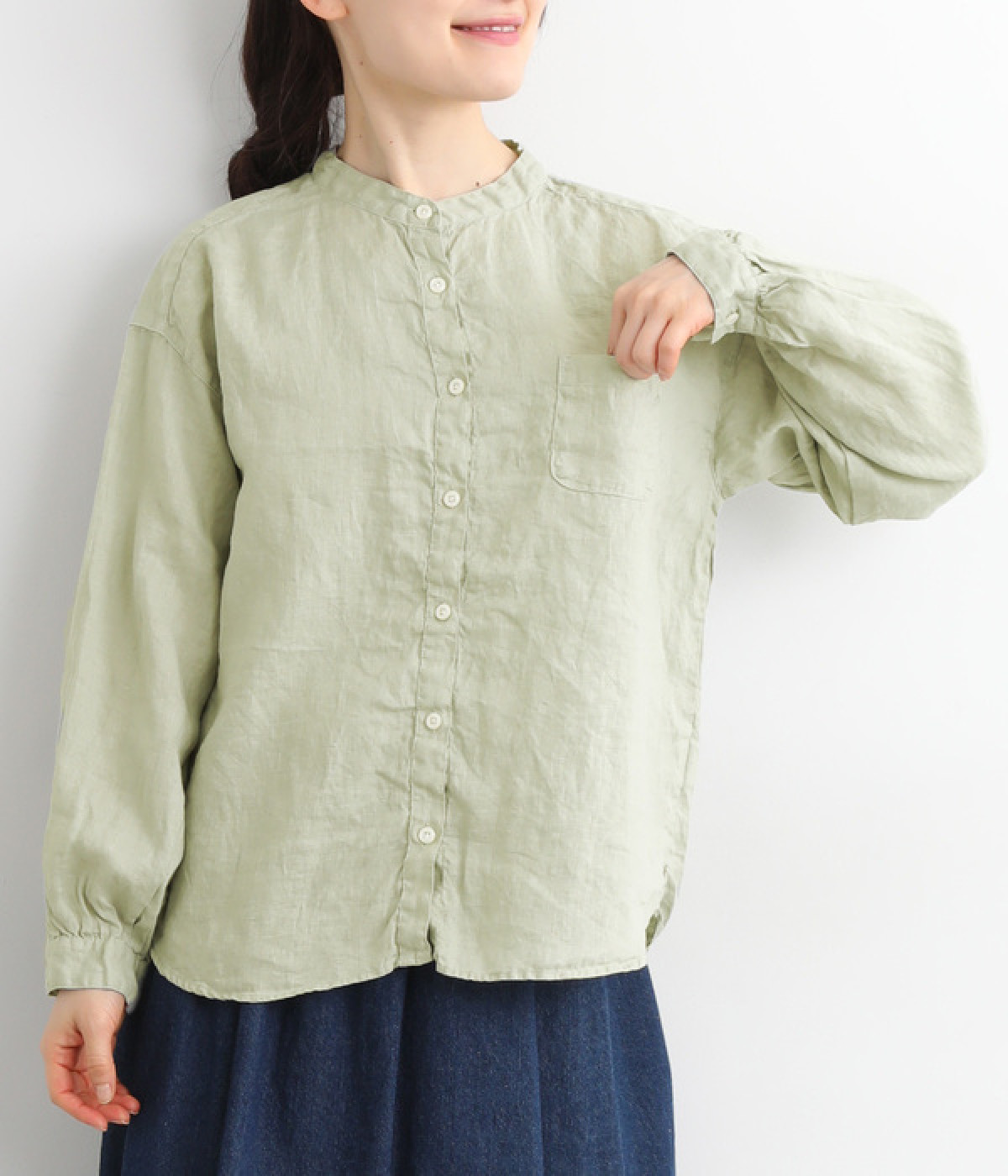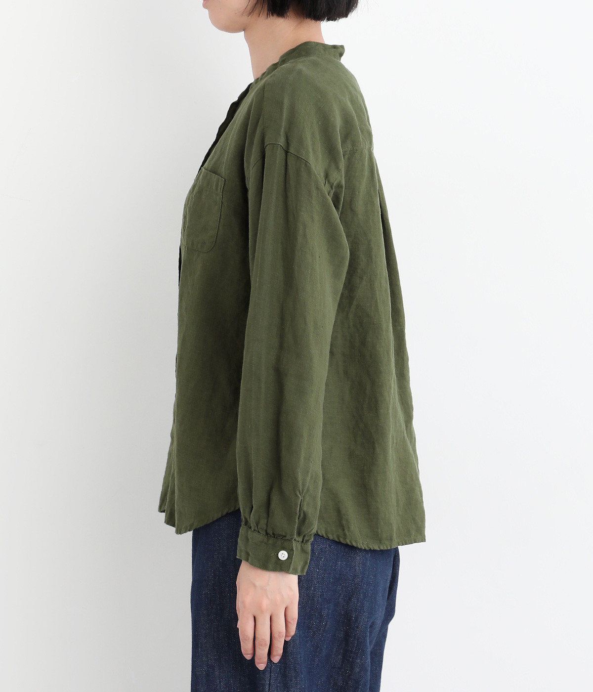リネン生地の独特な風合いを引き立てたシンプルなシャツ。低めのスタンドカラーと左胸のポケットがきちんと感を添えてくれます。袖口にはギャザーをあしらってフェミニンなポイントに。さまざまなボトムスとなじみやすくする、緩やかに曲線を描くヘムラインも◎です。