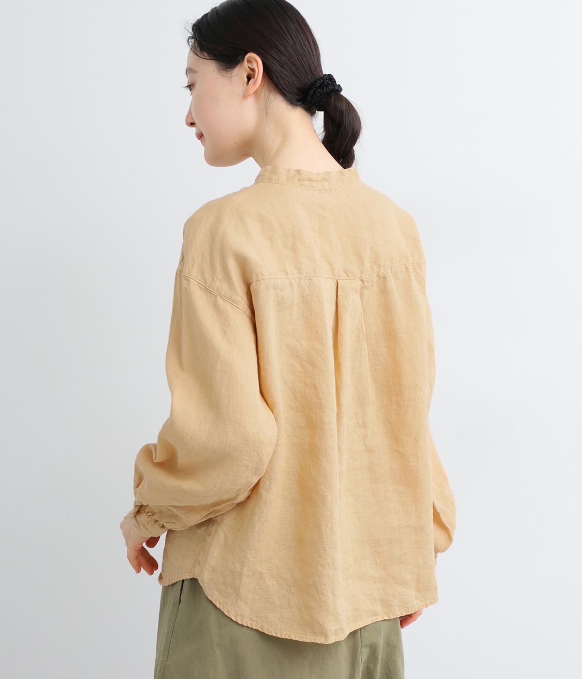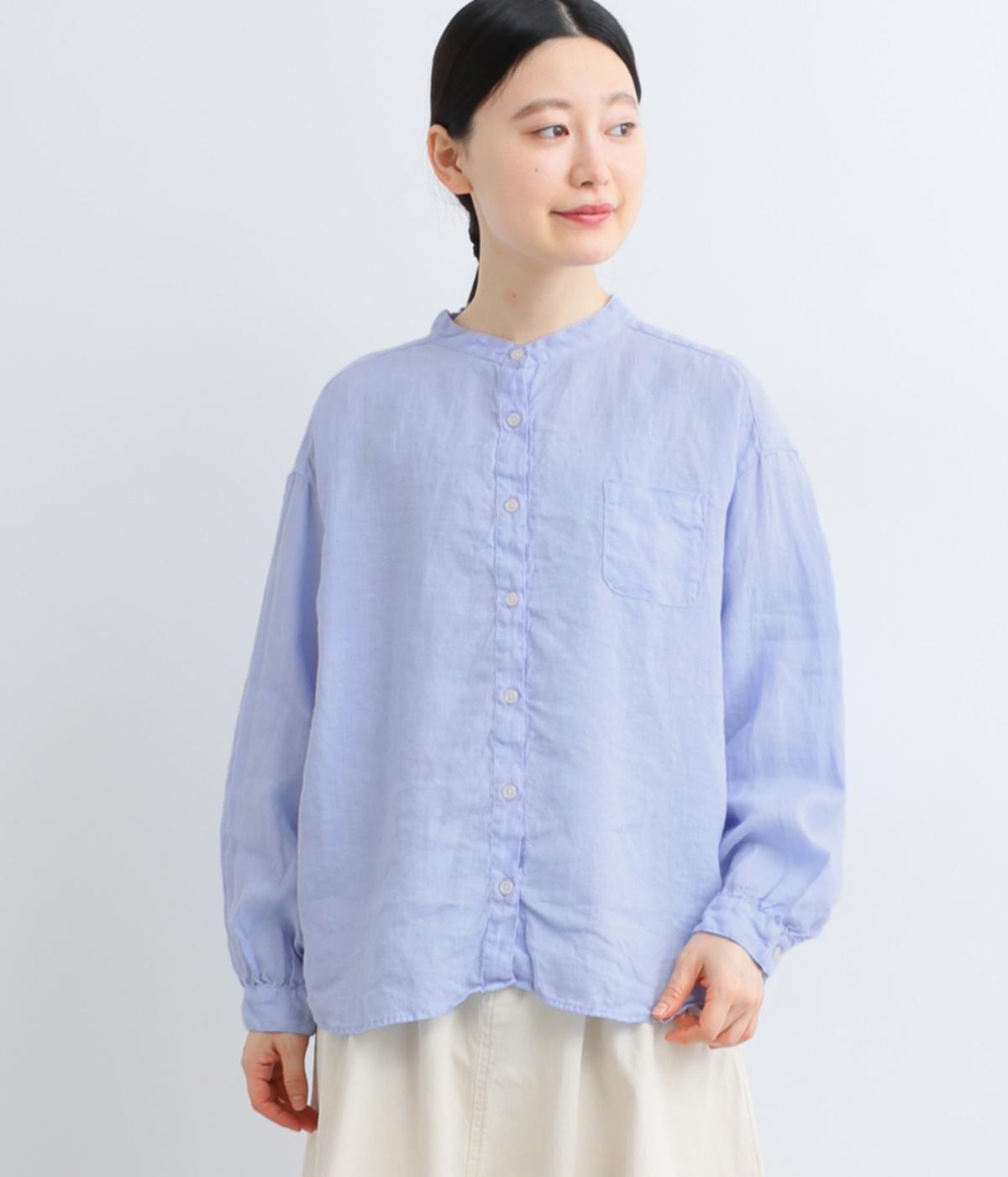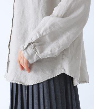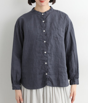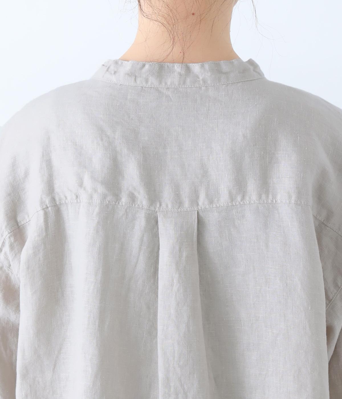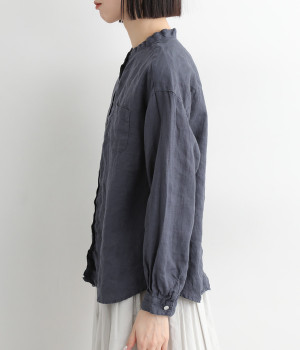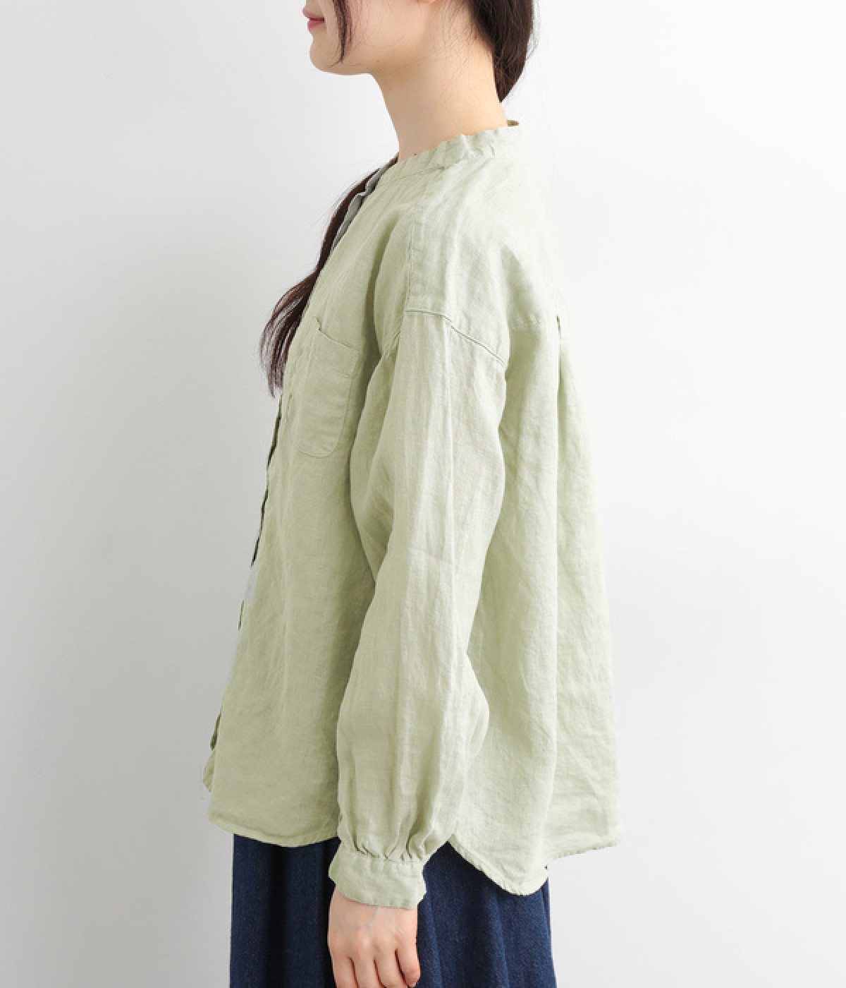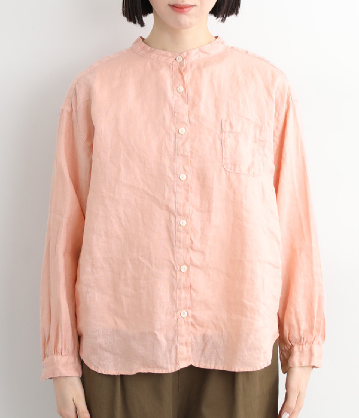 リネン生地の独特な風合いを引き立てたシンプルなシャツ。低めのスタンドカラーと左胸のポケットがきちんと感を添えてくれます。袖口にはギャザーをあしらってフェミニンなポイントに。さまざまなボトムスとなじみやすくする、緩やかに曲線を描くヘムラインも◎です。