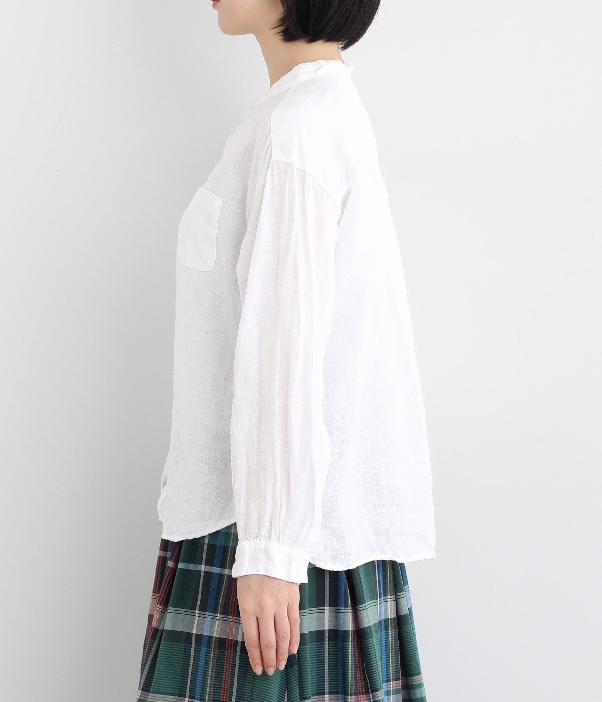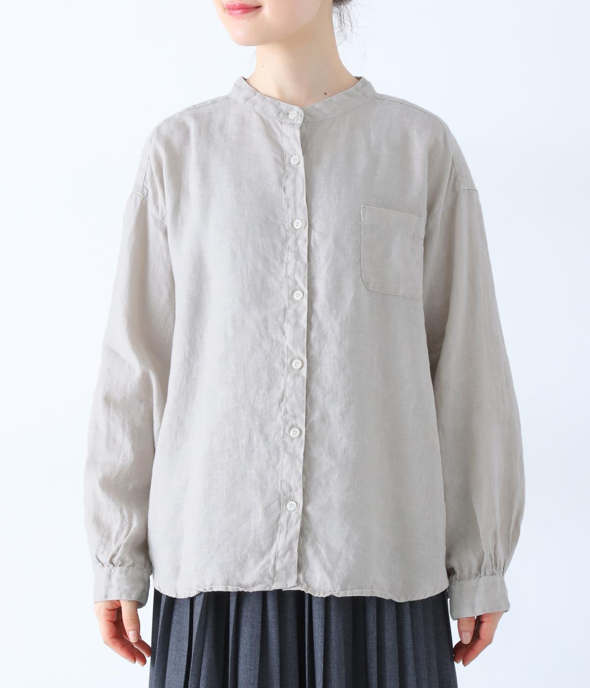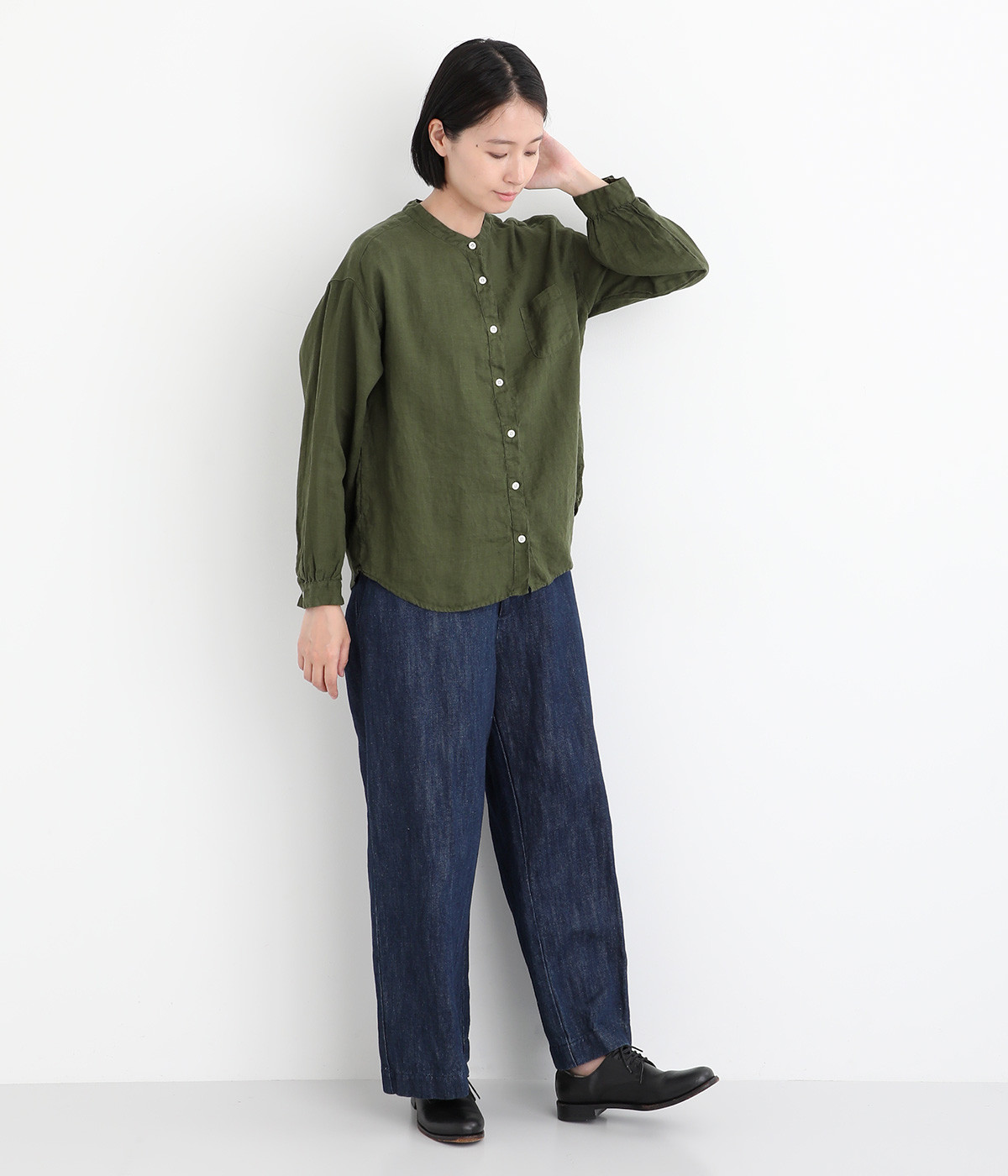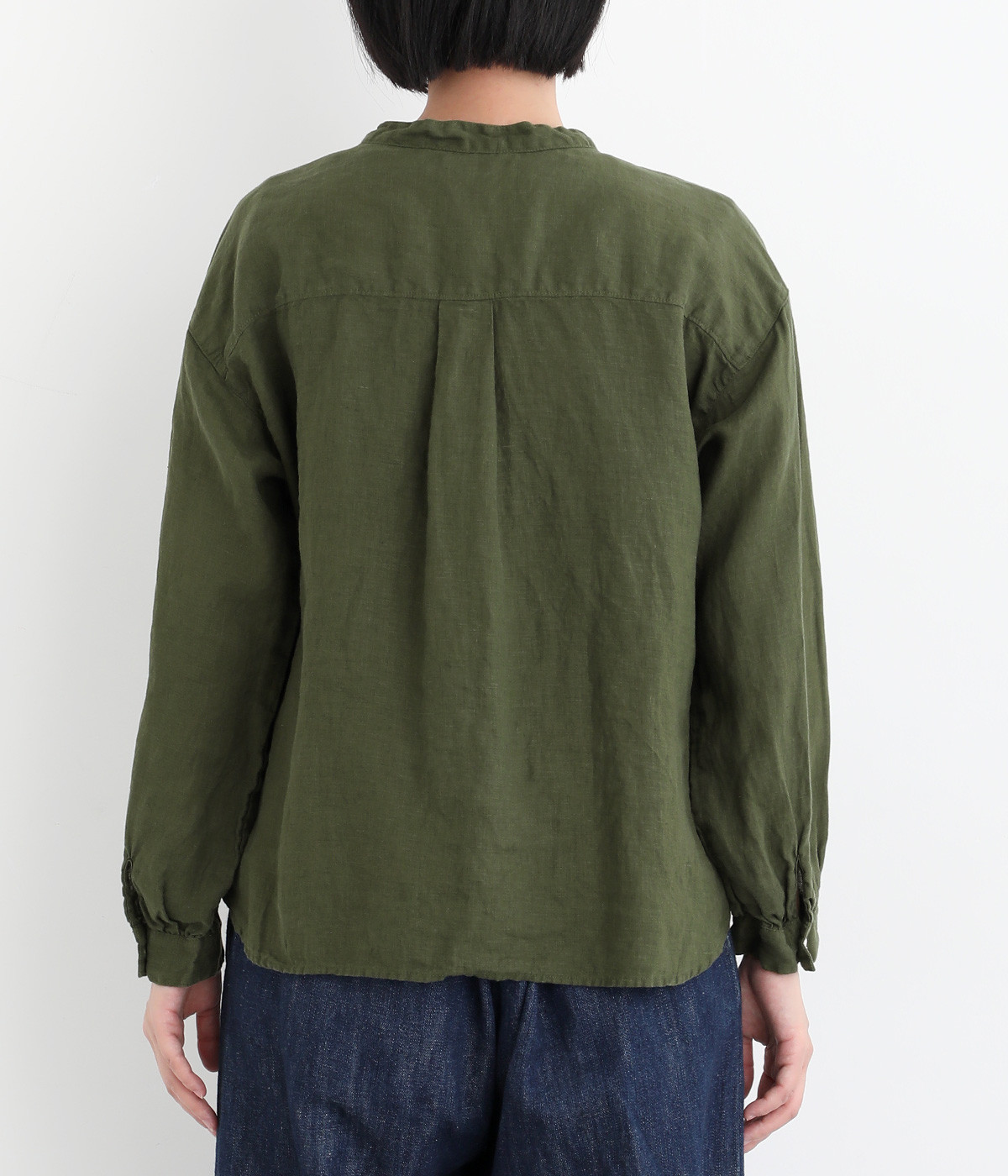 リネン生地の独特な風合いを引き立てたシンプルなシャツ。低めのスタンドカラーと左胸のポケットがきちんと感を添えてくれます。袖口にはギャザーをあしらってフェミニンなポイントに。さまざまなボトムスとなじみやすくする、緩やかに曲線を描くヘムラインも◎です。