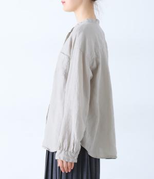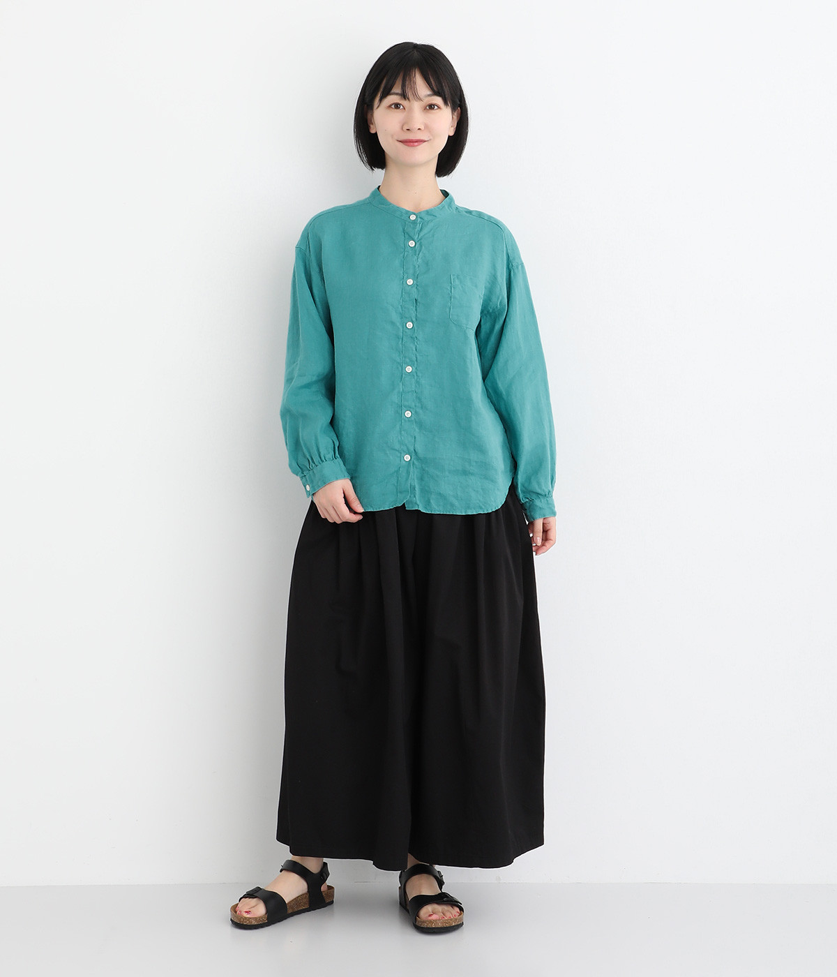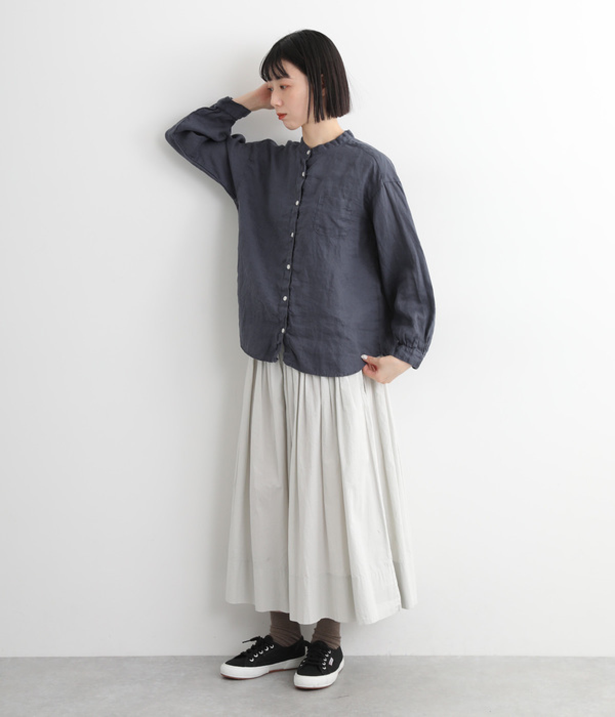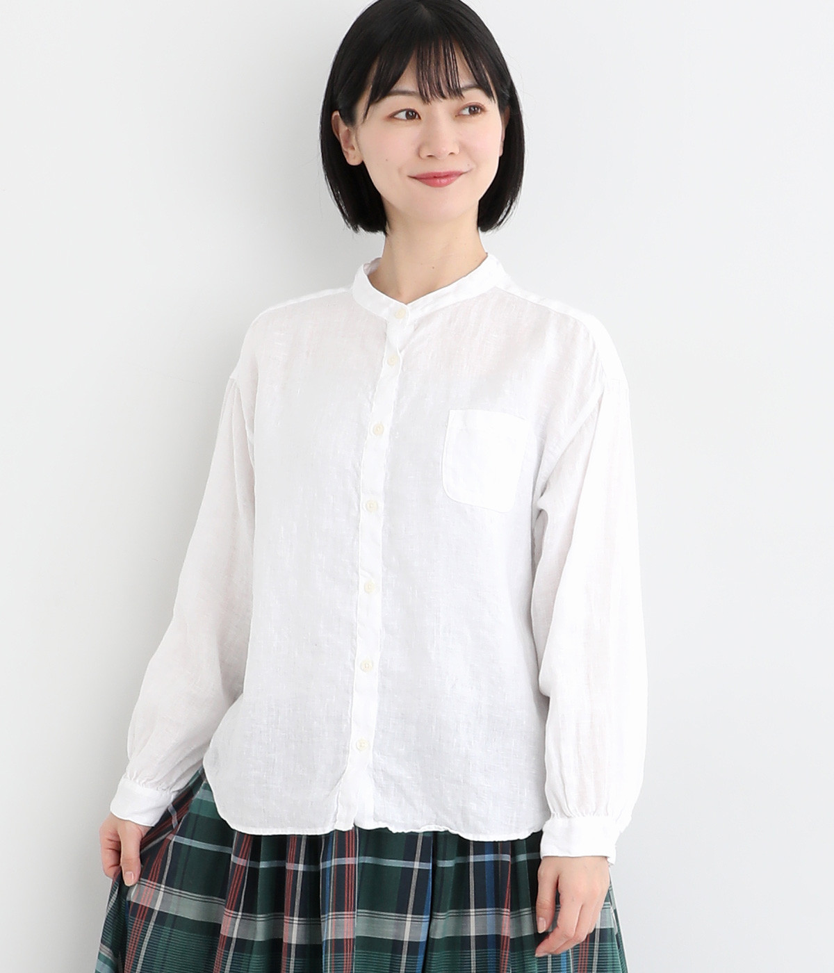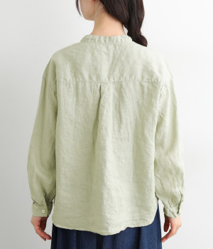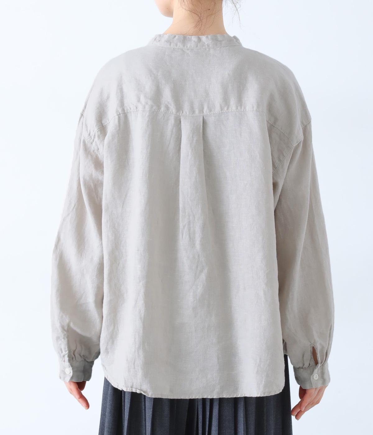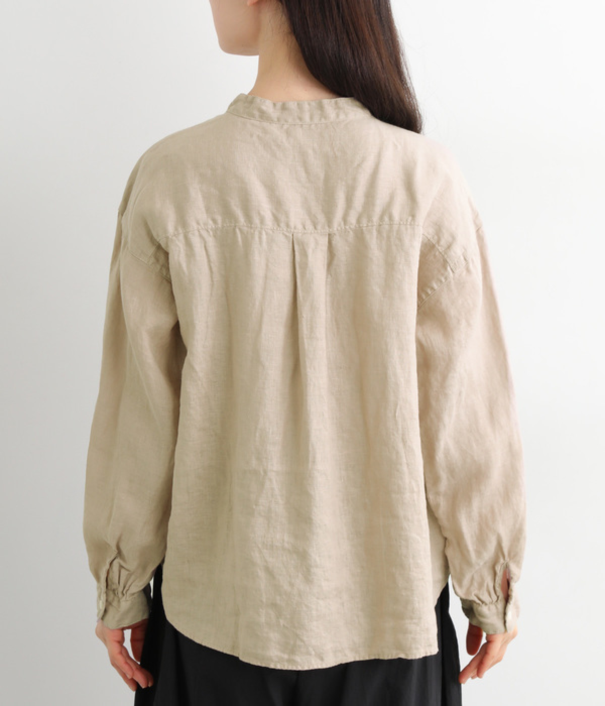 リネン生地の独特な風合いを引き立てたシンプルなシャツ。低めのスタンドカラーと左胸のポケットがきちんと感を添えてくれます。袖口にはギャザーをあしらってフェミニンなポイントに。さまざまなボトムスとなじみやすくする、緩やかに曲線を描くヘムラインも◎です。