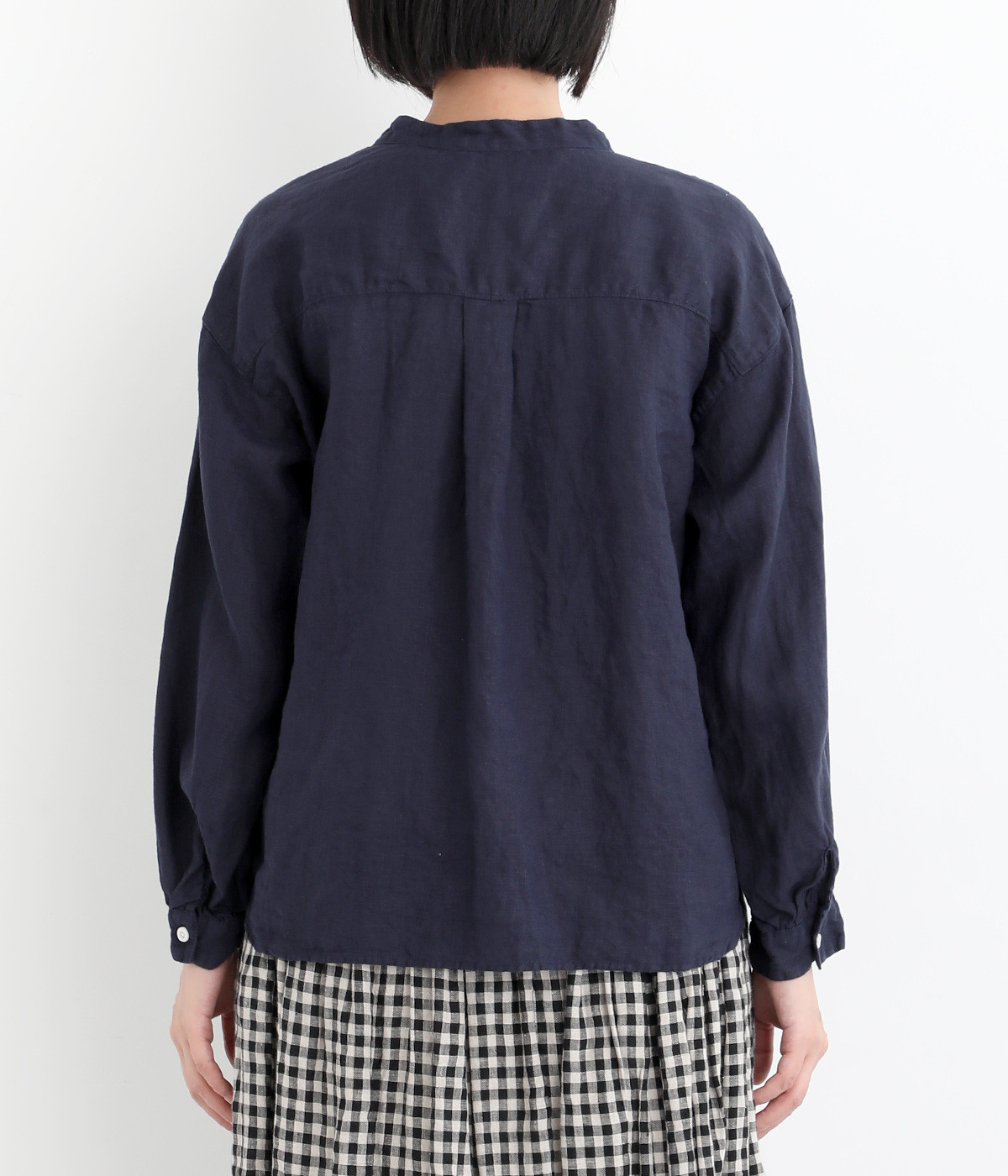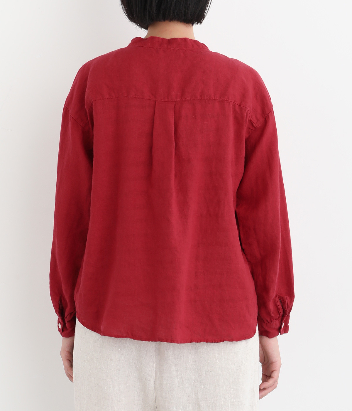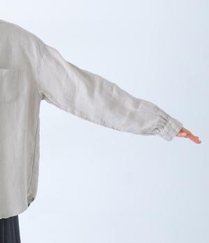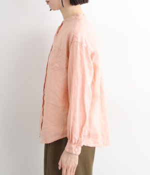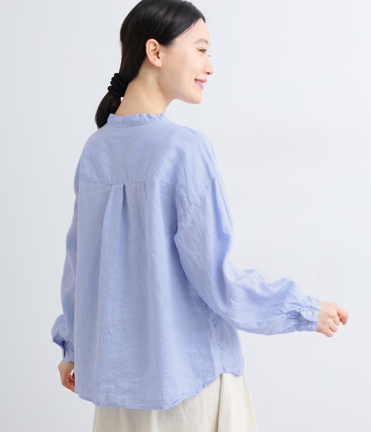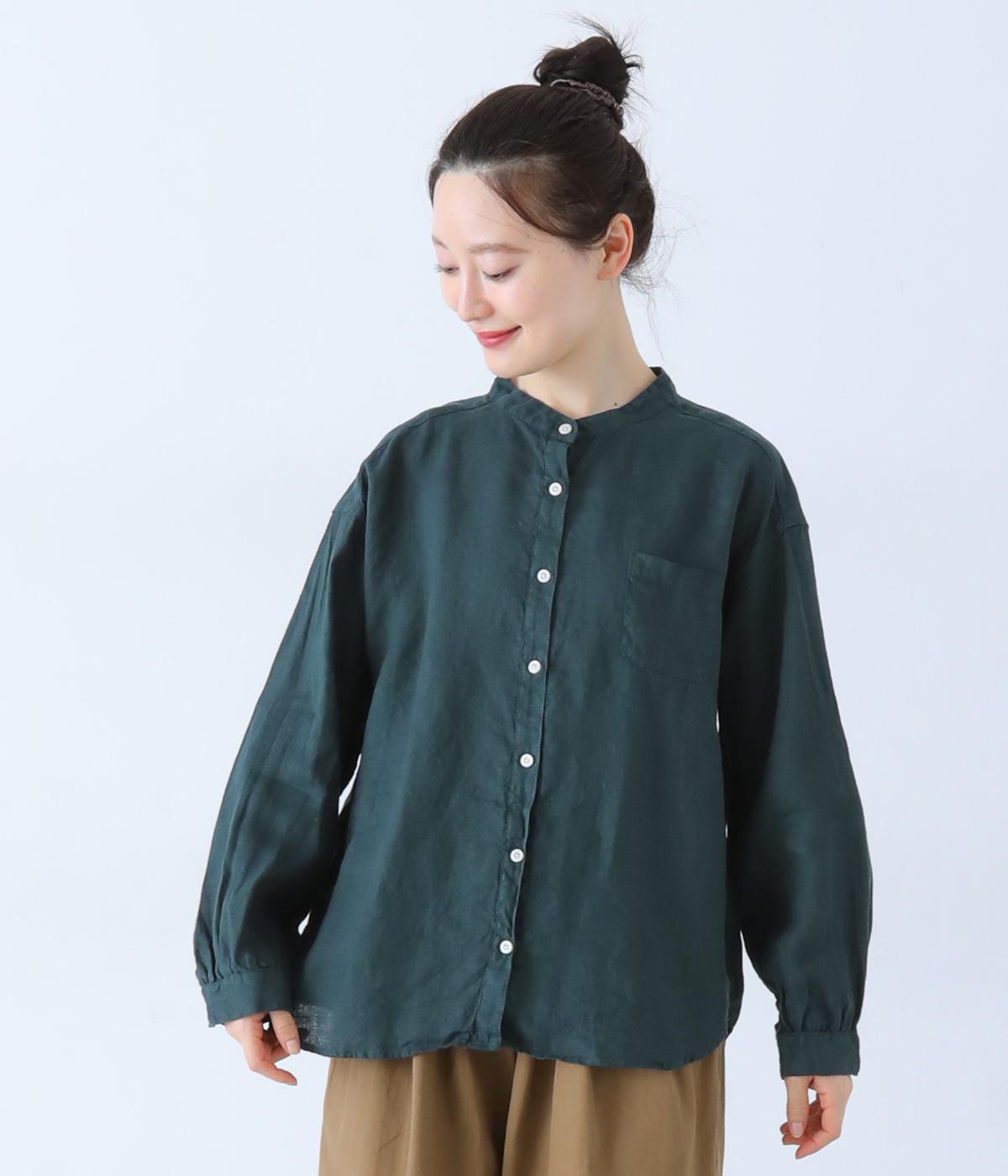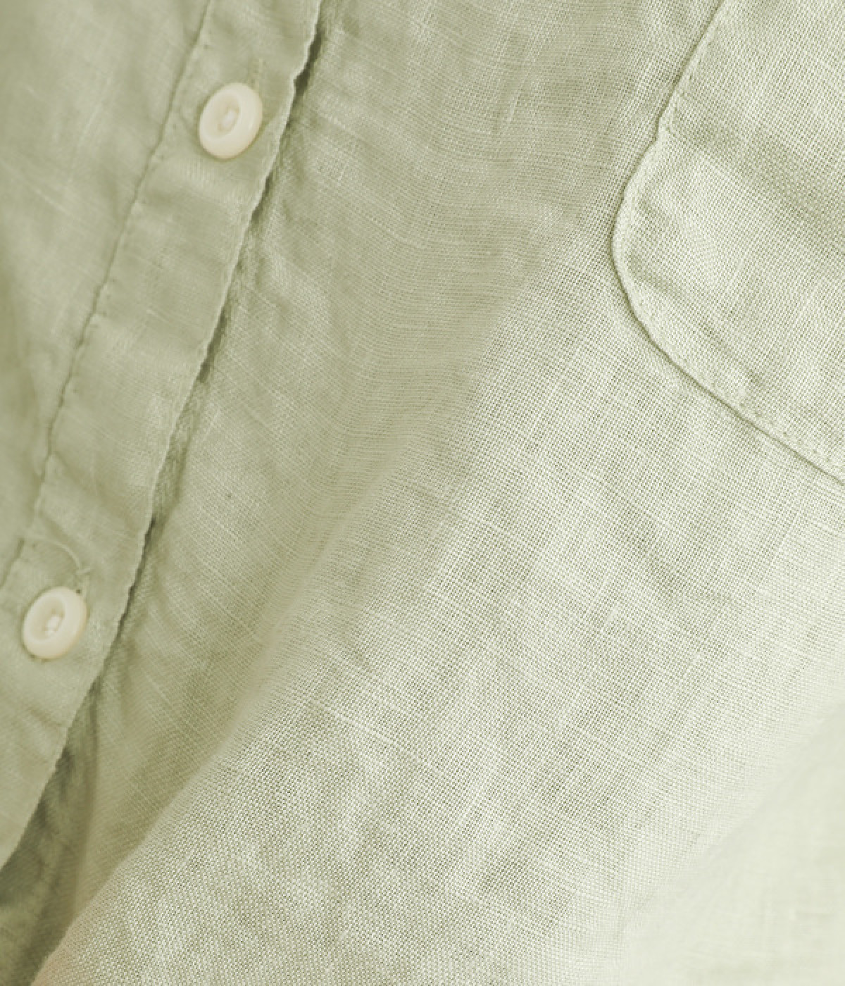 リネン生地の独特な風合いを引き立てたシンプルなシャツ。低めのスタンドカラーと左胸のポケットがきちんと感を添えてくれます。袖口にはギャザーをあしらってフェミニンなポイントに。さまざまなボトムスとなじみやすくする、緩やかに曲線を描くヘムラインも◎です。