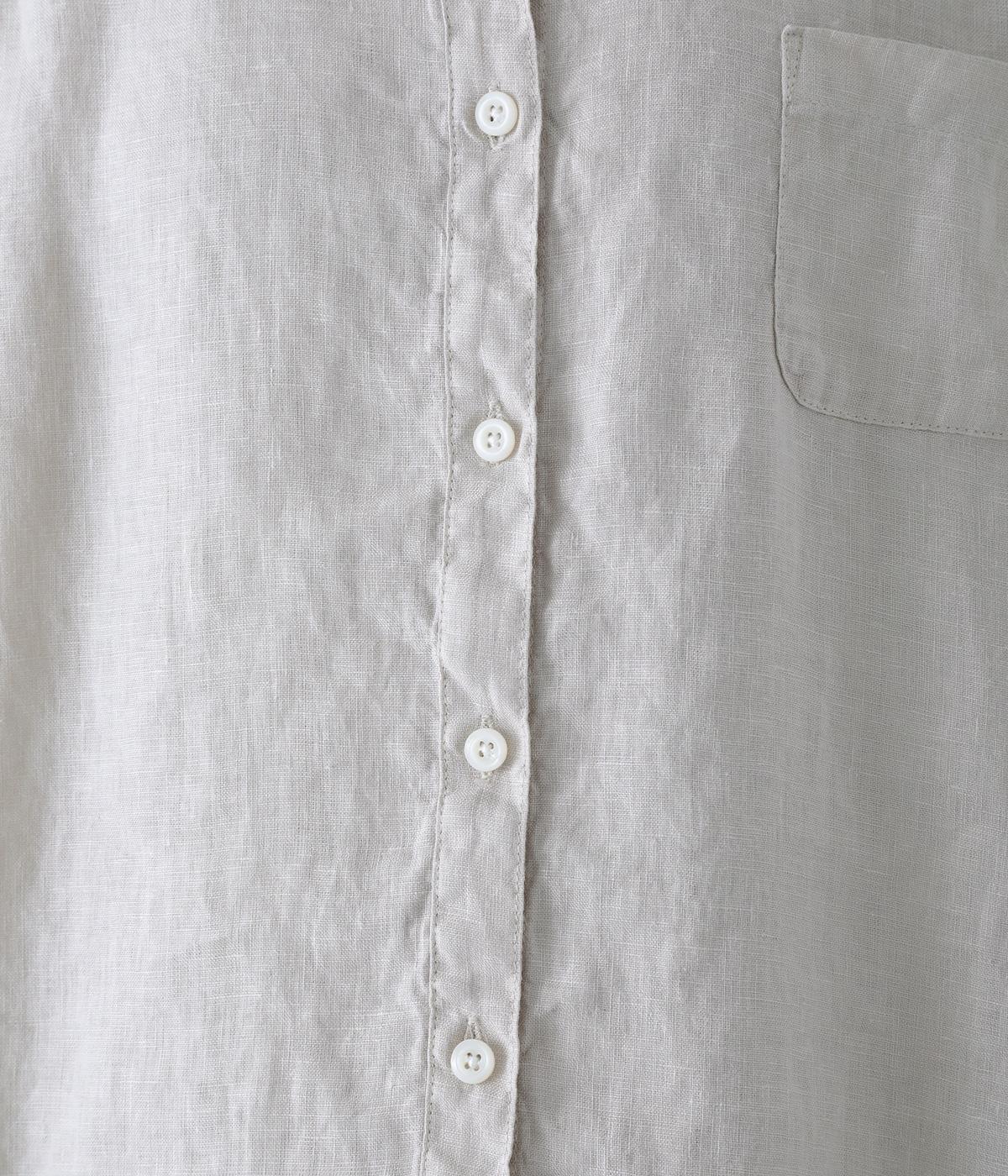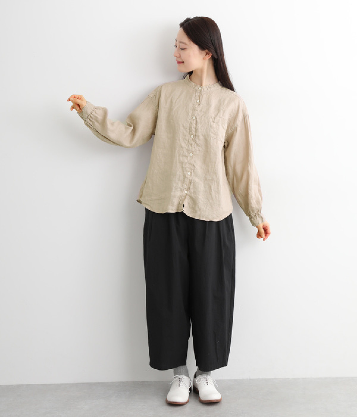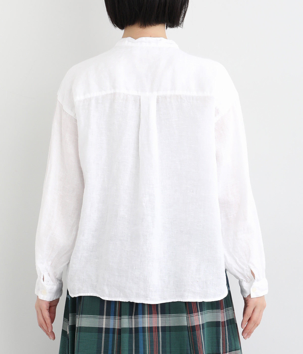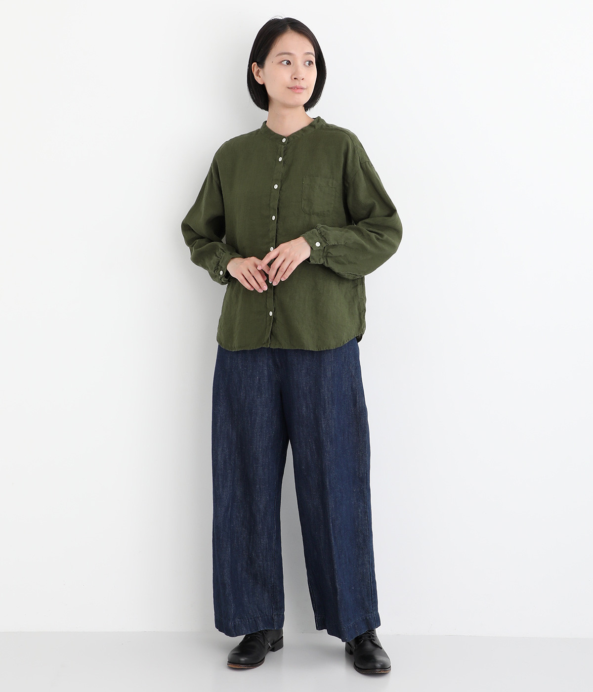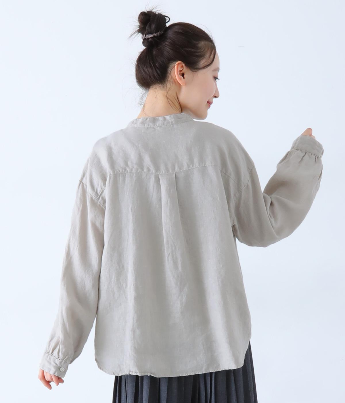 リネン生地の独特な風合いを引き立てたシンプルなシャツ。低めのスタンドカラーと左胸のポケットがきちんと感を添えてくれます。袖口にはギャザーをあしらってフェミニンなポイントに。さまざまなボトムスとなじみやすくする、緩やかに曲線を描くヘムラインも◎です。