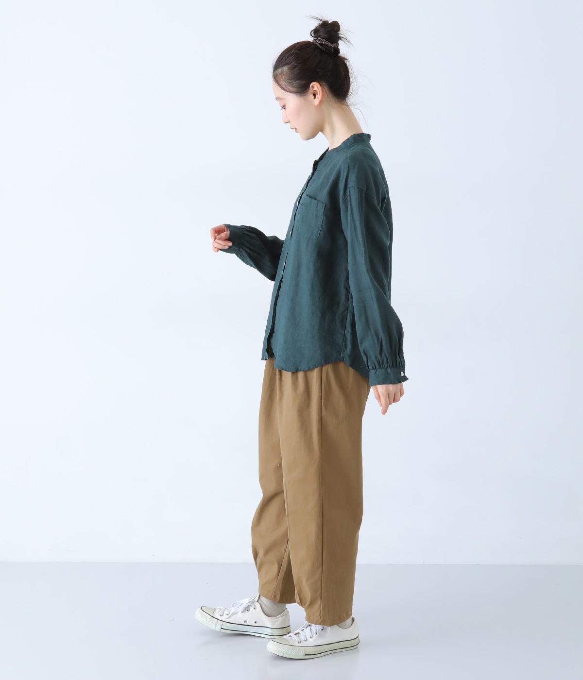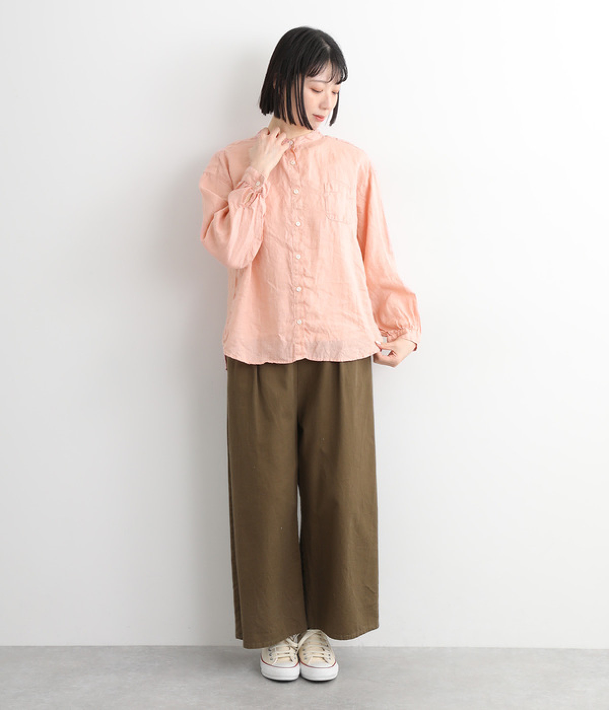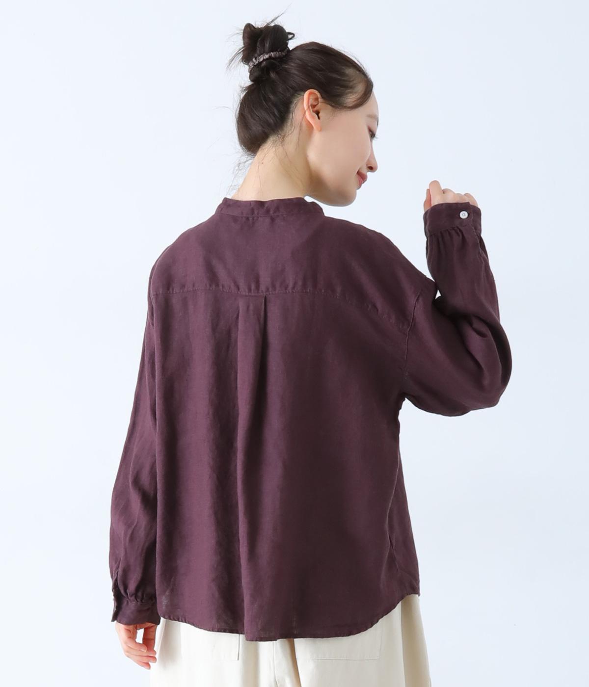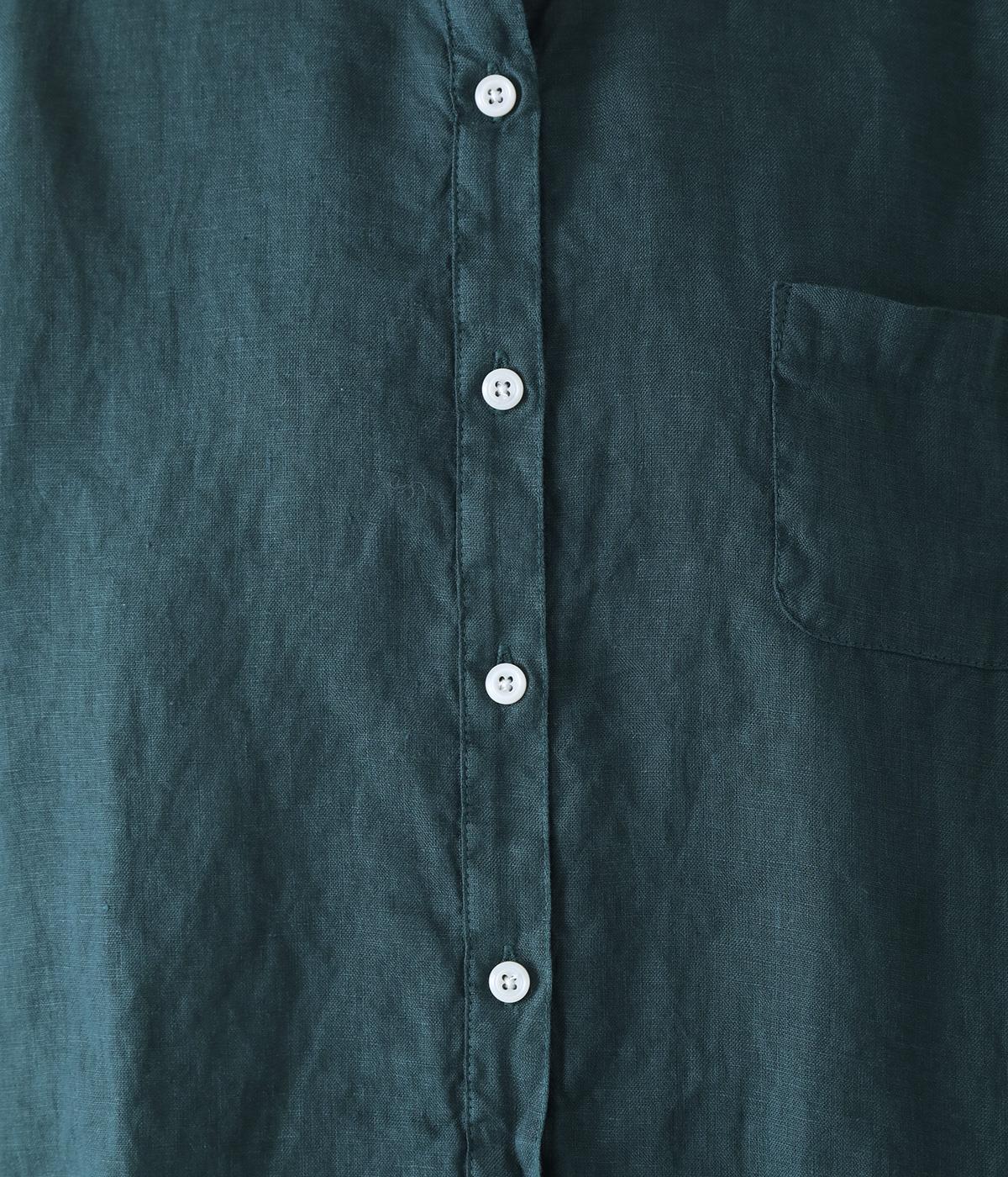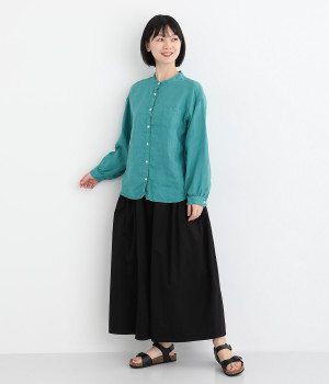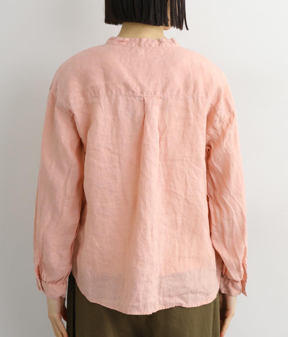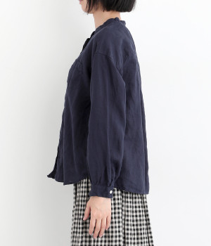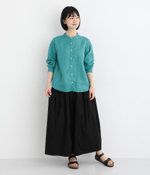 リネン生地の独特な風合いを引き立てたシンプルなシャツ。低めのスタンドカラーと左胸のポケットがきちんと感を添えてくれます。袖口にはギャザーをあしらってフェミニンなポイントに。さまざまなボトムスとなじみやすくする、緩やかに曲線を描くヘムラインも◎です。
