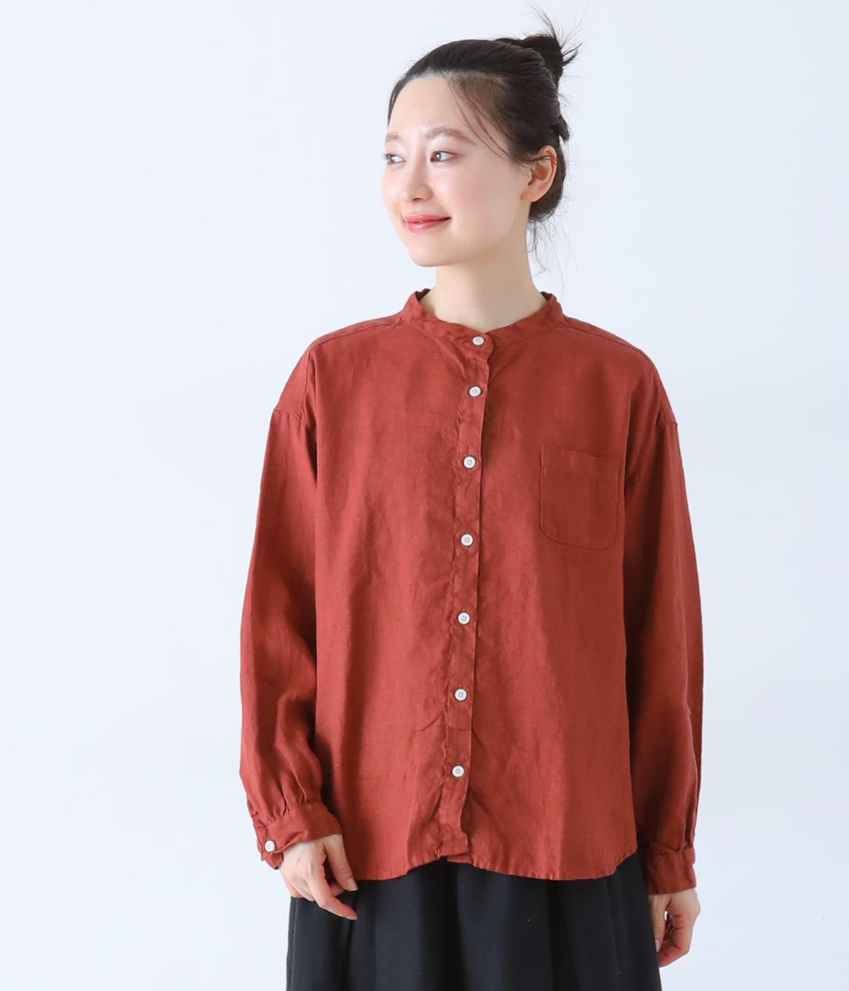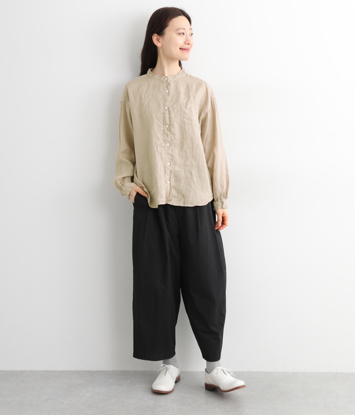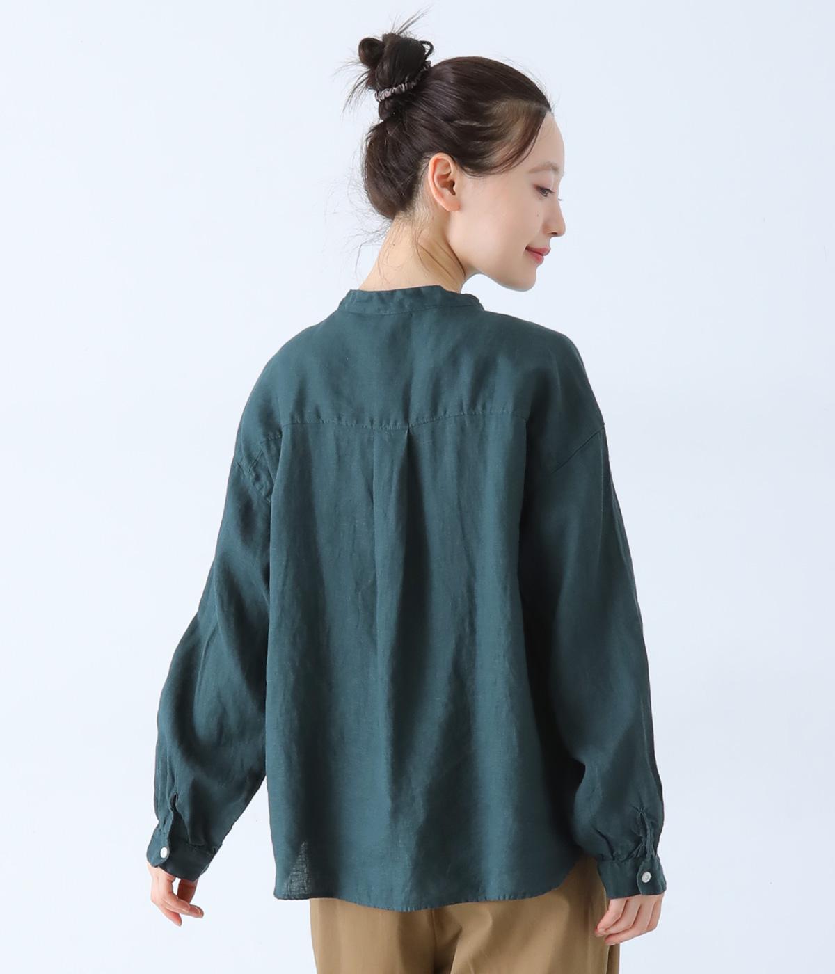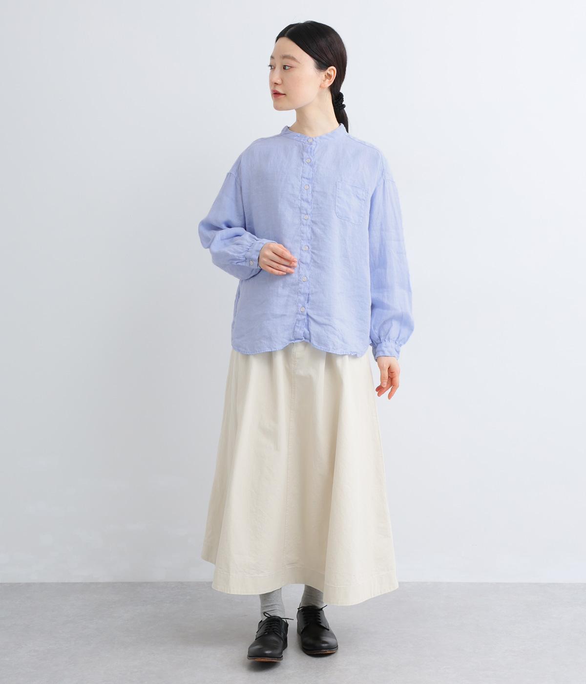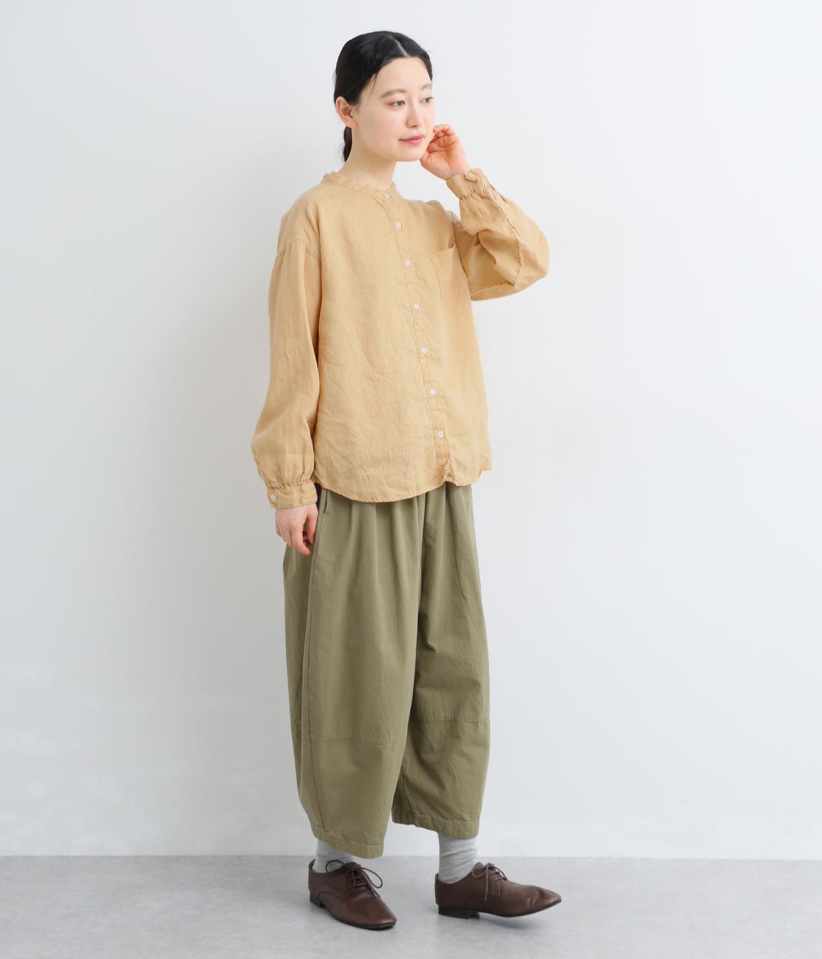 リネン生地の独特な風合いを引き立てたシンプルなシャツ。低めのスタンドカラーと左胸のポケットがきちんと感を添えてくれます。袖口にはギャザーをあしらってフェミニンなポイントに。さまざまなボトムスとなじみやすくする、緩やかに曲線を描くヘムラインも◎です。