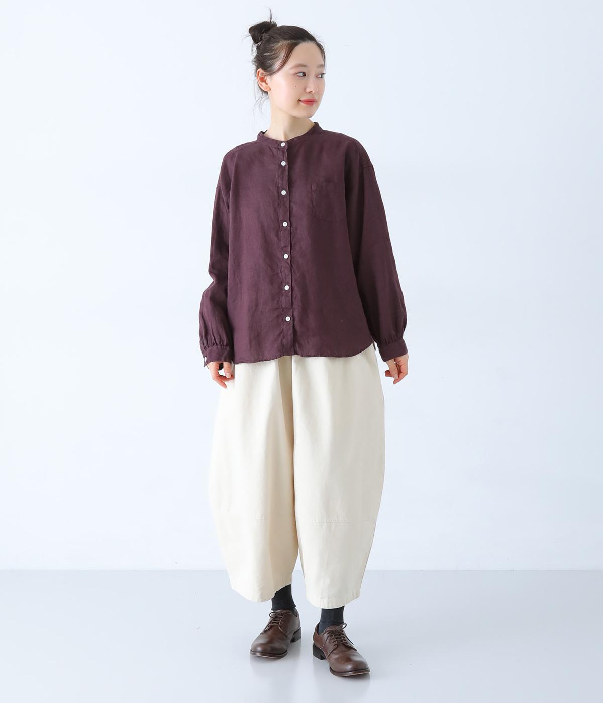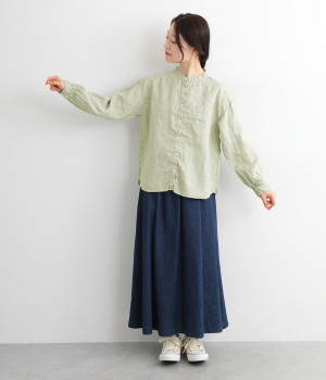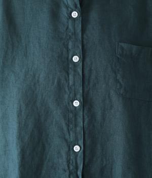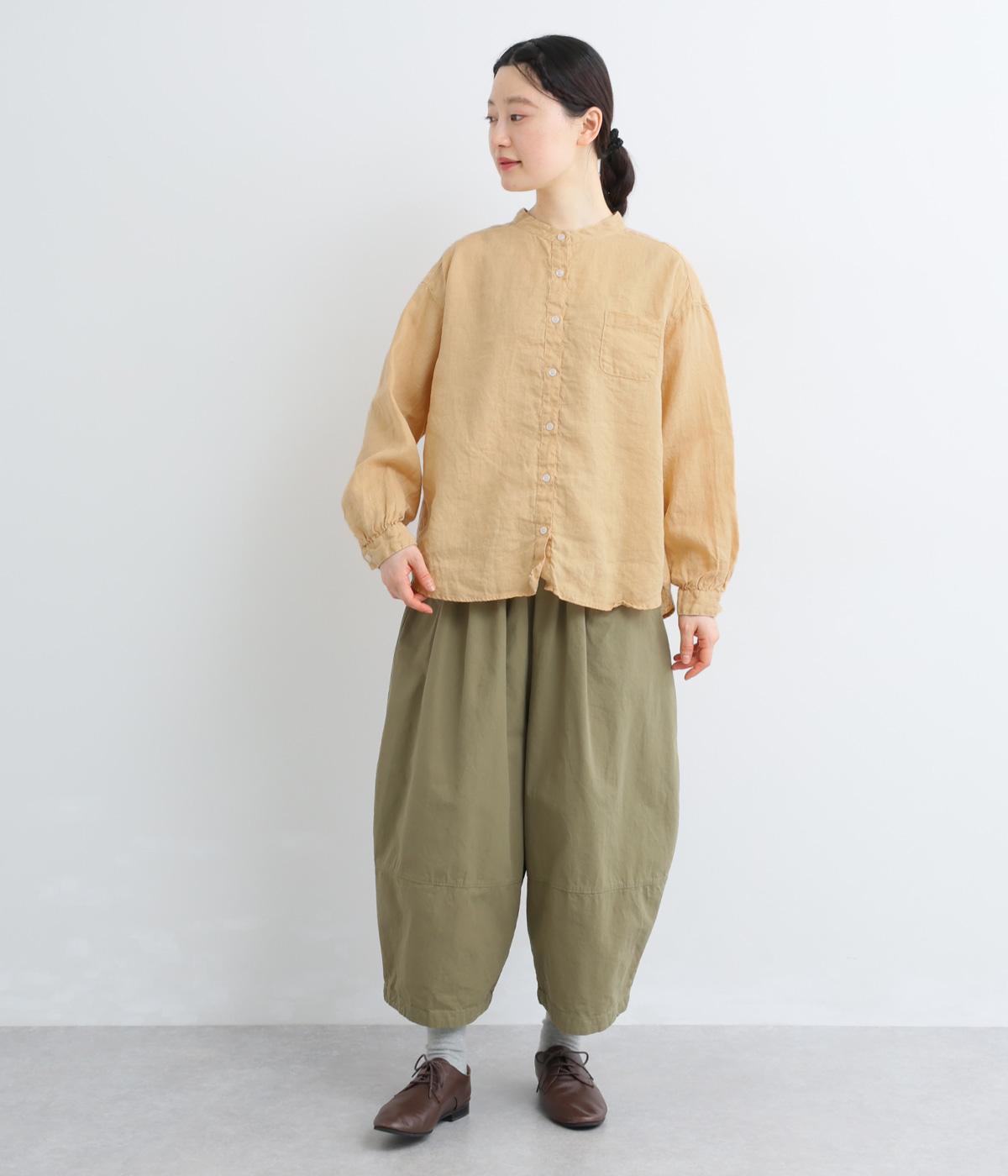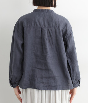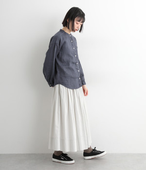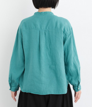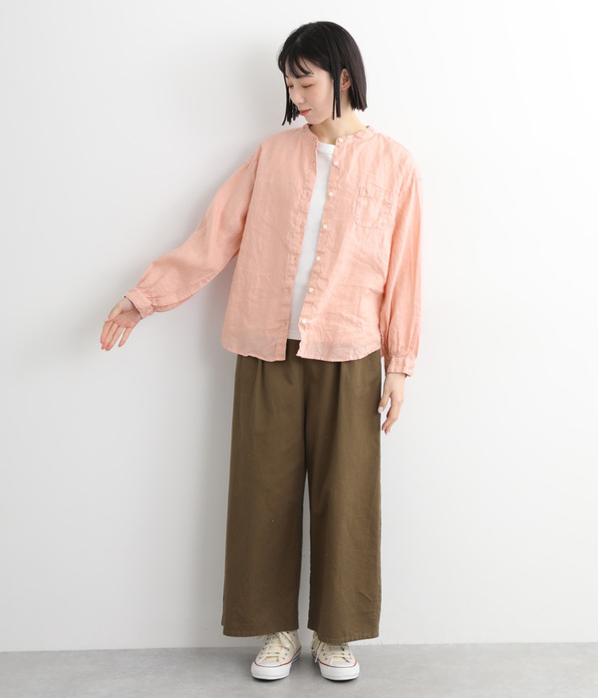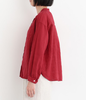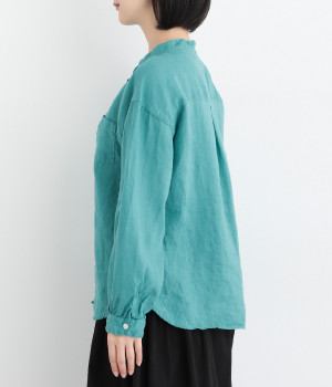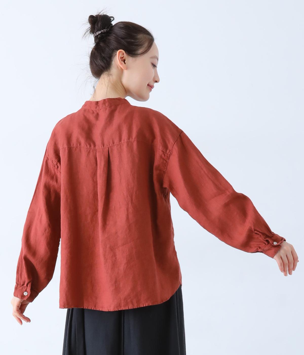 リネン生地の独特な風合いを引き立てたシンプルなシャツ。低めのスタンドカラーと左胸のポケットがきちんと感を添えてくれます。袖口にはギャザーをあしらってフェミニンなポイントに。さまざまなボトムスとなじみやすくする、緩やかに曲線を描くヘムラインも◎です。