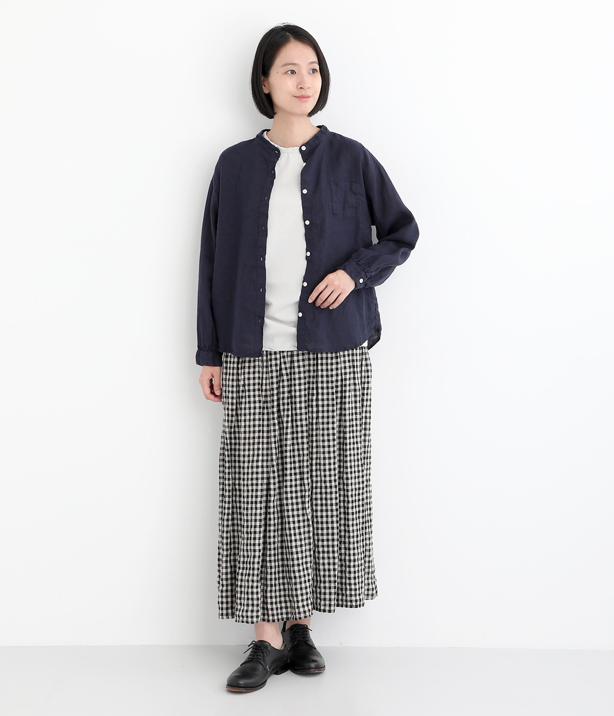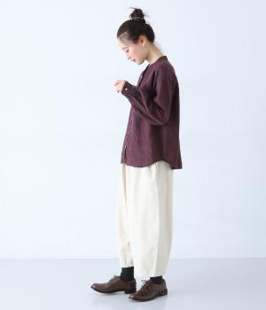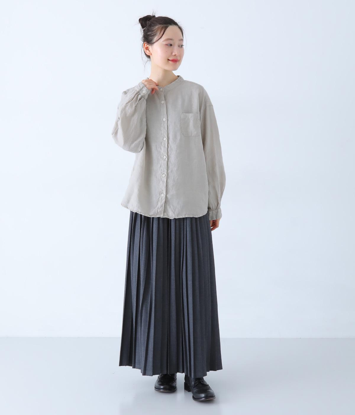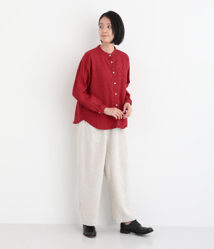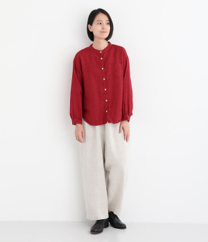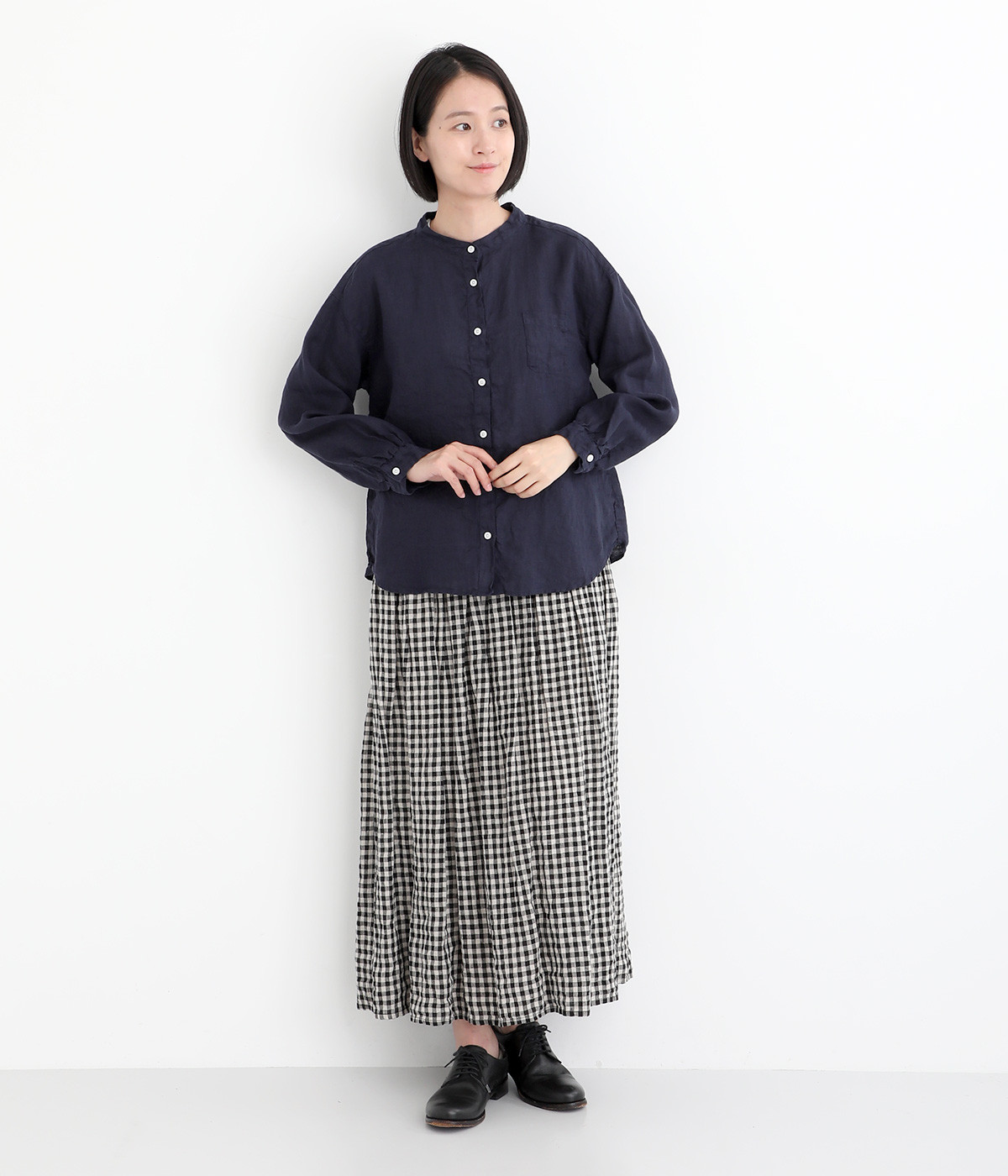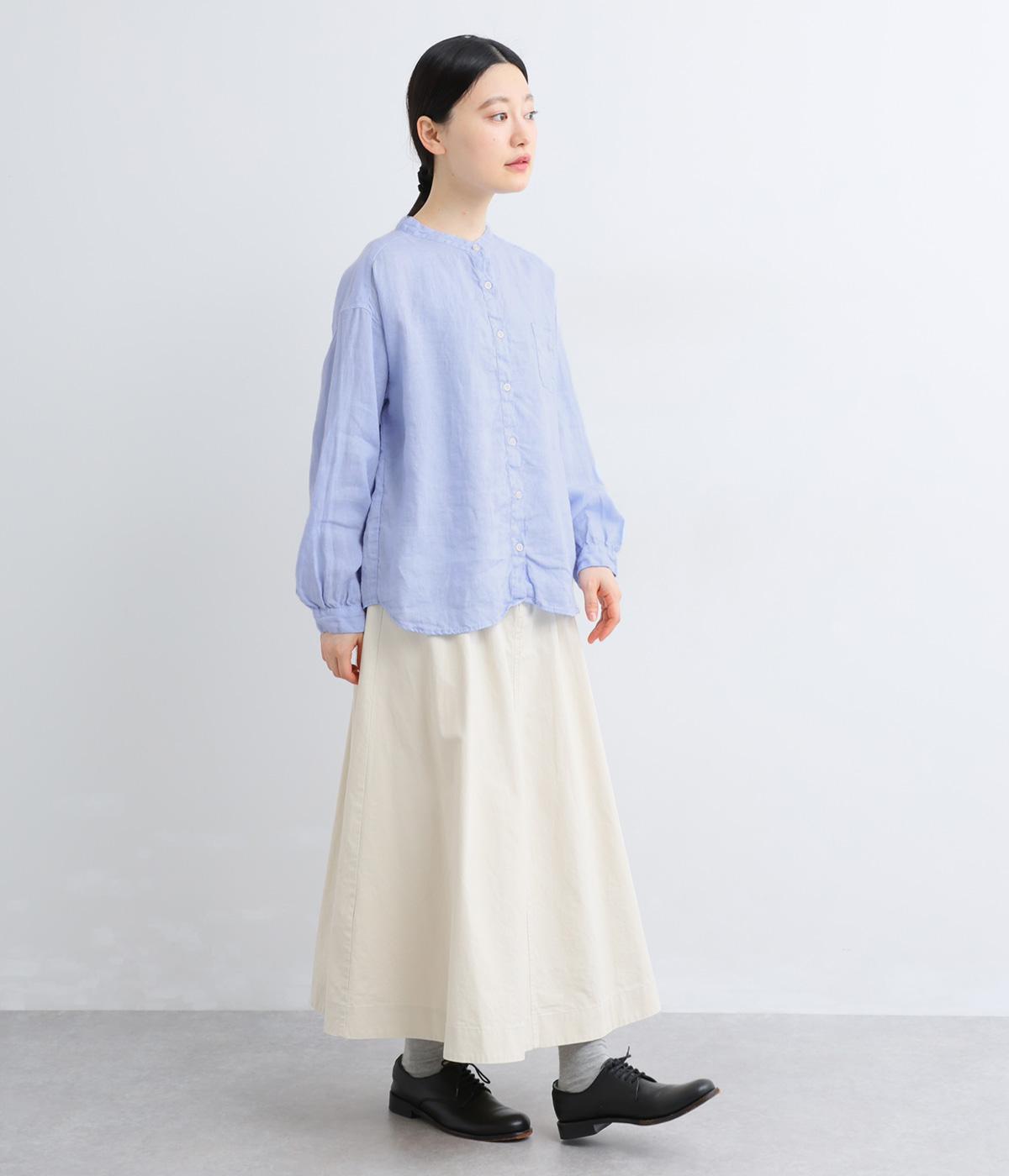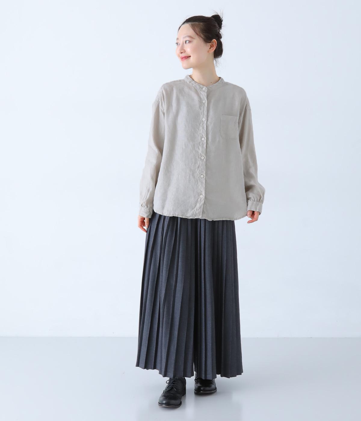 リネン生地の独特な風合いを引き立てたシンプルなシャツ。低めのスタンドカラーと左胸のポケットがきちんと感を添えてくれます。袖口にはギャザーをあしらってフェミニンなポイントに。さまざまなボトムスとなじみやすくする、緩やかに曲線を描くヘムラインも◎です。