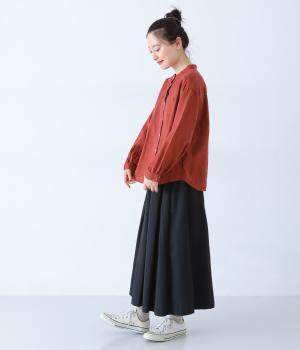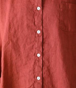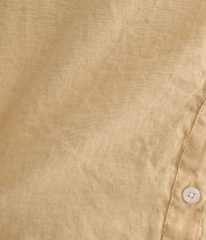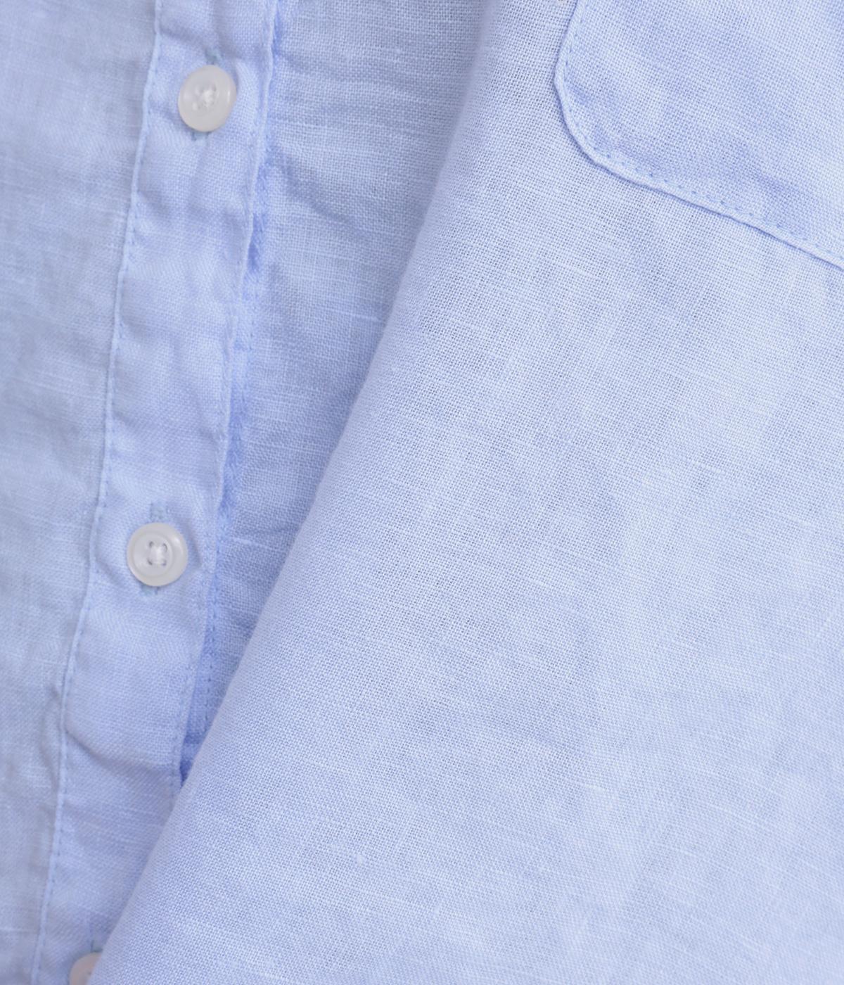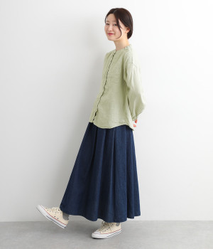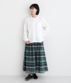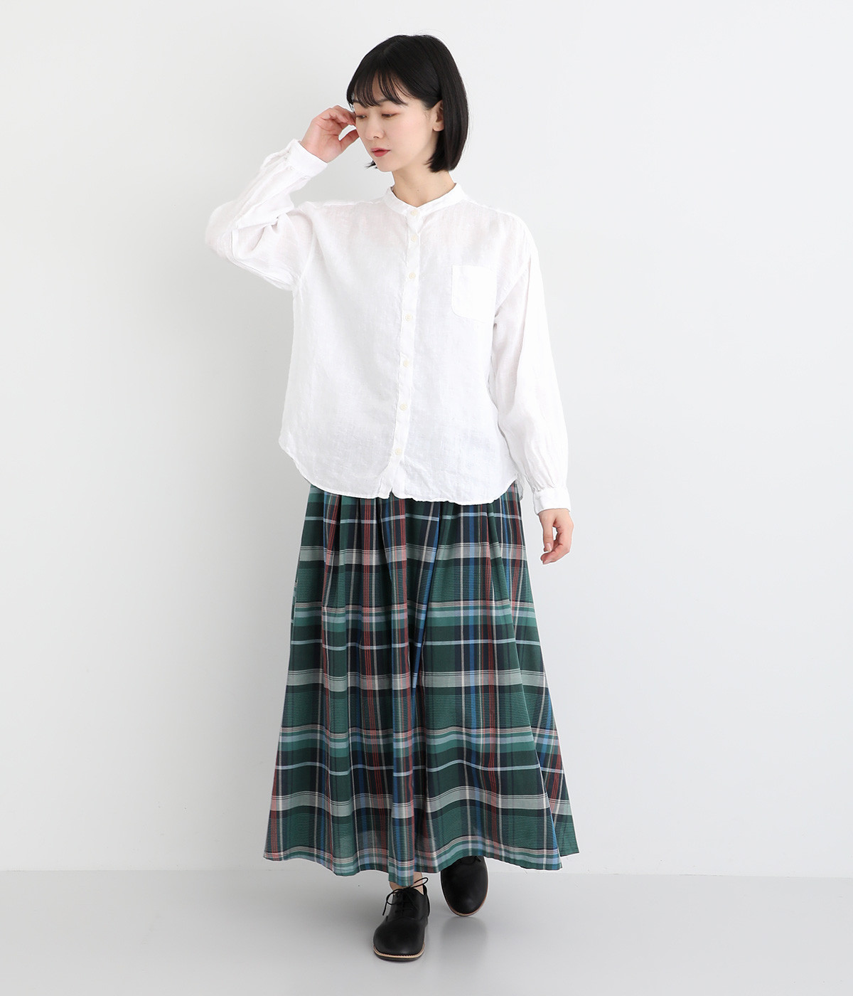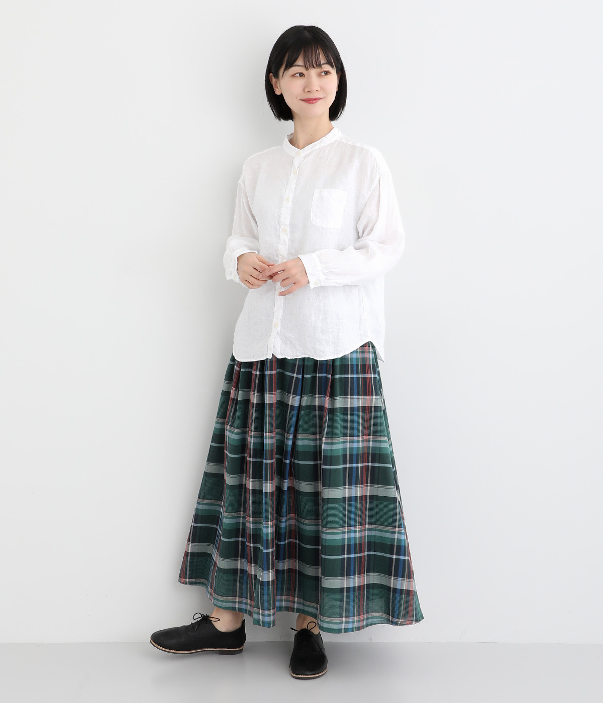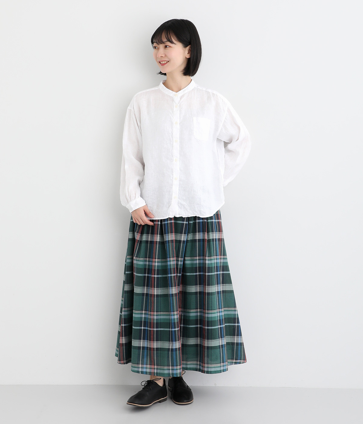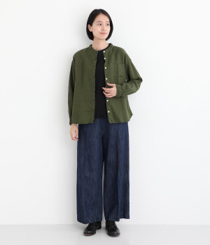 リネン生地の独特な風合いを引き立てたシンプルなシャツ。低めのスタンドカラーと左胸のポケットがきちんと感を添えてくれます。袖口にはギャザーをあしらってフェミニンなポイントに。さまざまなボトムスとなじみやすくする、緩やかに曲線を描くヘムラインも◎です。