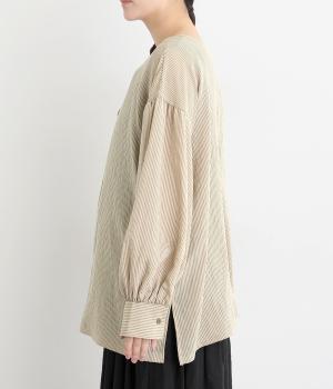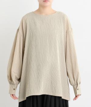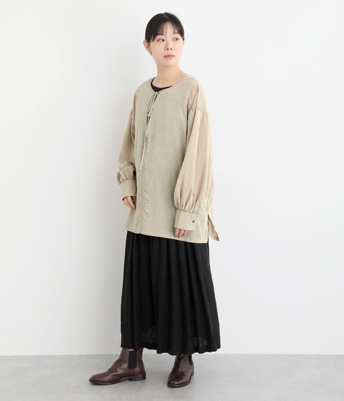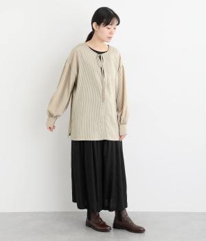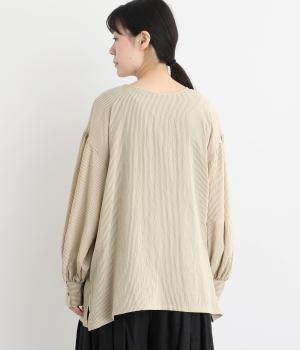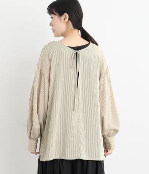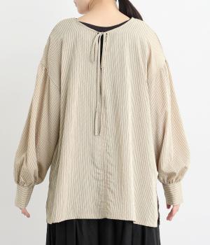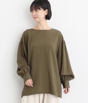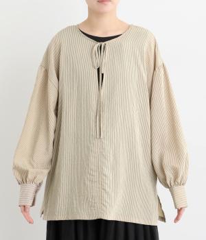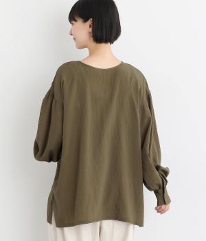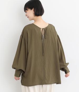 ゆったりとしたシルエットにふわりとボリュームをつけた袖が特徴のブラウス。シンプルなラウンドネックと深いキーネック、どちらもたのしめる前後2way仕様。紐リボンは長さを取っているので軽く首に巻きつけたアレンジもおすすめ。
