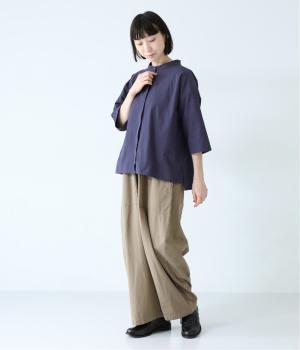 アイスグレーのシャツにプリーツパンツを合わせて、女性らしく上品な印象に。