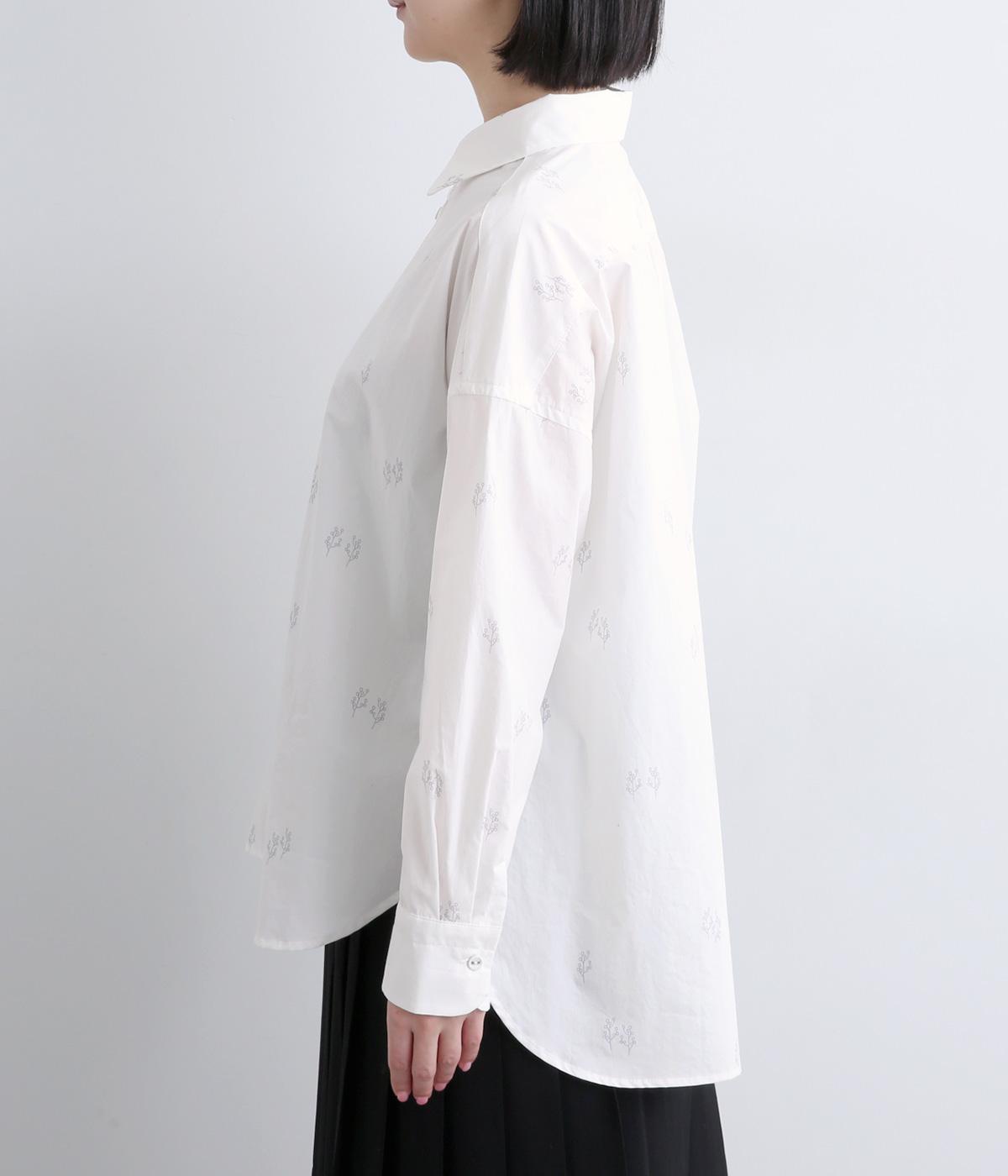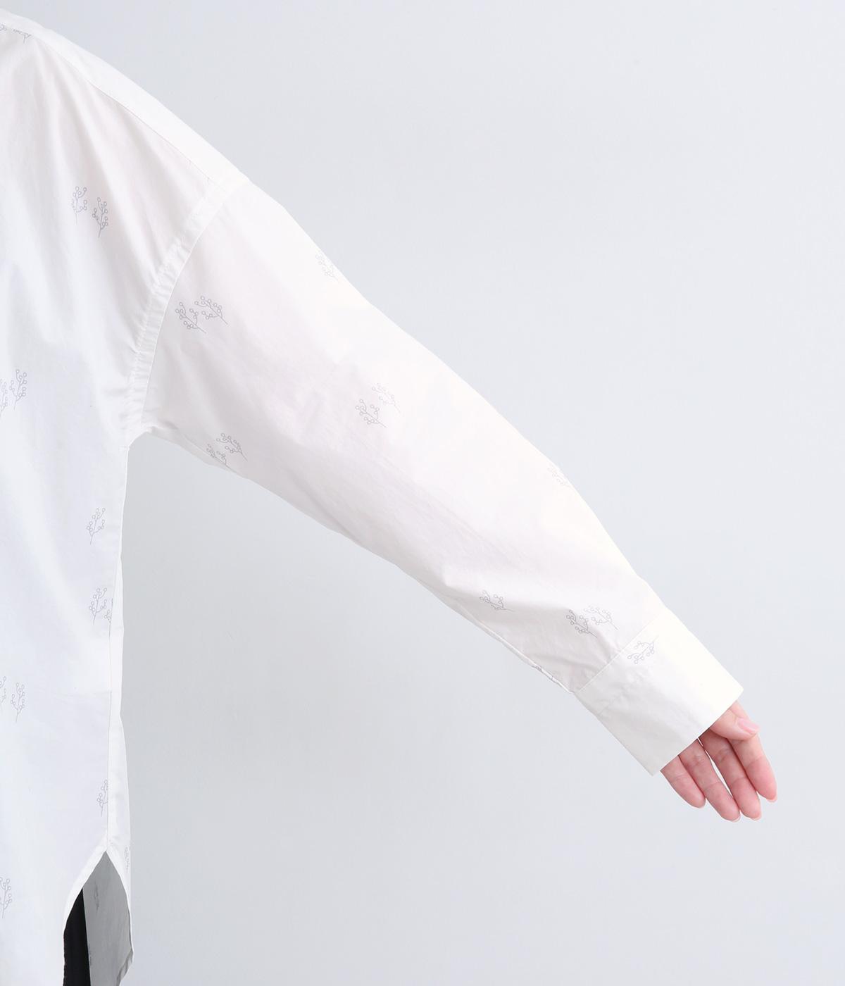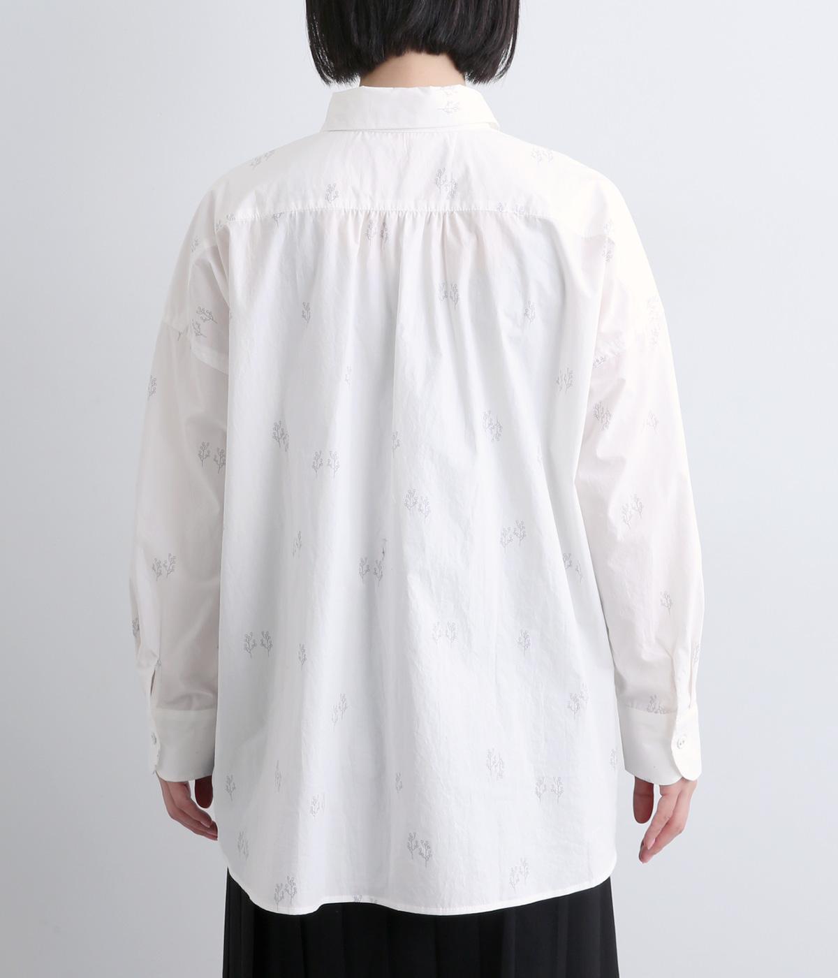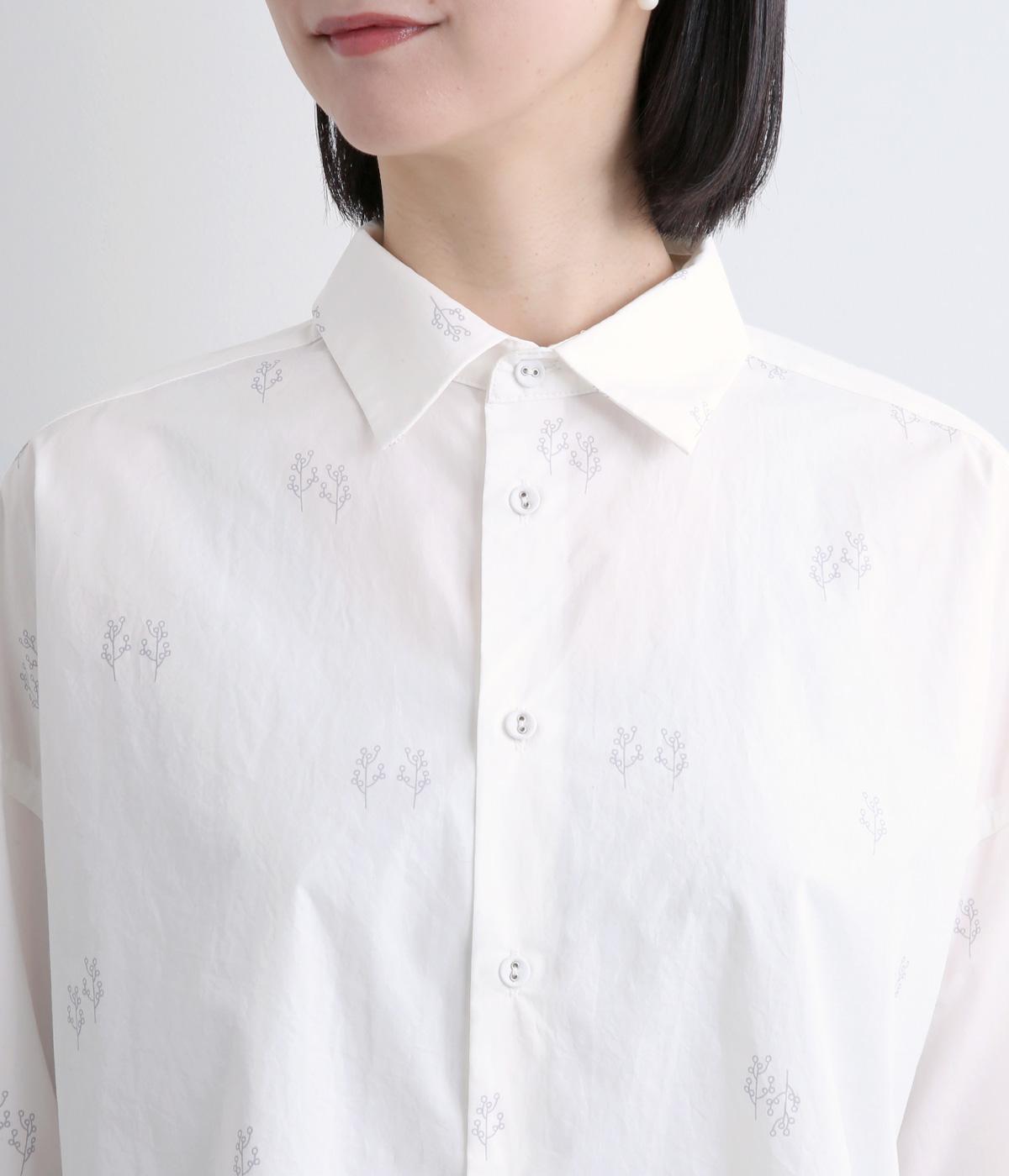 メンズライクなオーバーサイズのシャツに小さなユーカリ模様でかわいらしさをミックスしました。前後差をつけた裾がニュアンスを添えて、パンツスタイルにもスカートにもなじみます。