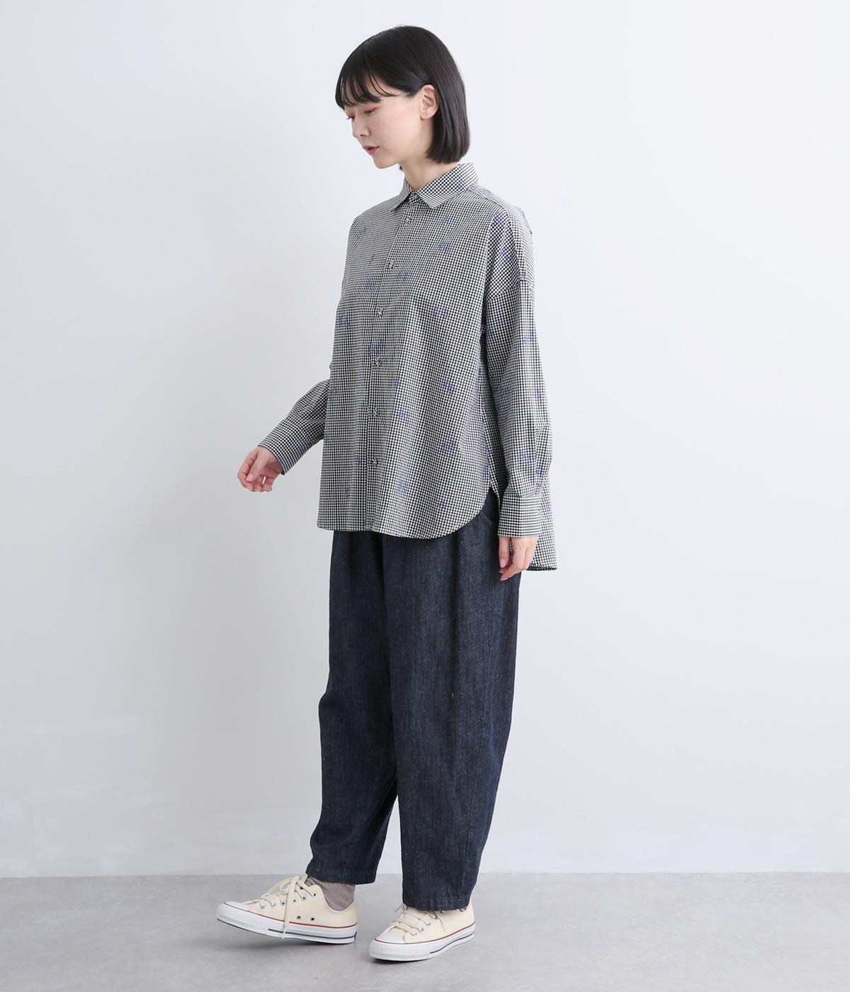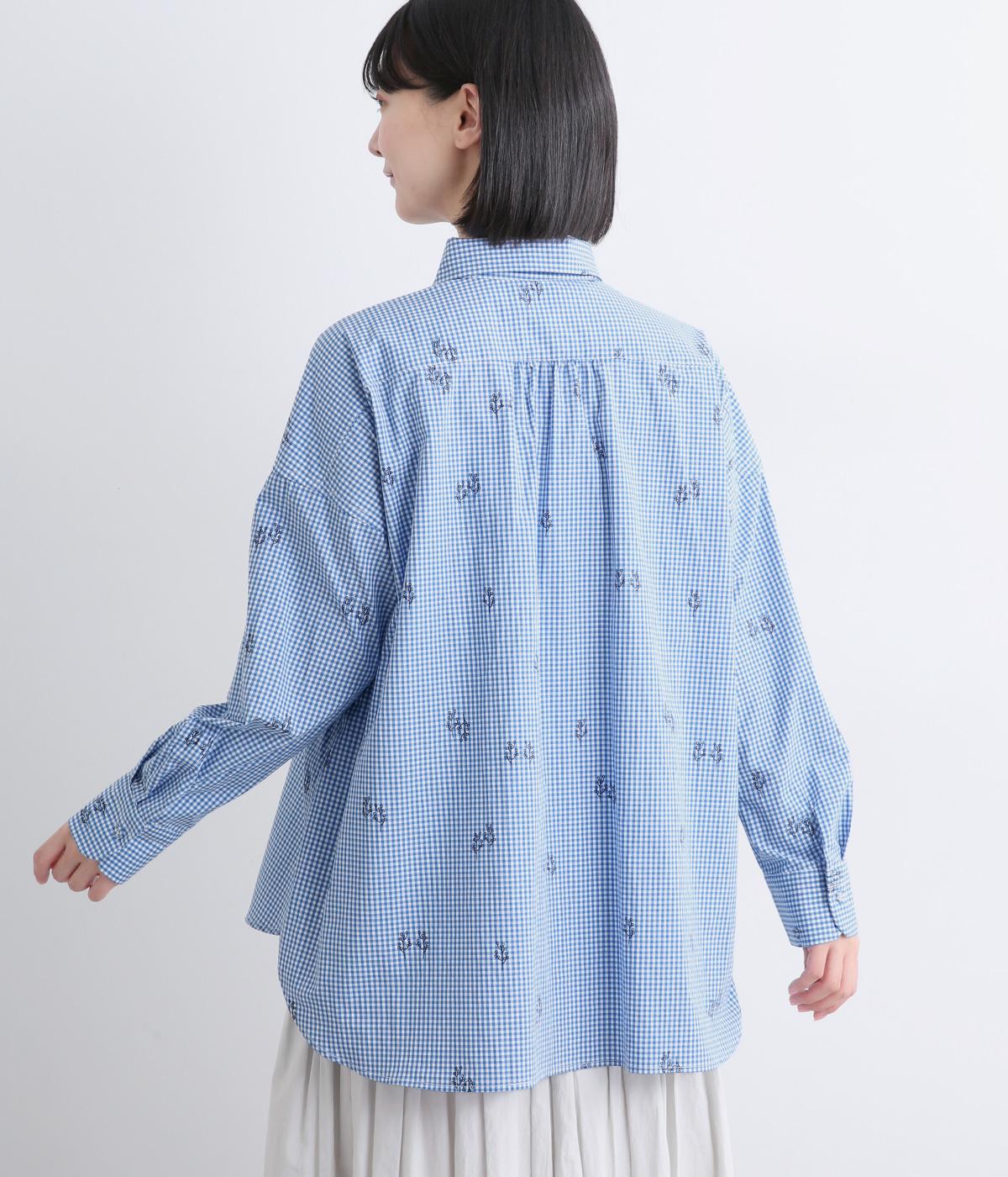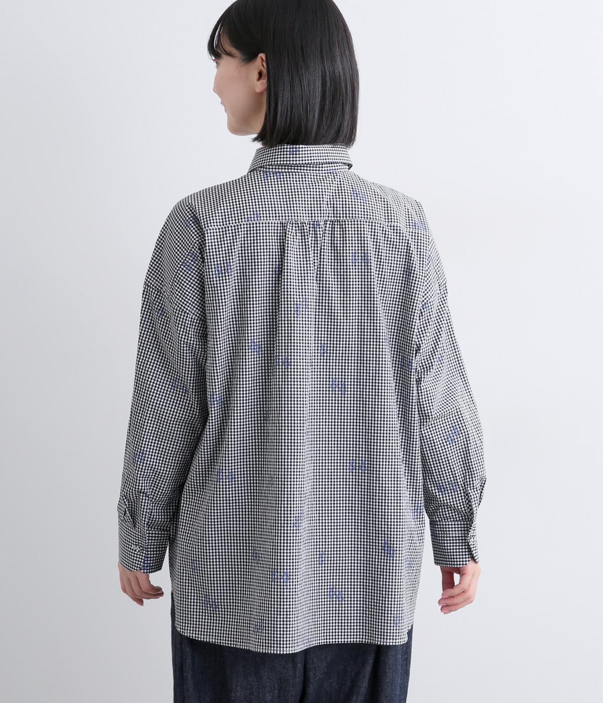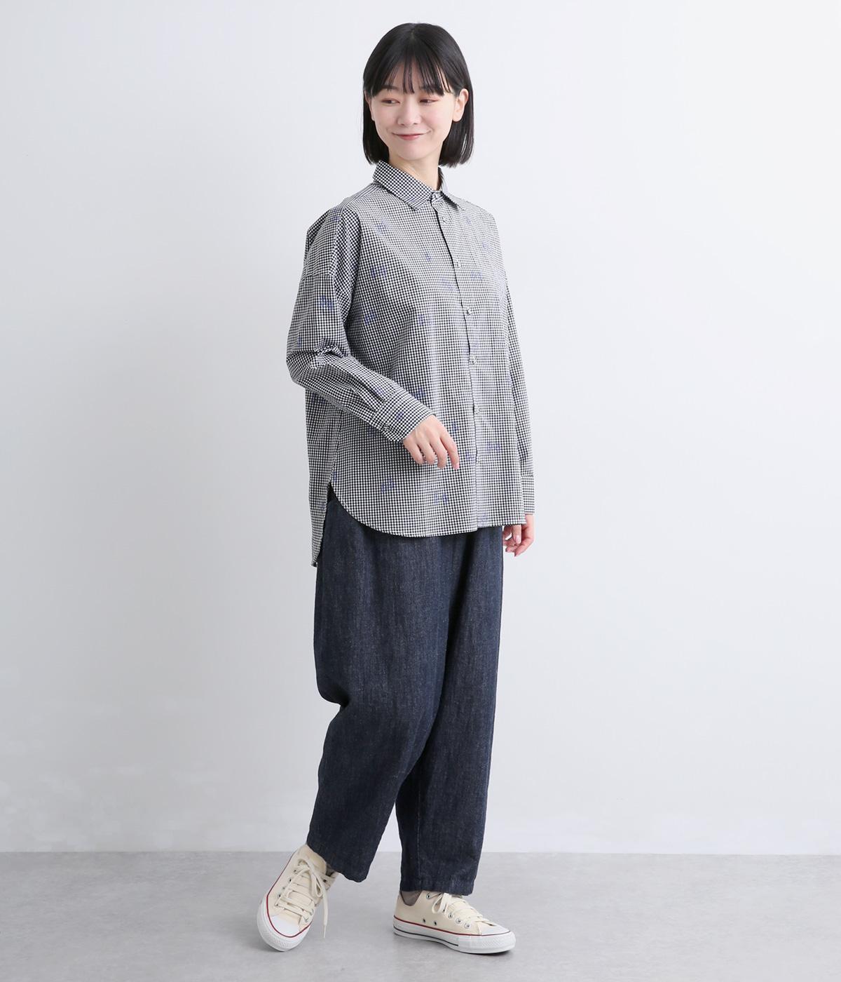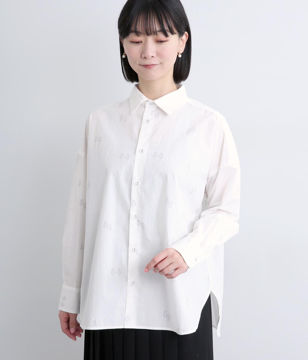メンズライクなオーバーサイズのシャツに小さなユーカリ模様でかわいらしさをミックスしました。前後差をつけた裾がニュアンスを添えて、パンツスタイルにもスカートにもなじみます。