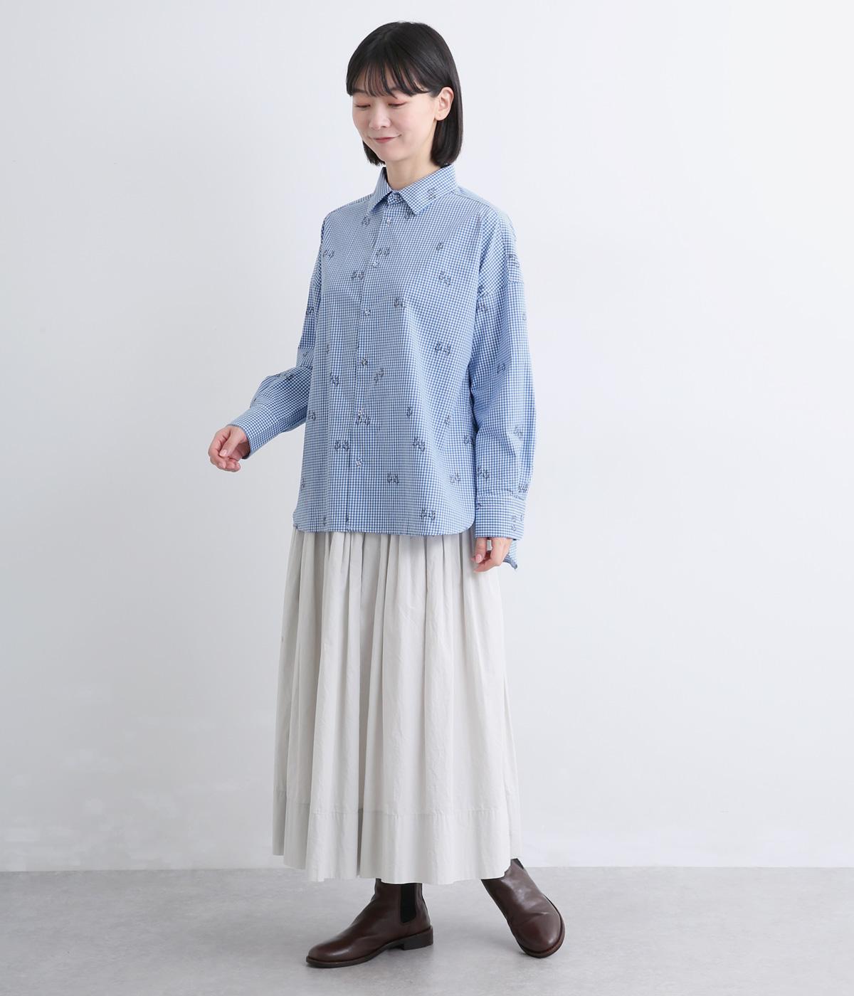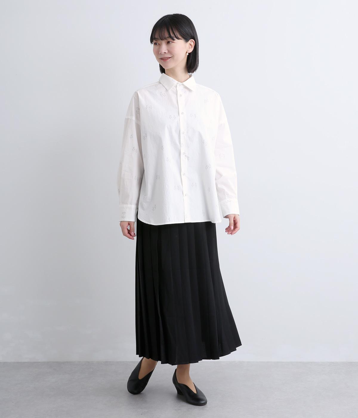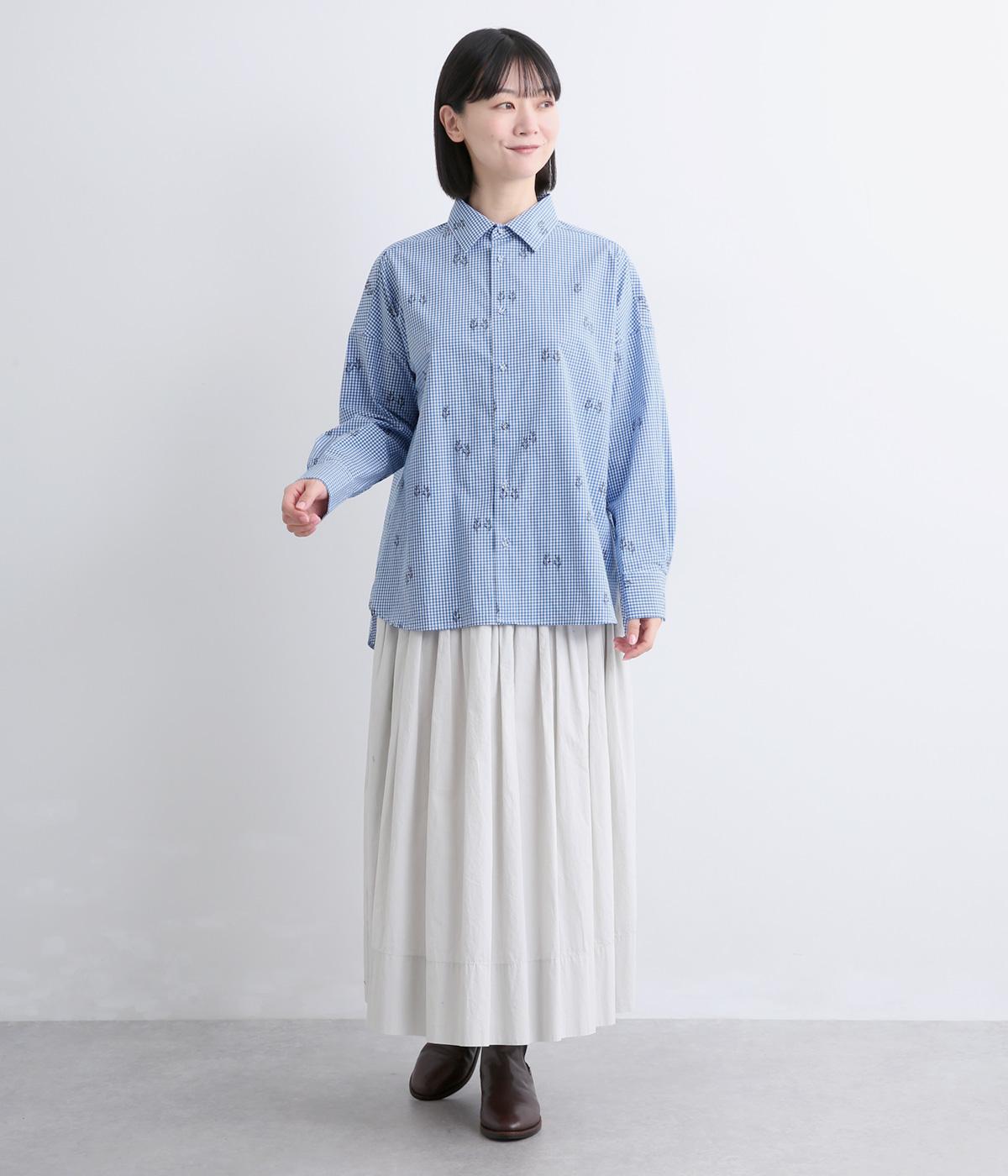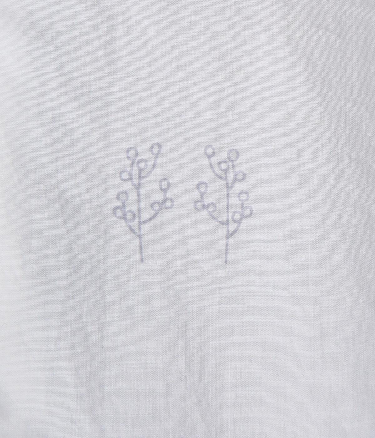 メンズライクなオーバーサイズのシャツに小さなユーカリ模様でかわいらしさをミックスしました。前後差をつけた裾がニュアンスを添えて、パンツスタイルにもスカートにもなじみます。