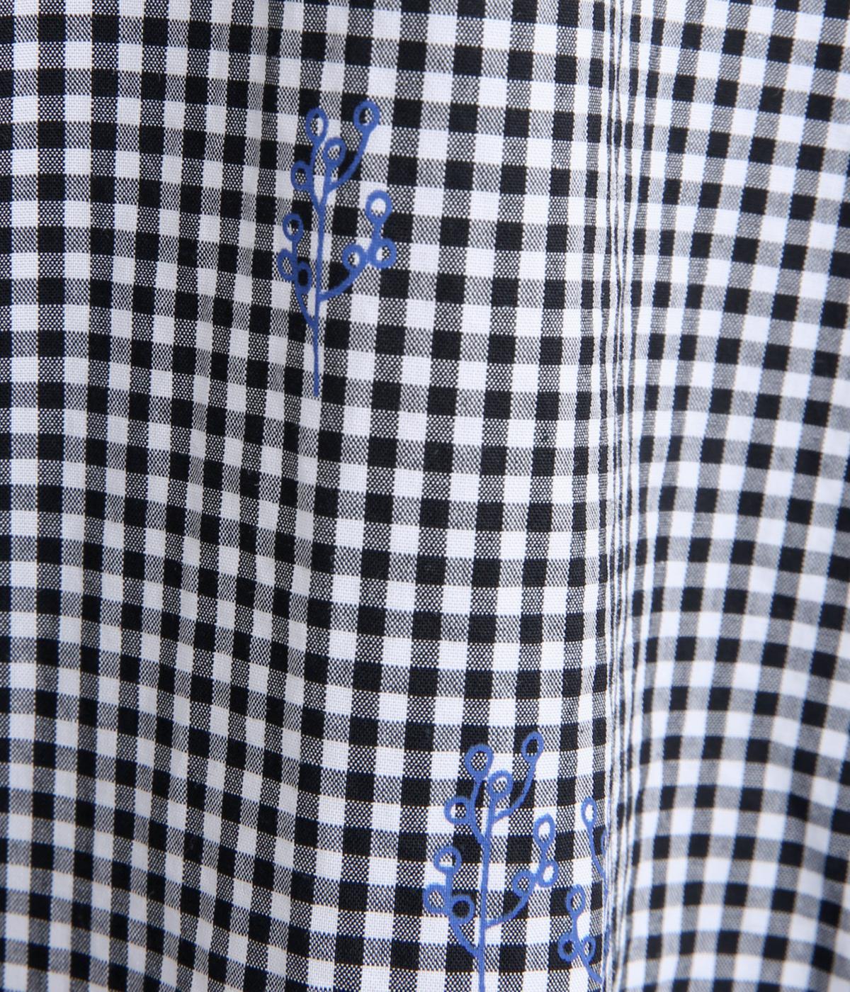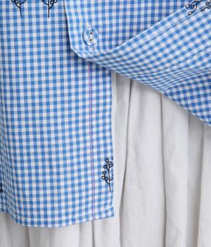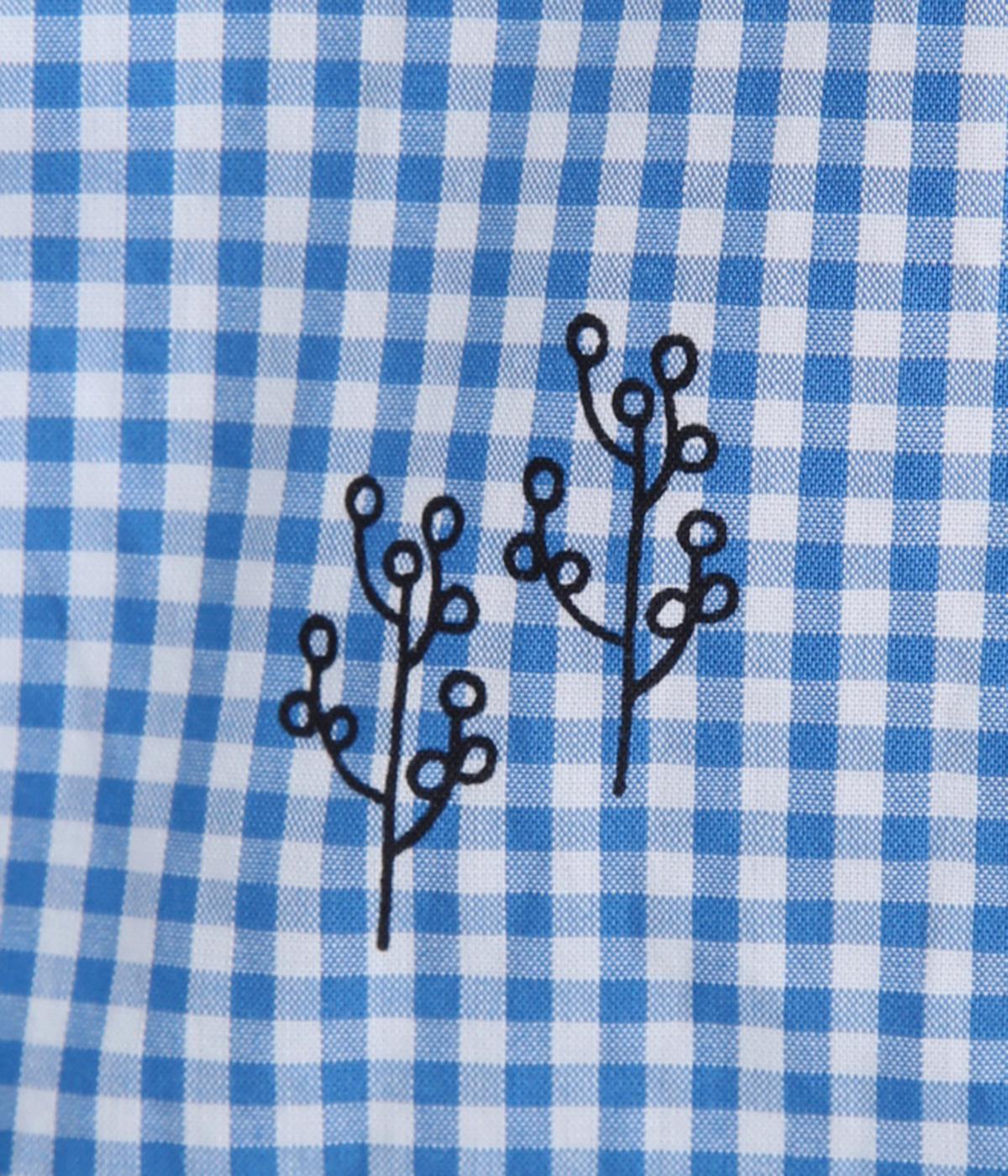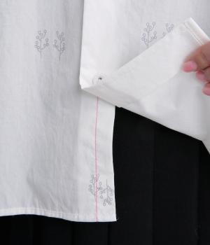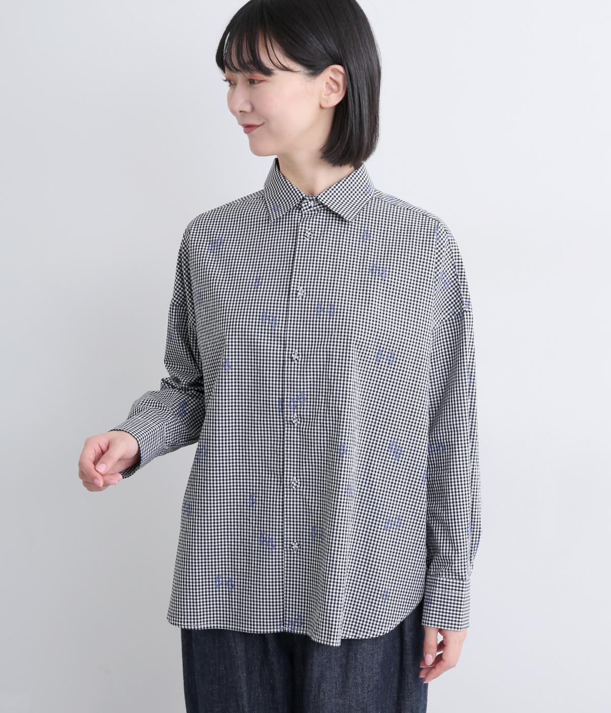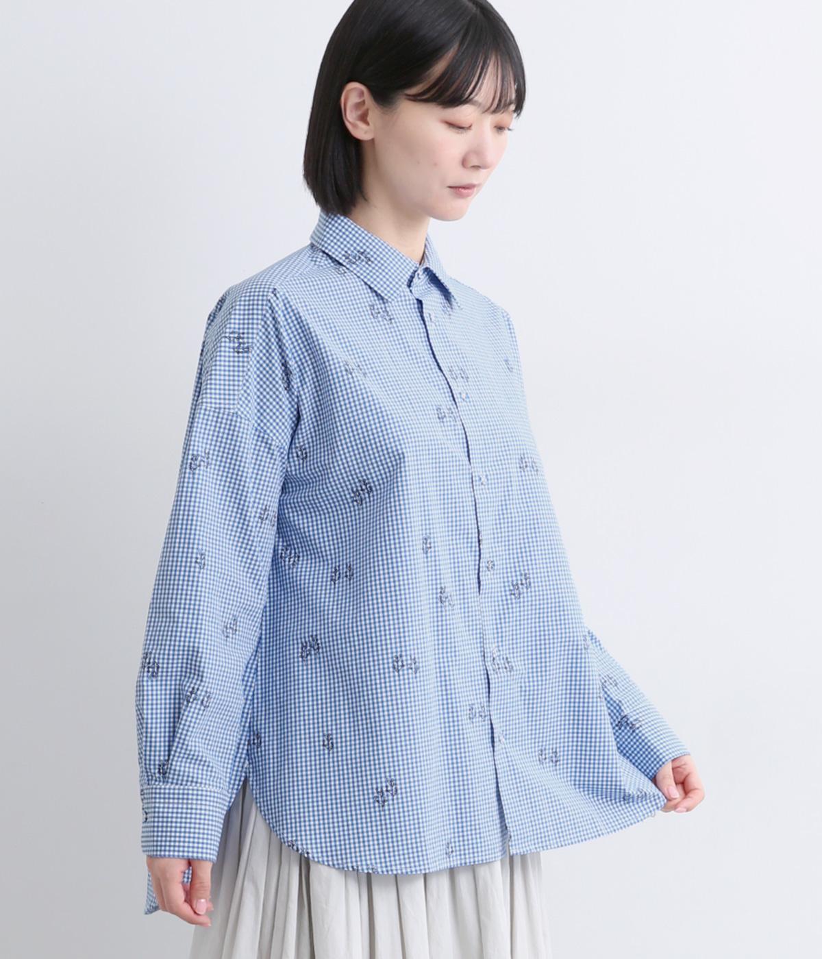 メンズライクなオーバーサイズのシャツに小さなユーカリ模様でかわいらしさをミックスしました。前後差をつけた裾がニュアンスを添えて、パンツスタイルにもスカートにもなじみます。
