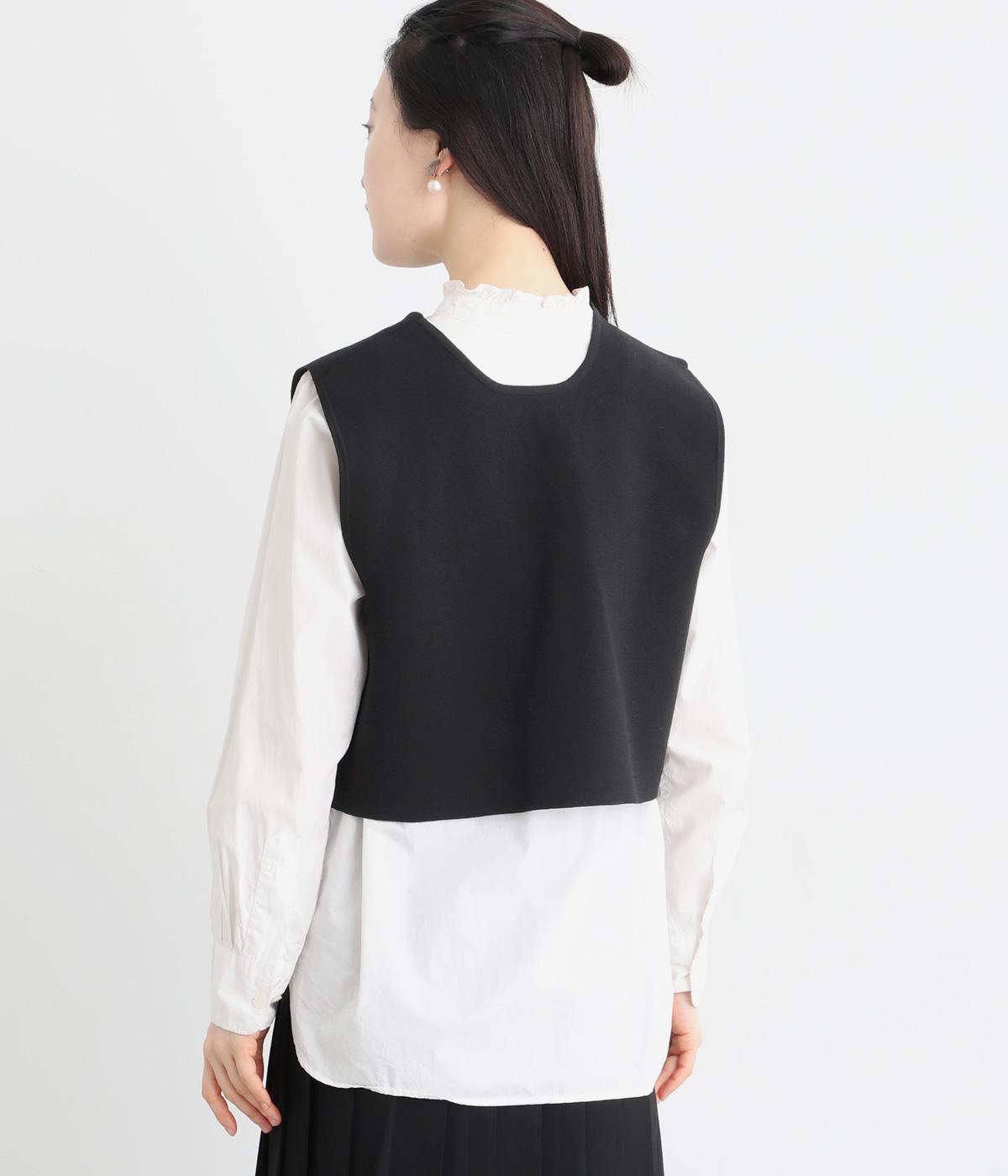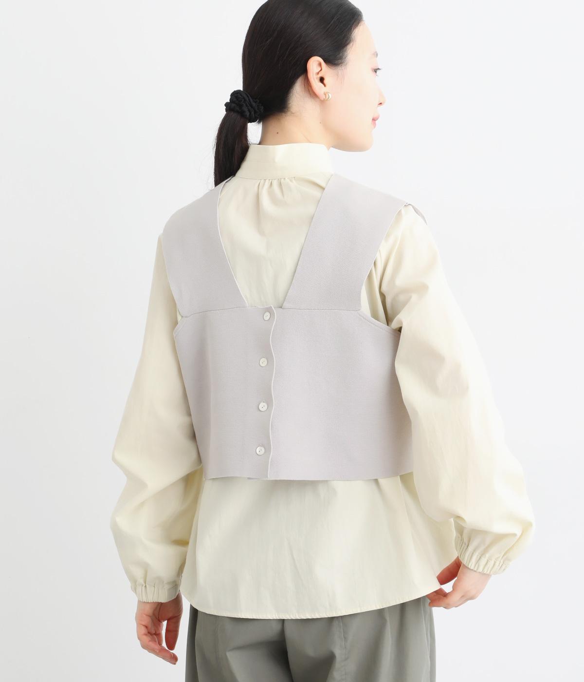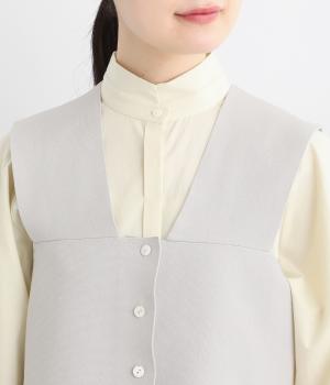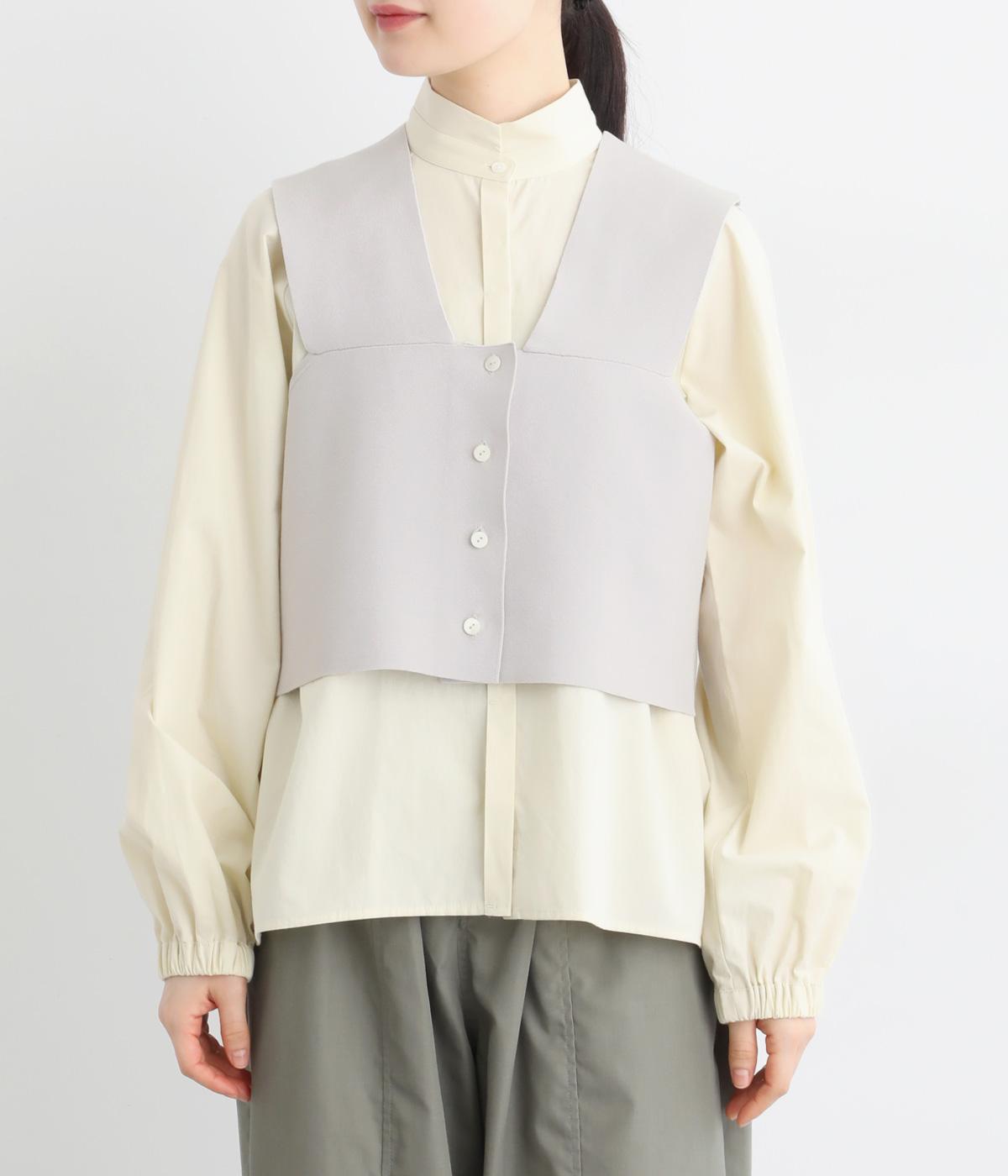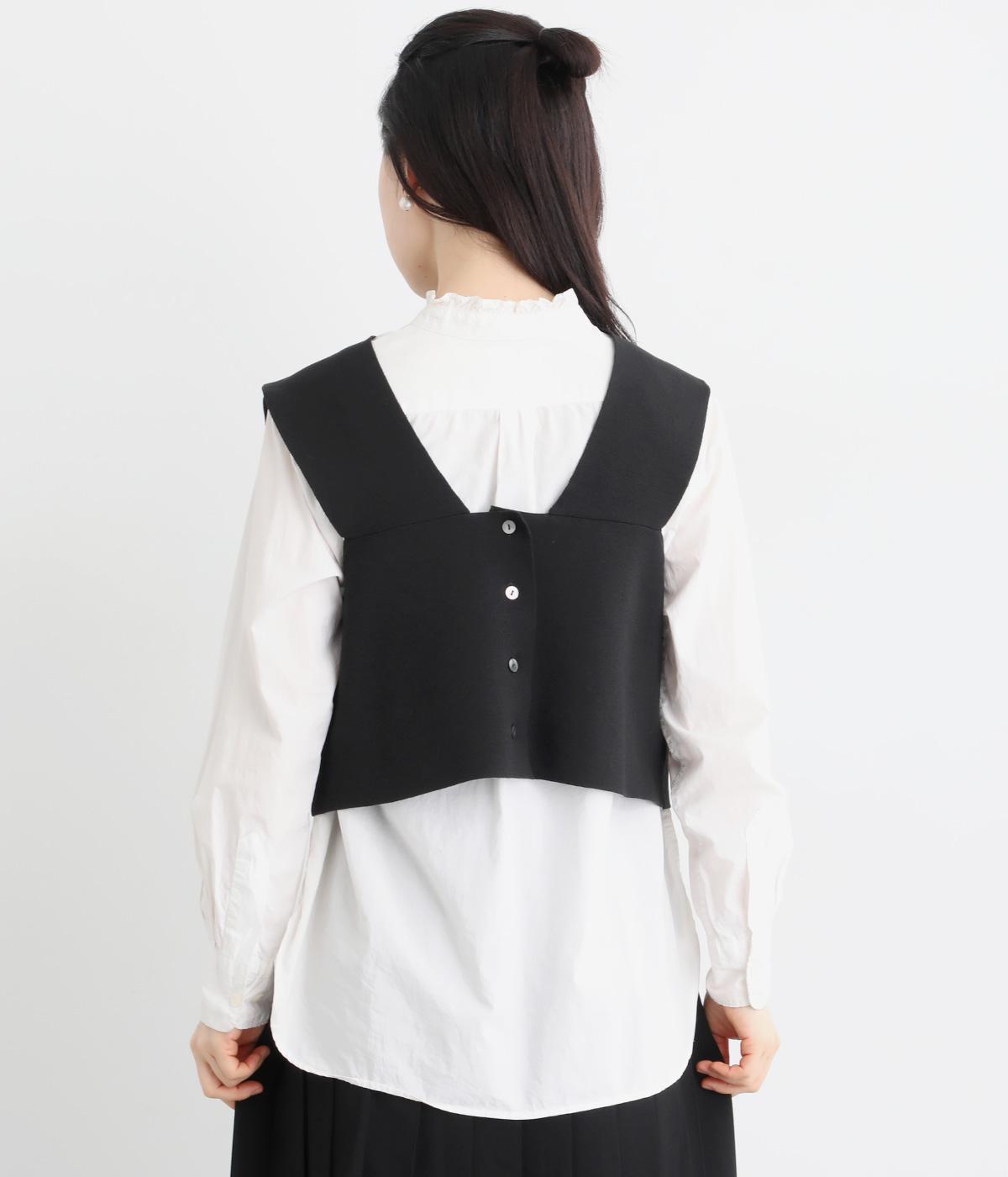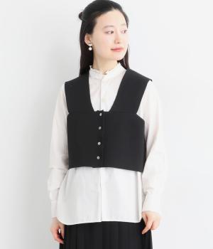 シンプルな装いに奥行きを添える、ビスチェ風のベストです。前後2way仕様で、ボタン面で軽やかなレイヤードをたのしんだり、ネックの詰まった面で落ち着いた印象に仕上げたりと、着こなしの表情を変えられるのが魅力。コンパクトな丈感で、ワンピースやトップスに重ねやすく、ロングシーズン活躍する一枚です。