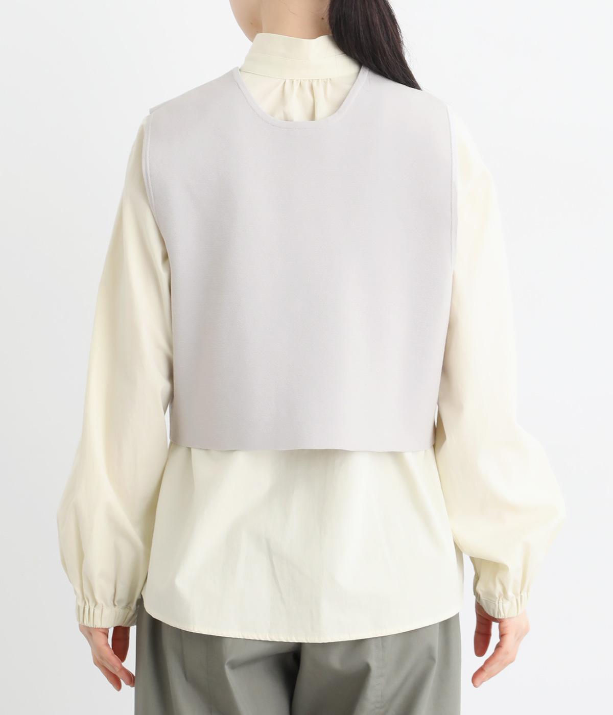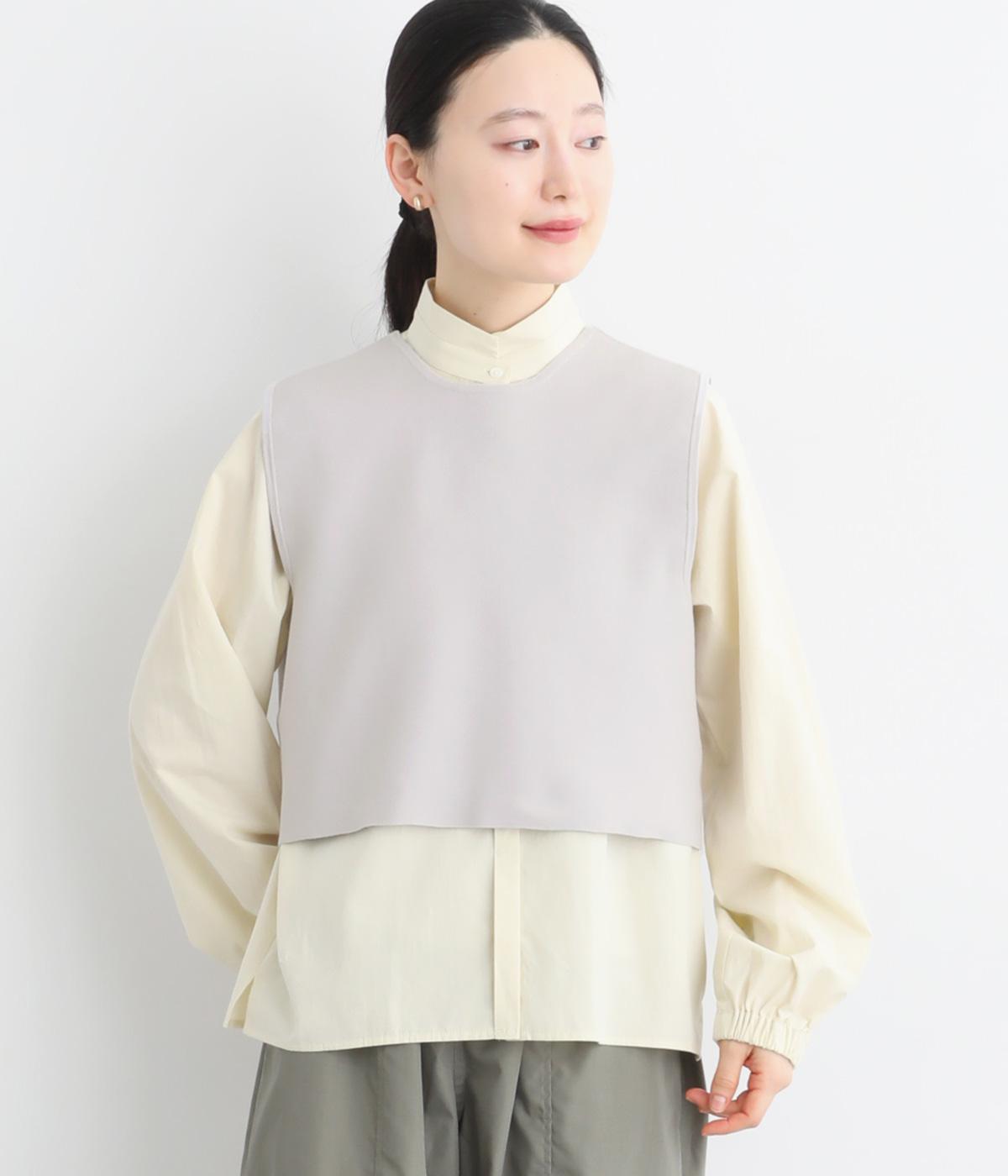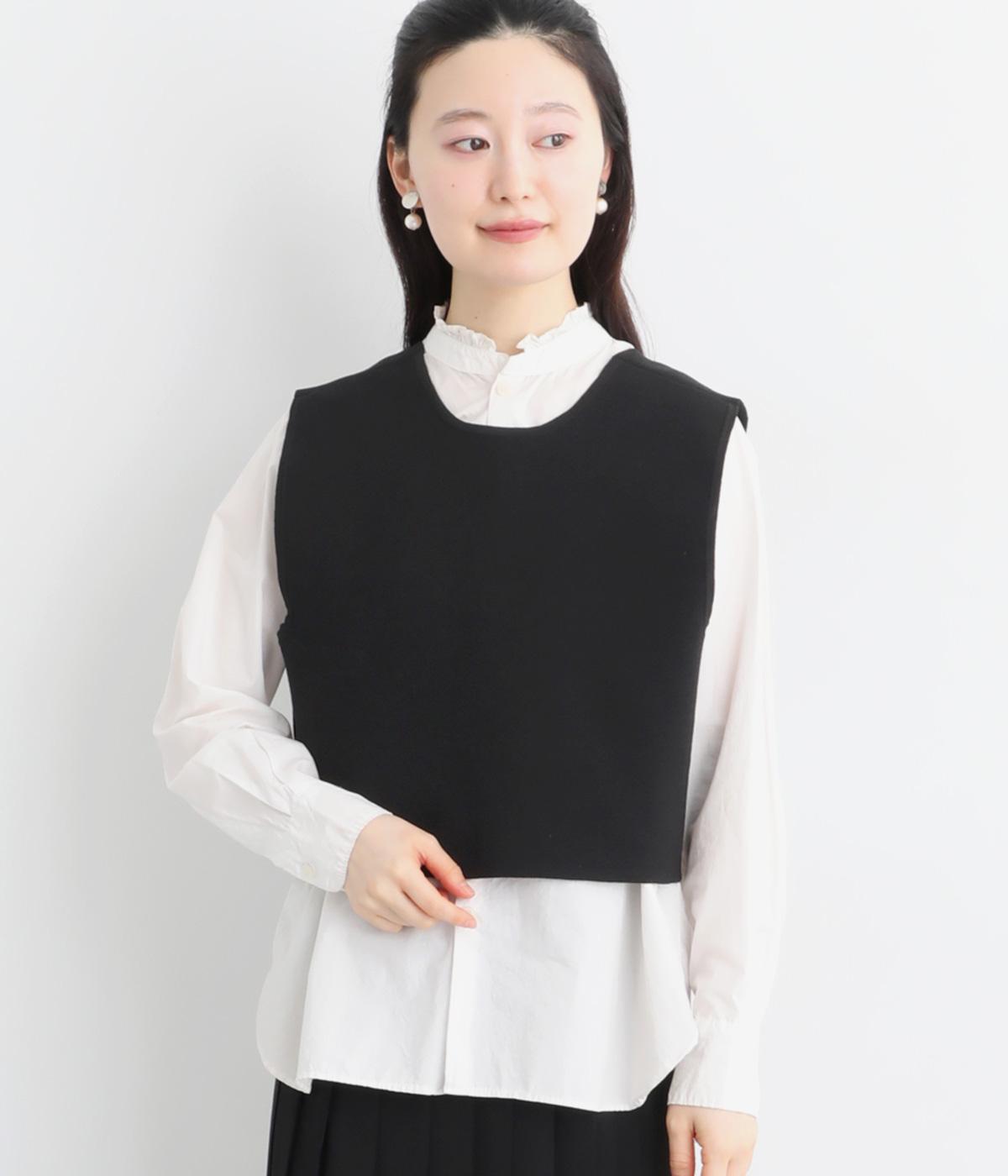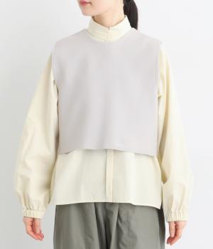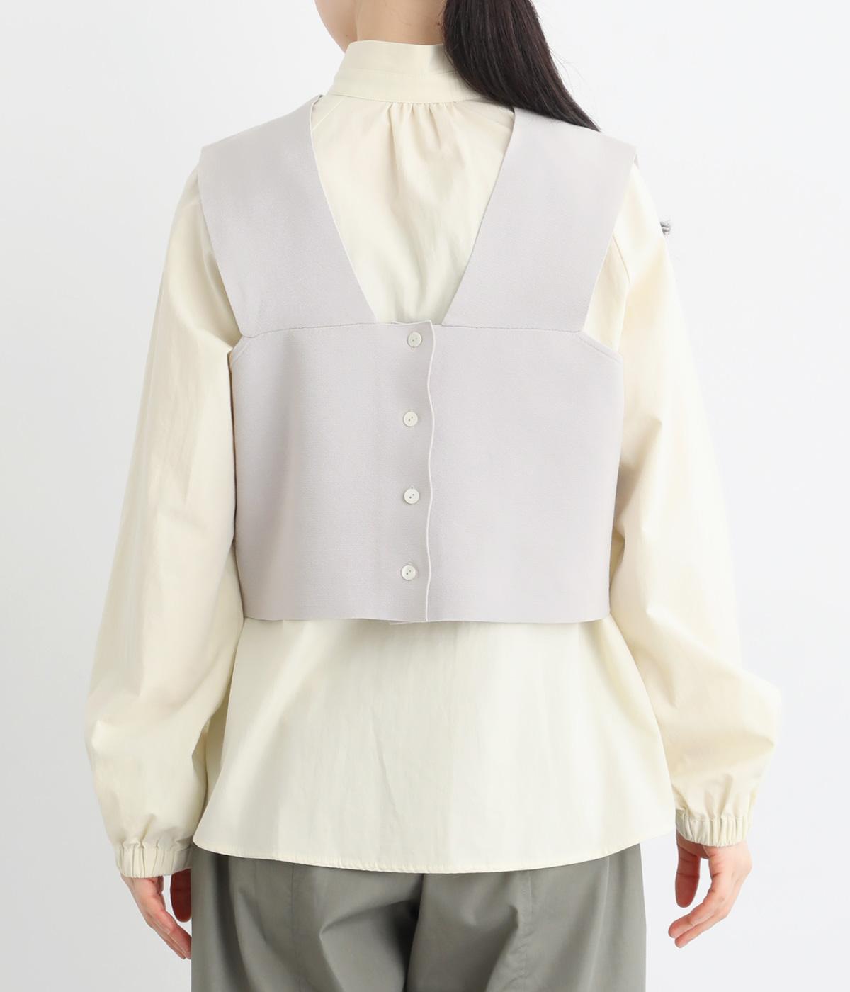 シンプルな装いに奥行きを添える、ビスチェ風のベストです。前後2way仕様で、ボタン面で軽やかなレイヤードをたのしんだり、ネックの詰まった面で落ち着いた印象に仕上げたりと、着こなしの表情を変えられるのが魅力。コンパクトな丈感で、ワンピースやトップスに重ねやすく、ロングシーズン活躍する一枚です。