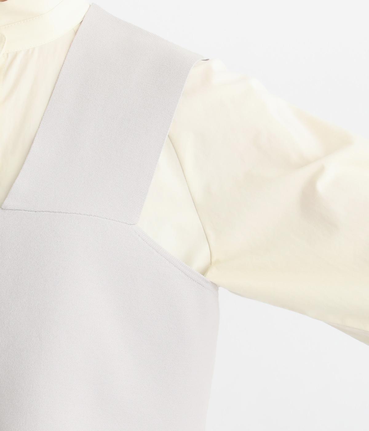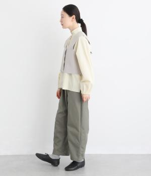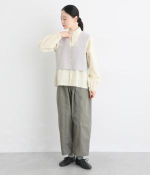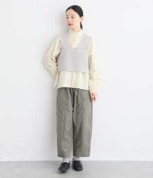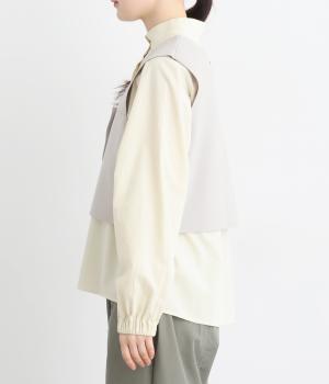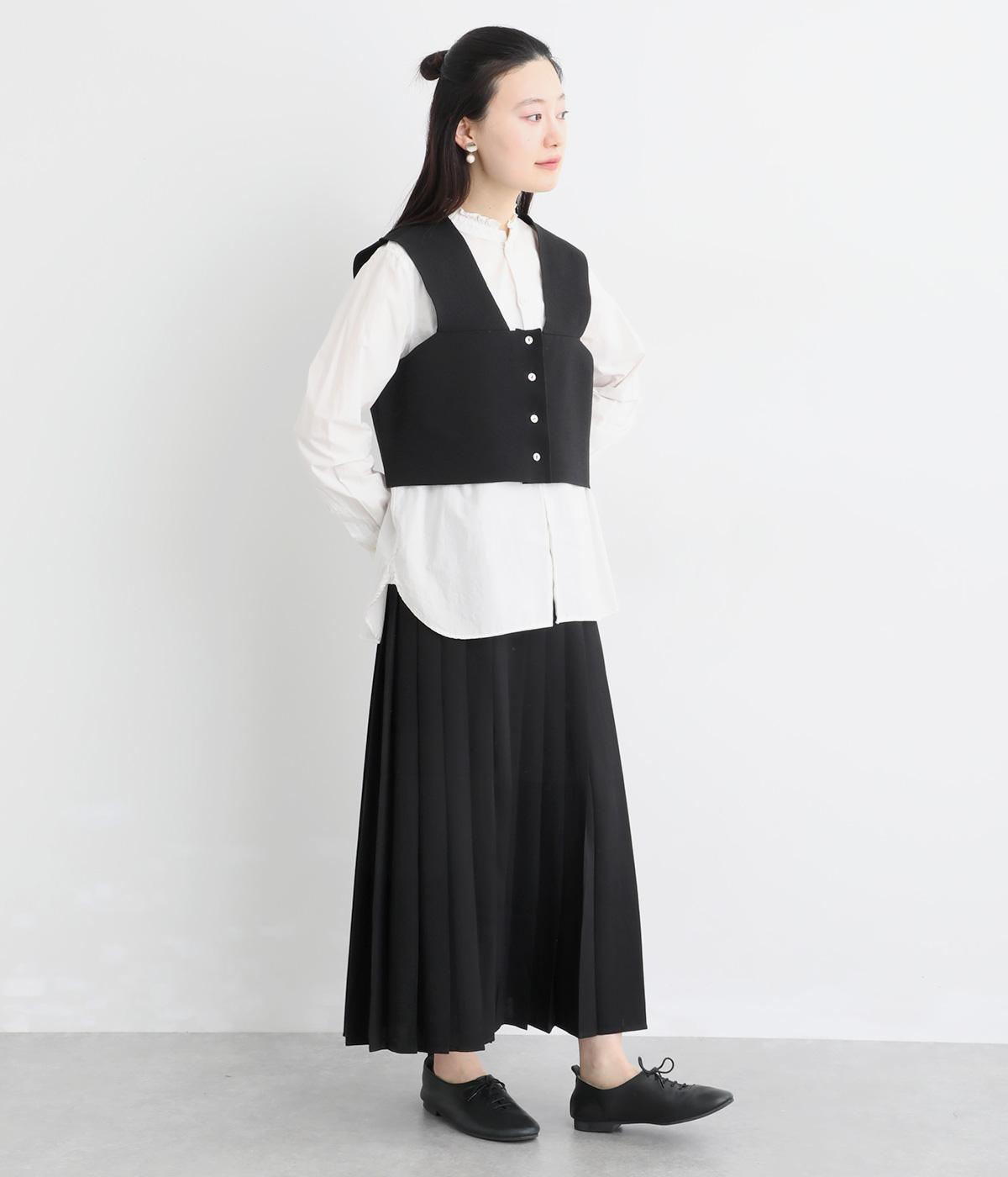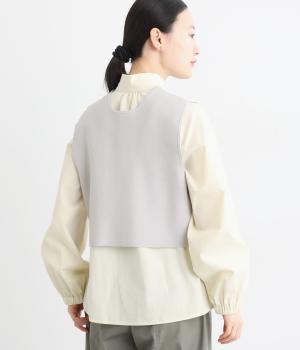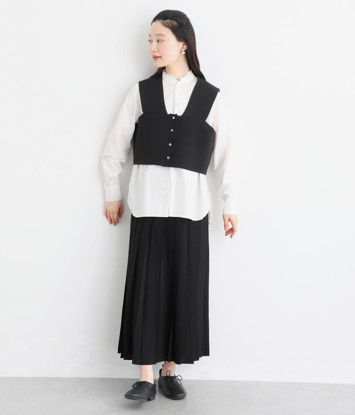 シンプルな装いに奥行きを添える、ビスチェ風のベストです。前後2way仕様で、ボタン面で軽やかなレイヤードをたのしんだり、ネックの詰まった面で落ち着いた印象に仕上げたりと、着こなしの表情を変えられるのが魅力。コンパクトな丈感で、ワンピースやトップスに重ねやすく、ロングシーズン活躍する一枚です。