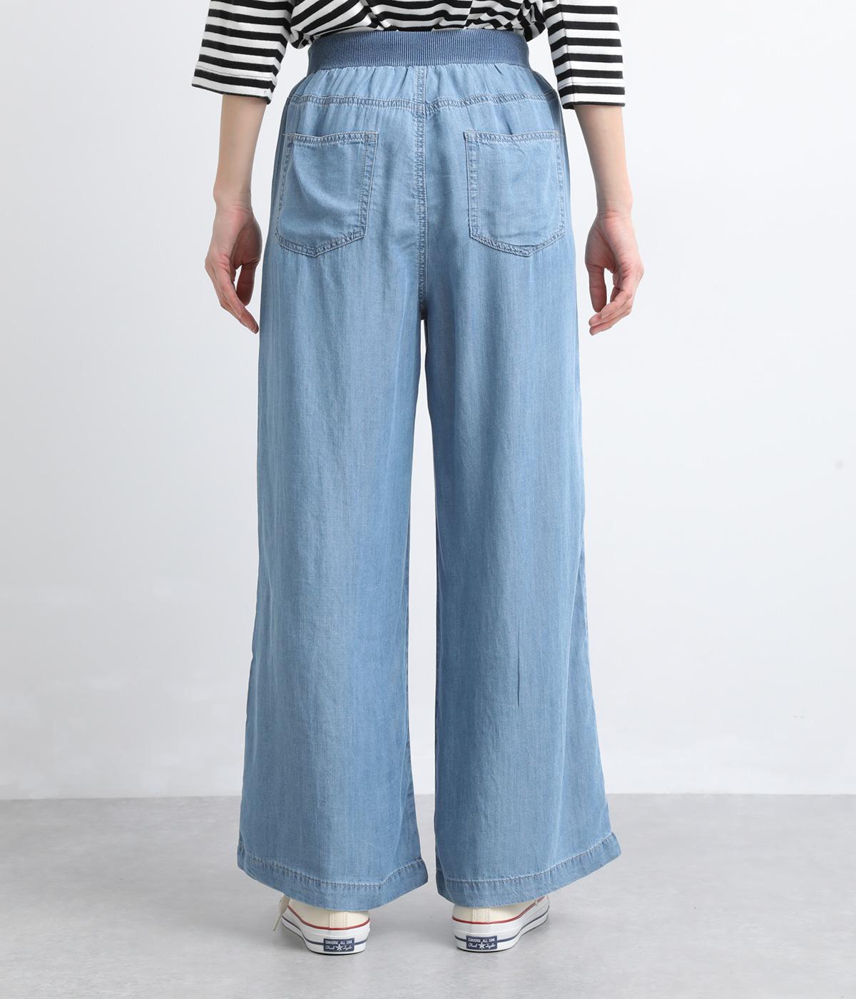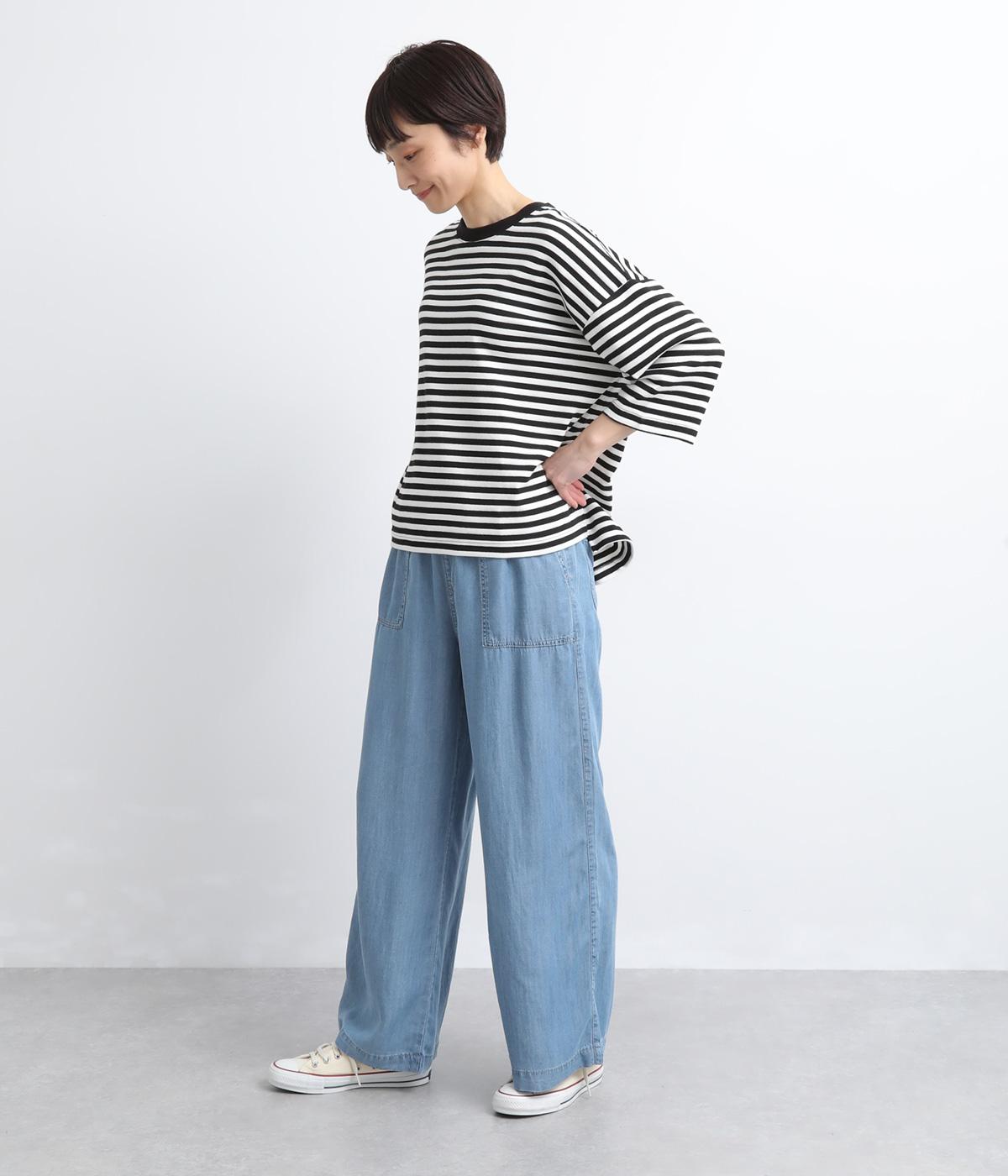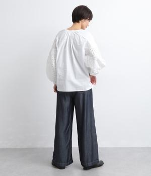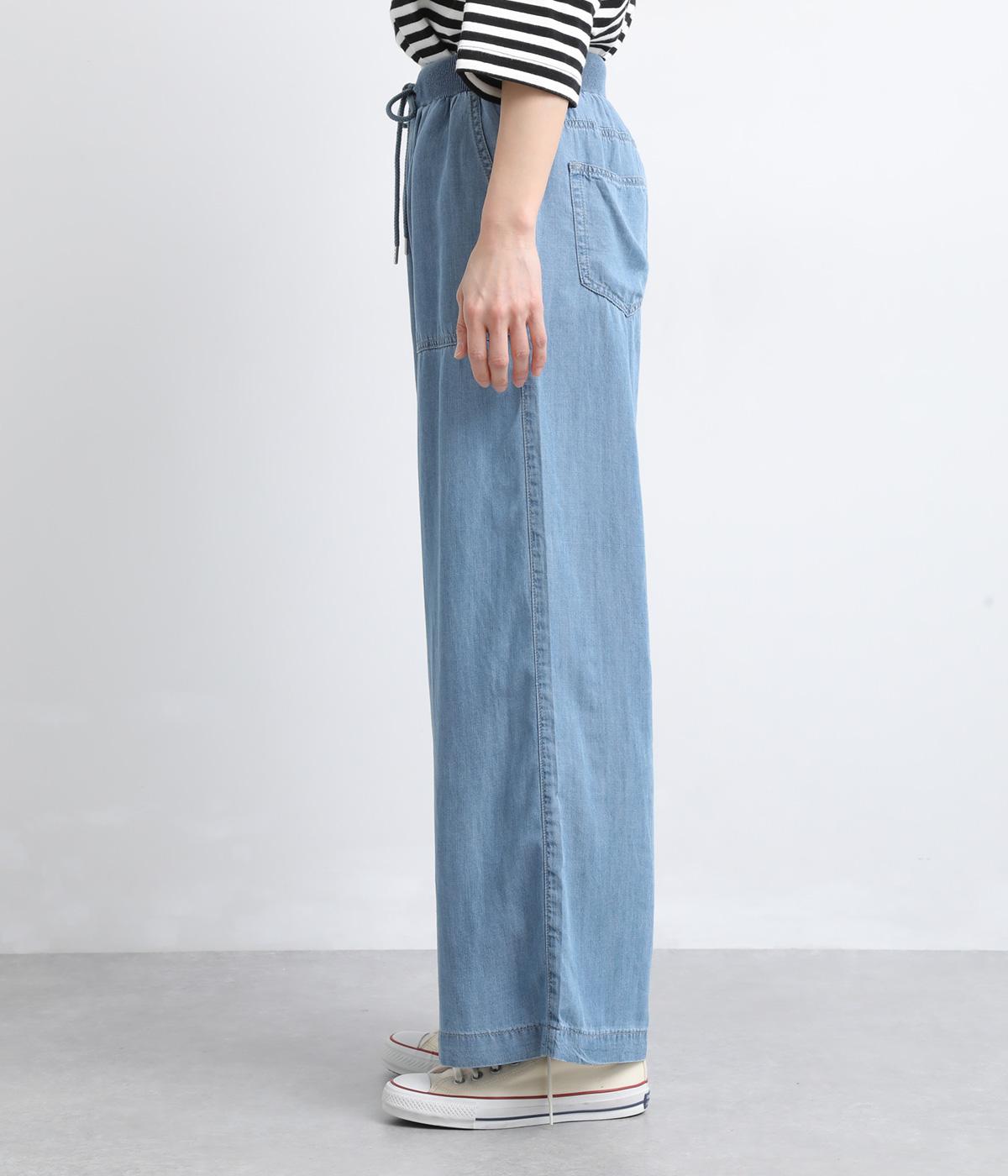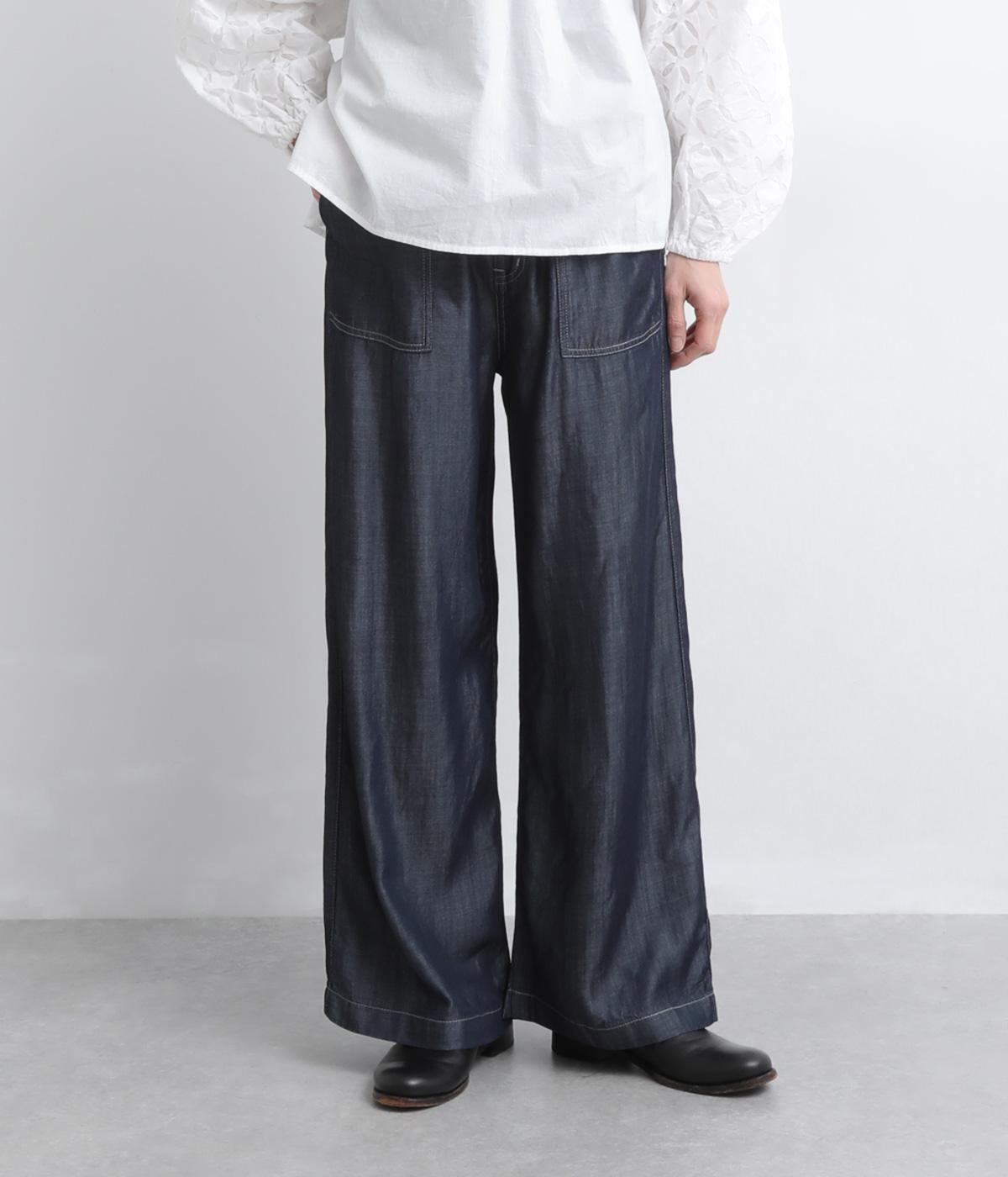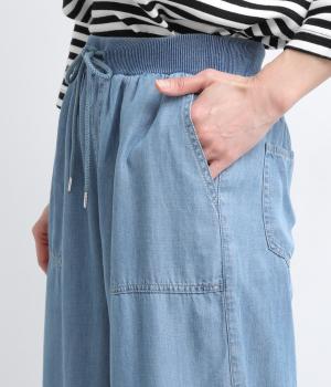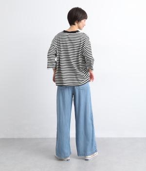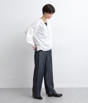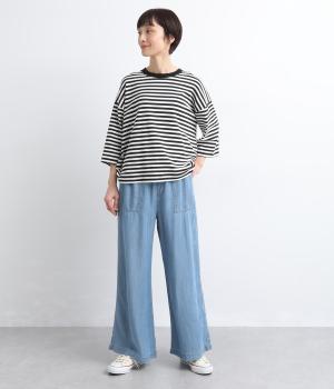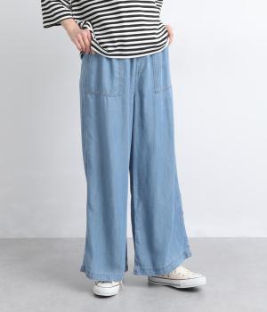 てろんとした落ち感が心地よい、薄手のデニム生地で仕立てました。しなやかさとほのかな光沢が、カジュアルすぎない上品な印象を添えます。風通しもよく、汗ばむ季節もさらりと快適。デイリー使いに取り入れやすい生地感です。
