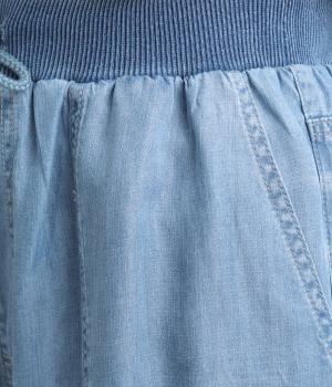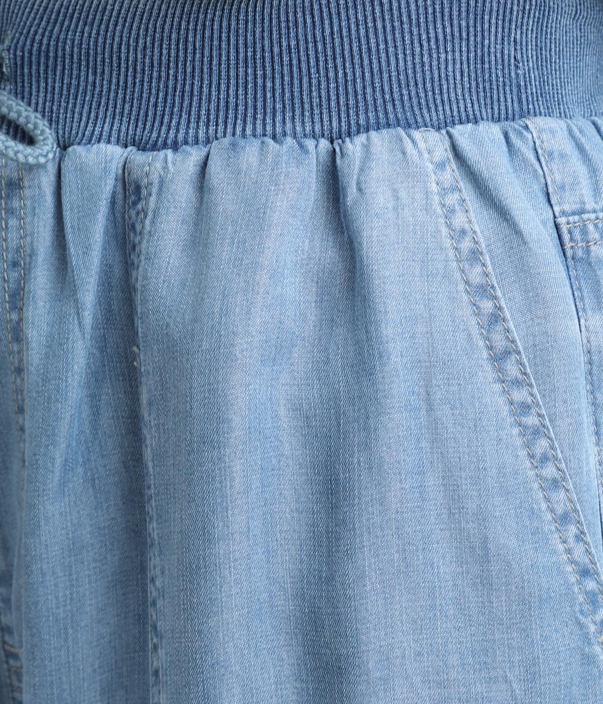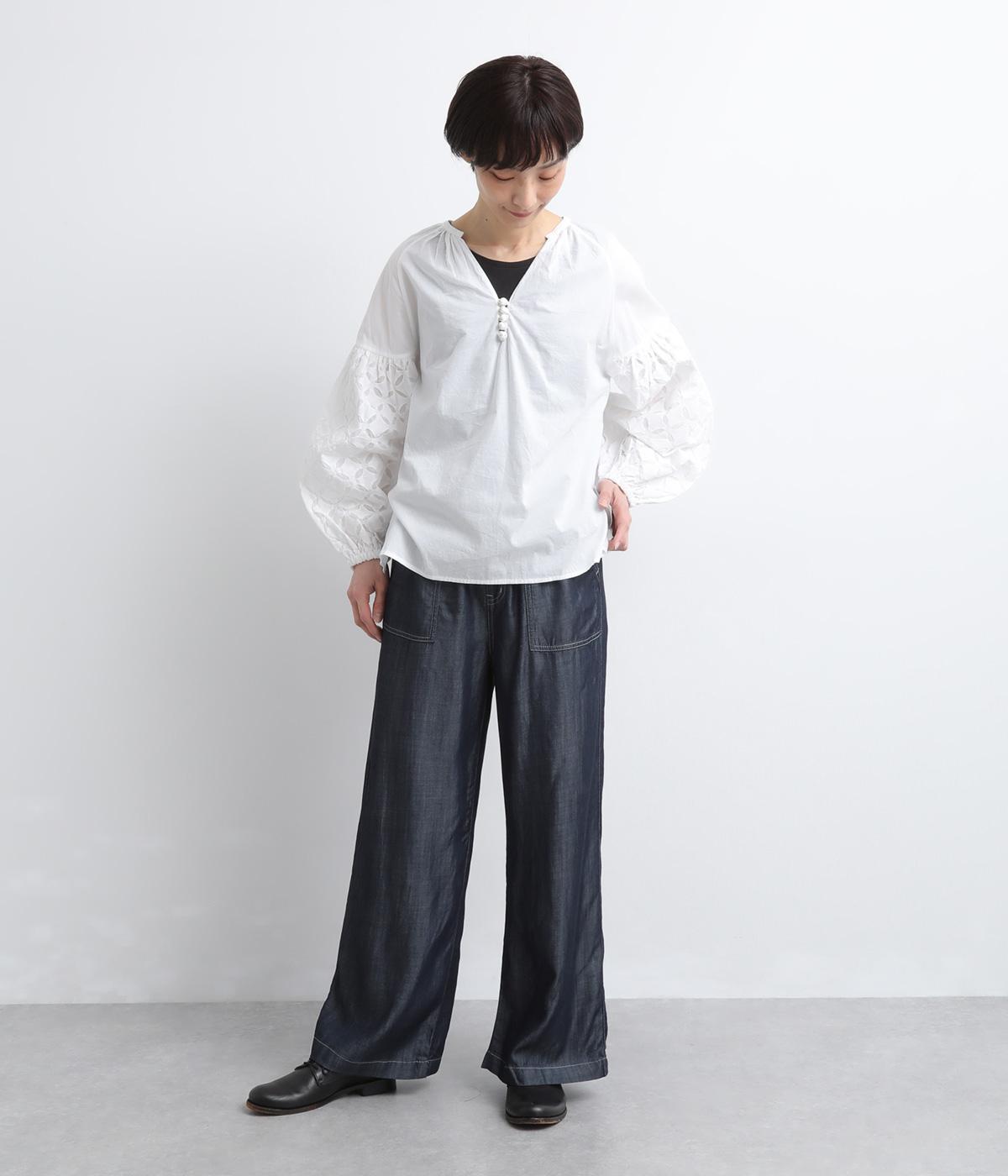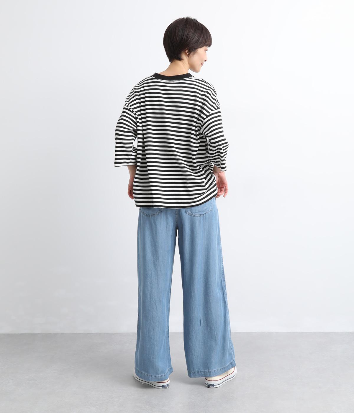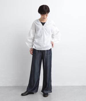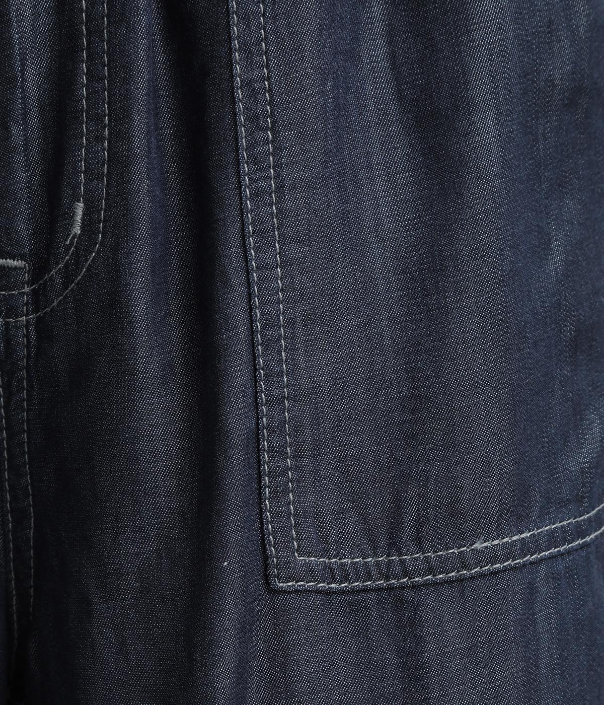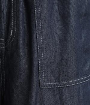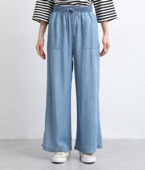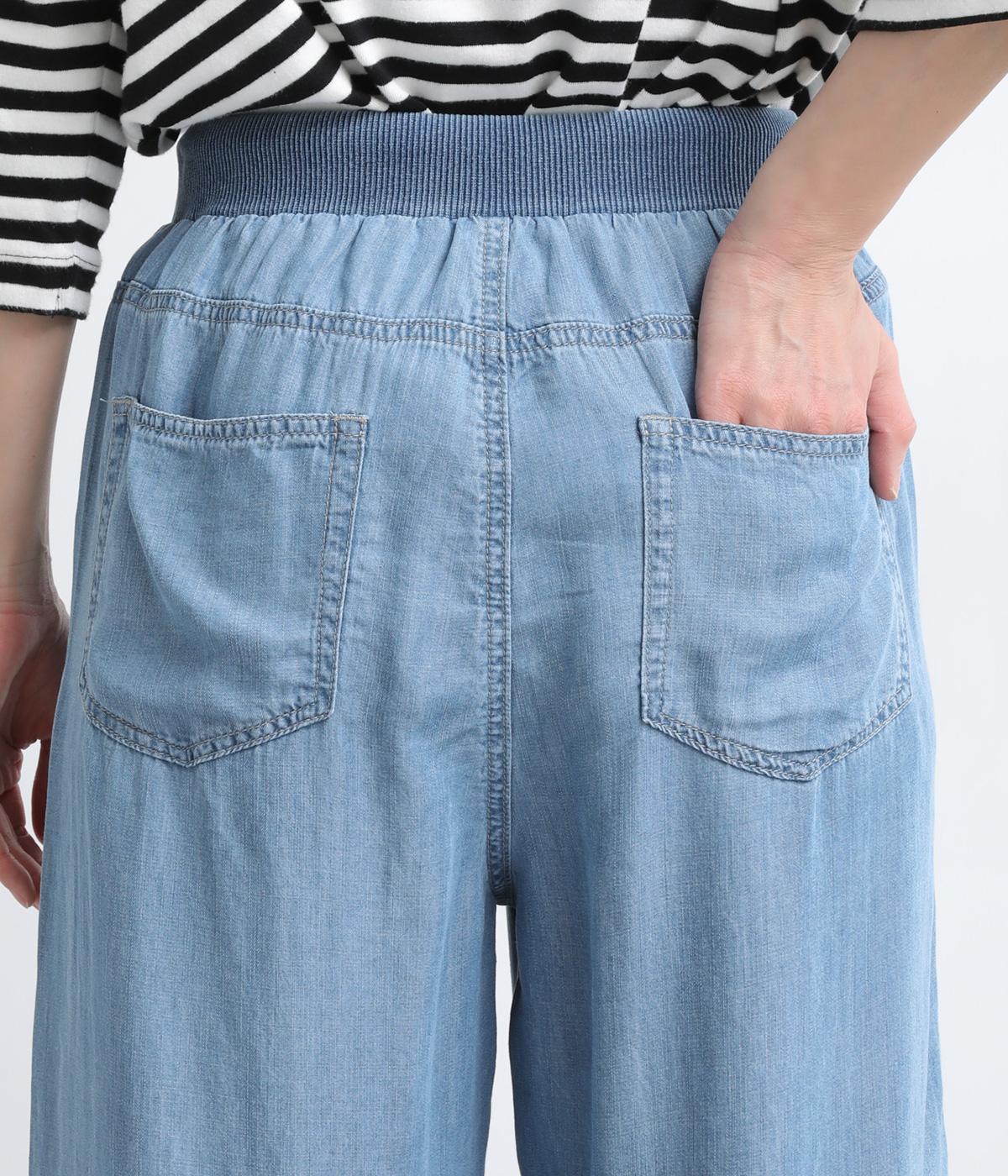 てろんとした落ち感が心地よい、薄手のデニム生地で仕立てました。しなやかさとほのかな光沢が、カジュアルすぎない上品な印象を添えます。風通しもよく、汗ばむ季節もさらりと快適。デイリー使いに取り入れやすい生地感です。