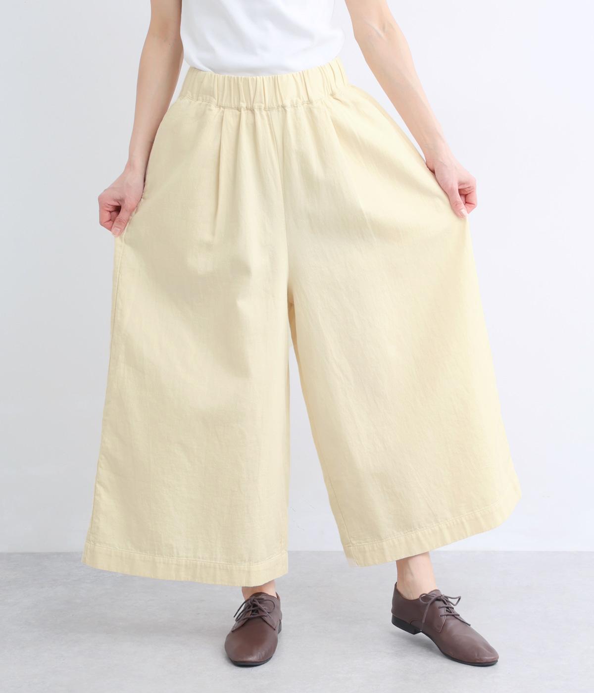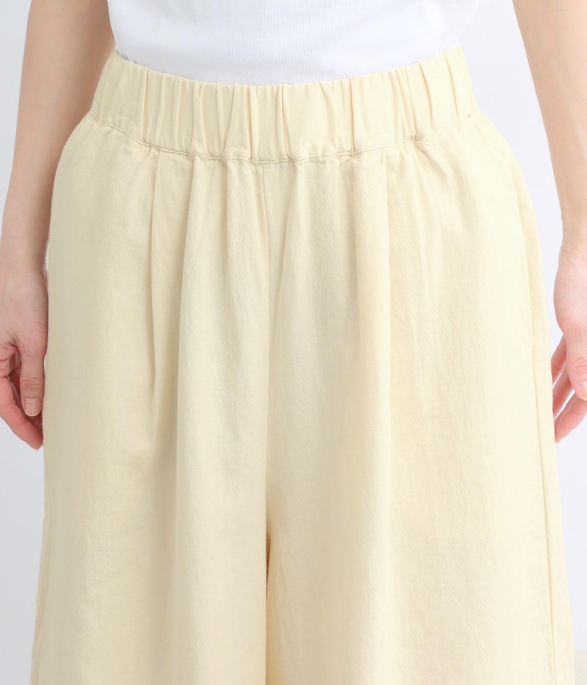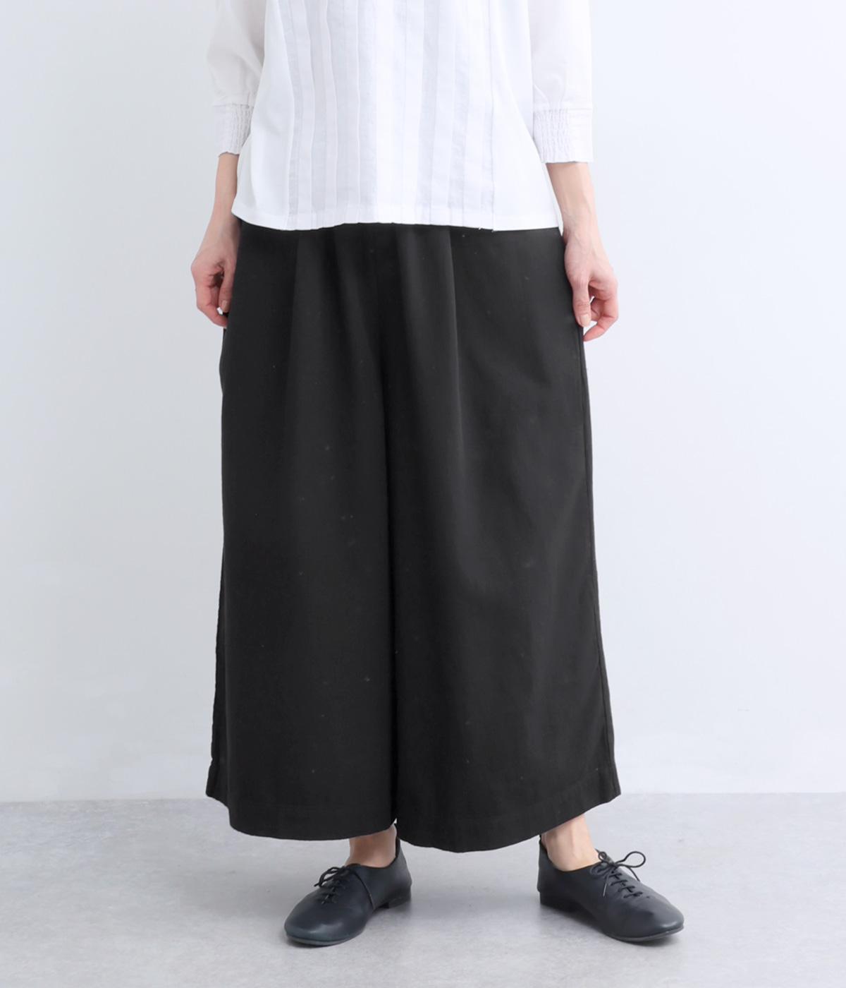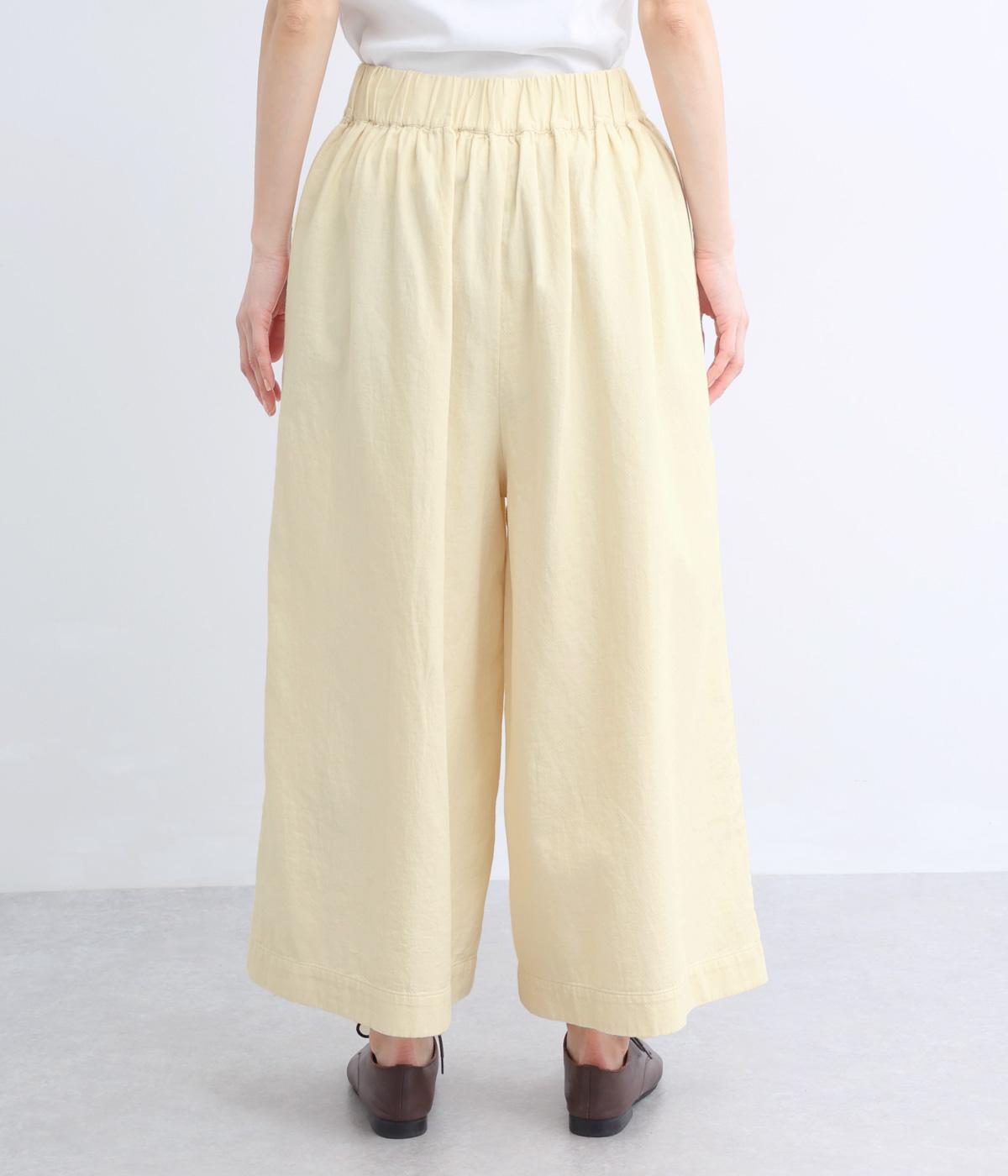 ウエストに入れたタックとギャザーが、やわらかな表情を生むガウチョパンツです。たっぷりとしたワイドシルエットで、スカートのような印象に仕上げました。ウエストはゴム仕様、股上は深めで、ゆったりと安心感のあるはき心地。幅広いコーディネートに合わせやすい、着まわしに便利な一枚です。