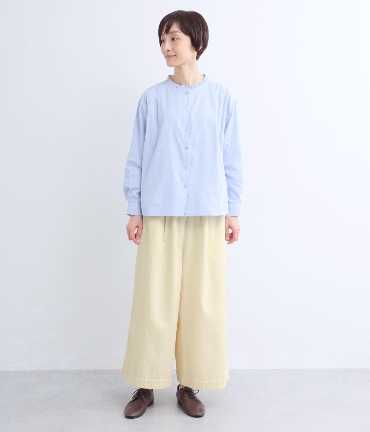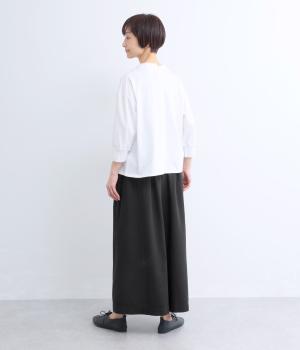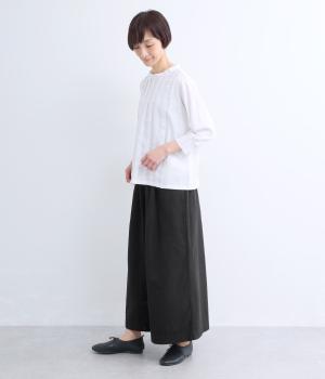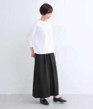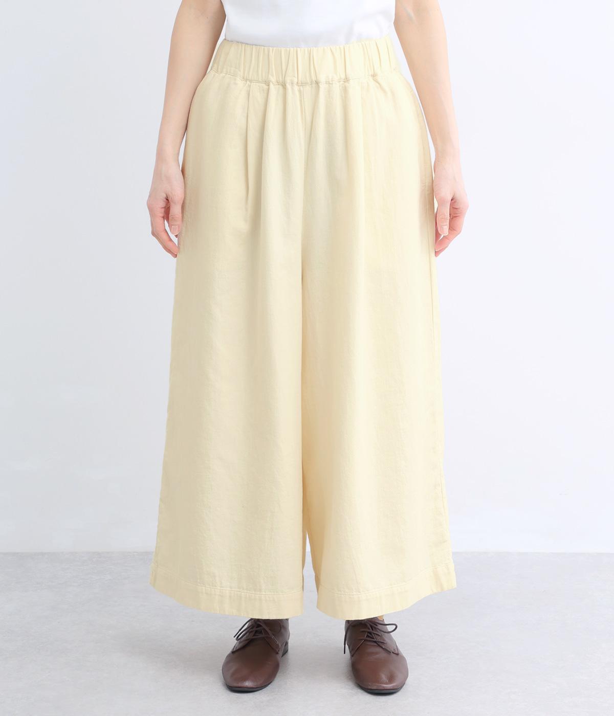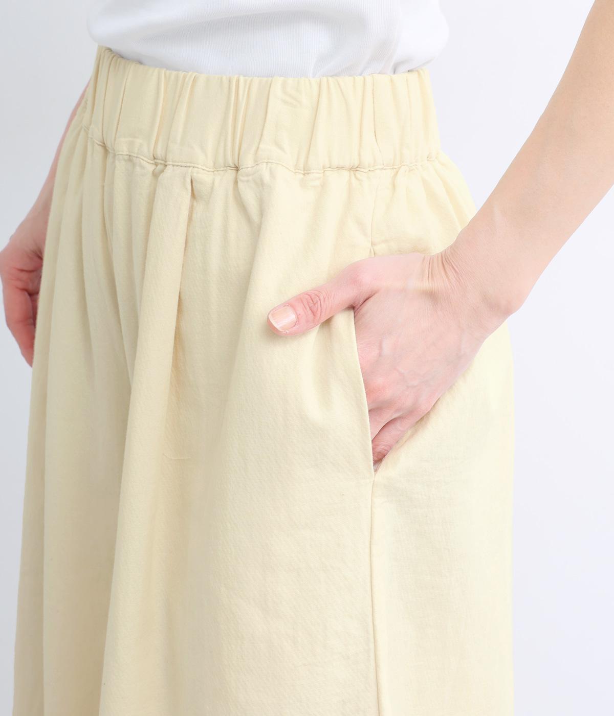 ウエストに入れたタックとギャザーが、やわらかな表情を生むガウチョパンツです。たっぷりとしたワイドシルエットで、スカートのような印象に仕上げました。ウエストはゴム仕様、股上は深めで、ゆったりと安心感のあるはき心地。幅広いコーディネートに合わせやすい、着まわしに便利な一枚です。