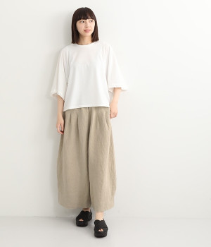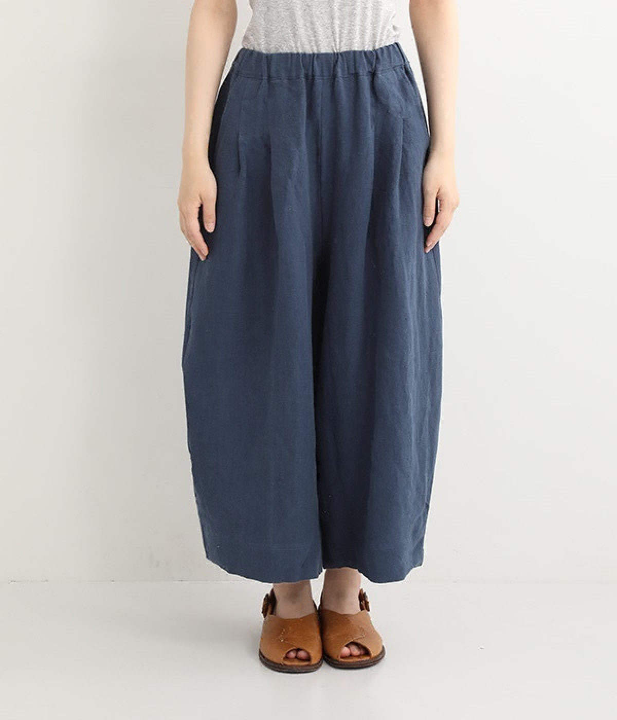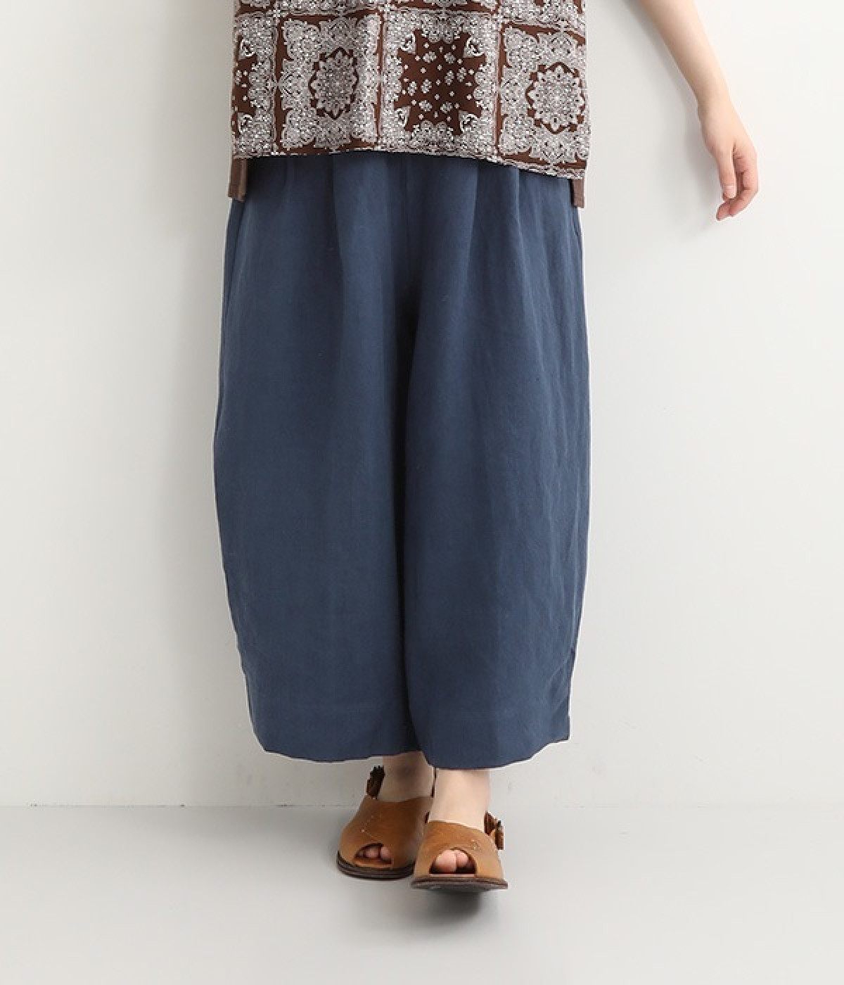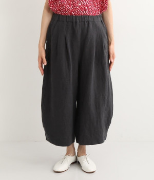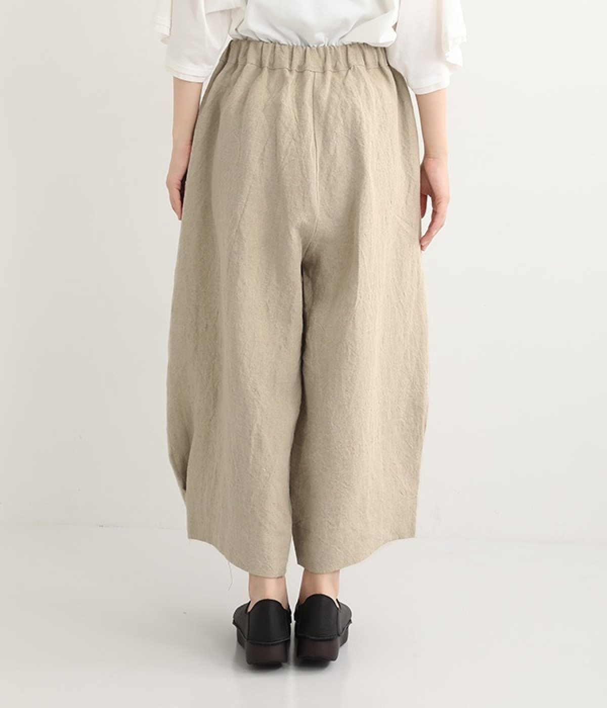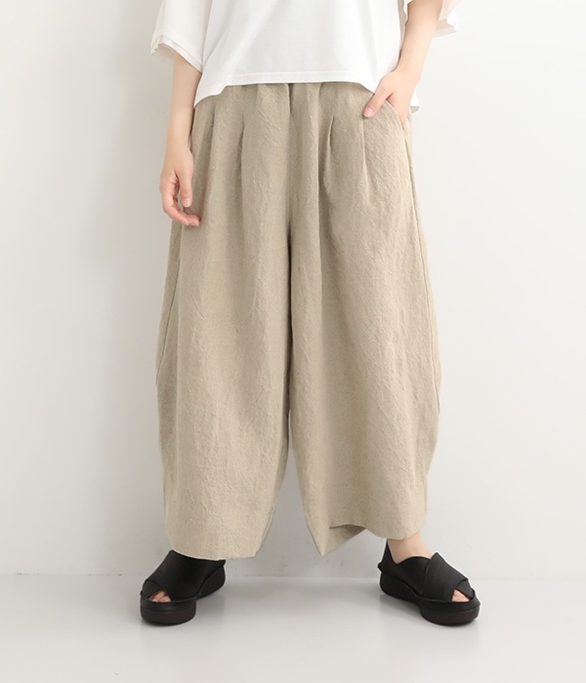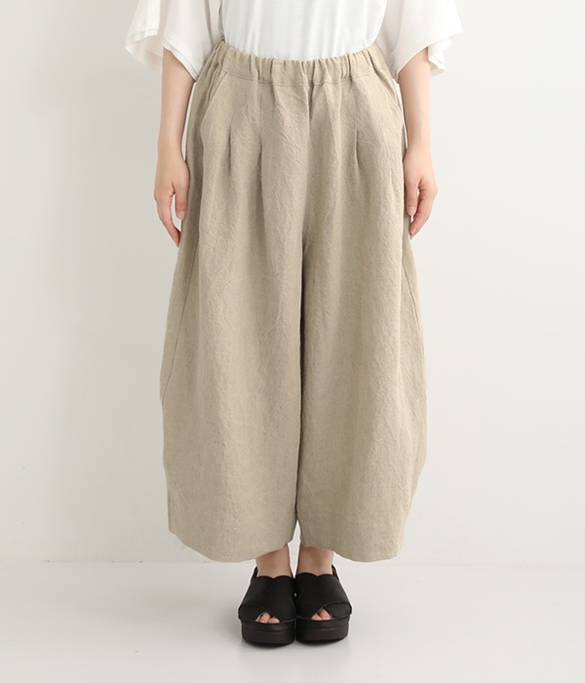 サルエルパンツと裾タックを合わせたパンツです。股上はサルエルより浅くなっているので、バックスタイルがもたつかず、ほどよいボリューム感を楽しんでいただけます。裾が少し狭まっていて、サーカスパンツのようになっているので、小柄な方でもバランスがとりやすいのもポイント。リネン100%のくたっとした肌ざわりも心地よいです。