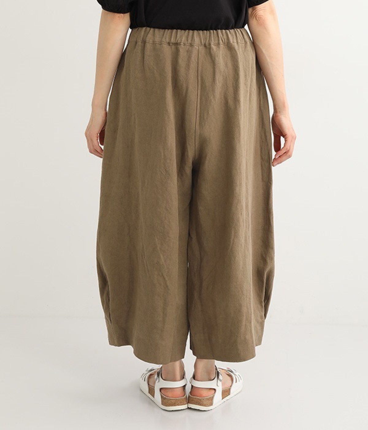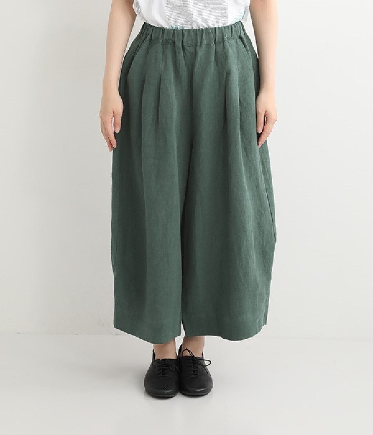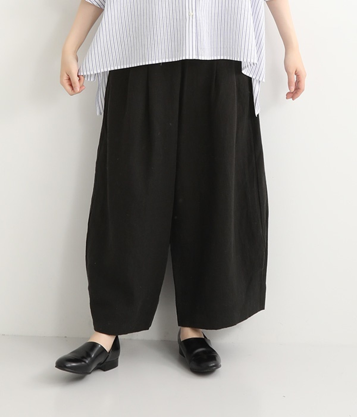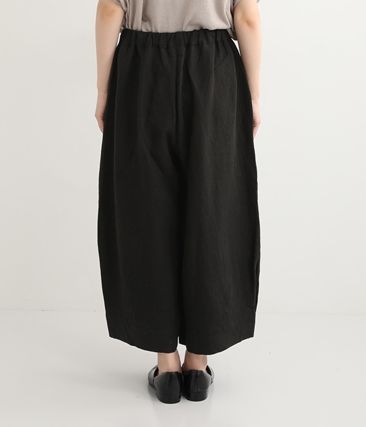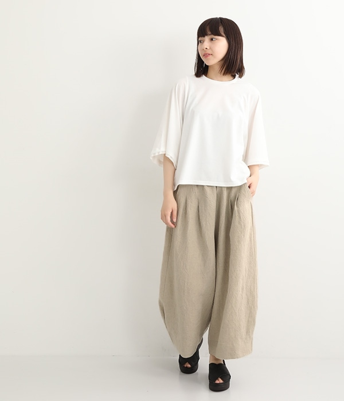 サルエルパンツと裾タックを合わせたパンツです。股上はサルエルより浅くなっているので、バックスタイルがもたつかず、ほどよいボリューム感を楽しんでいただけます。裾が少し狭まっていて、サーカスパンツのようになっているので、小柄な方でもバランスがとりやすいのもポイント。リネン100%のくたっとした肌ざわりも心地よいです。