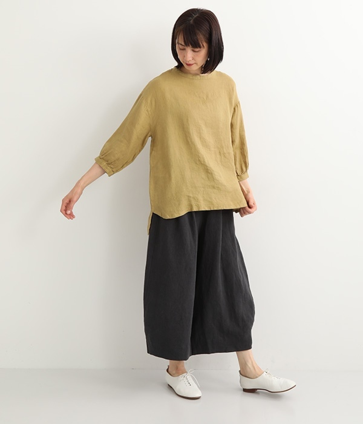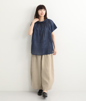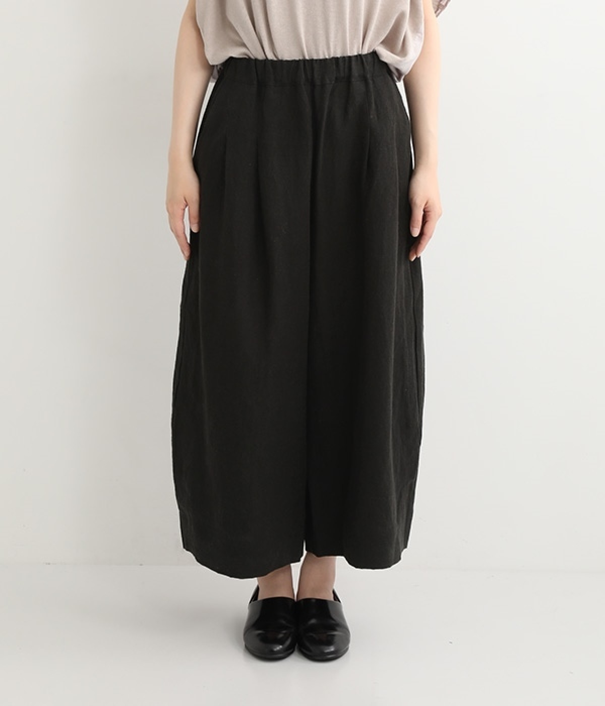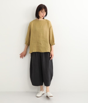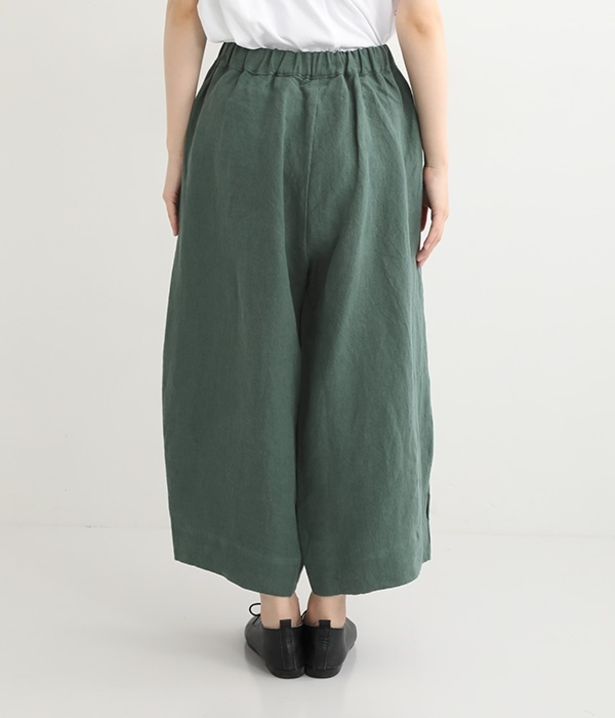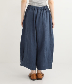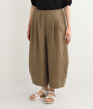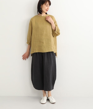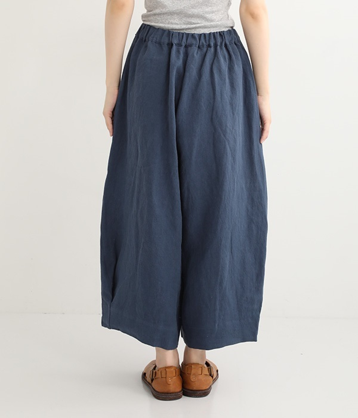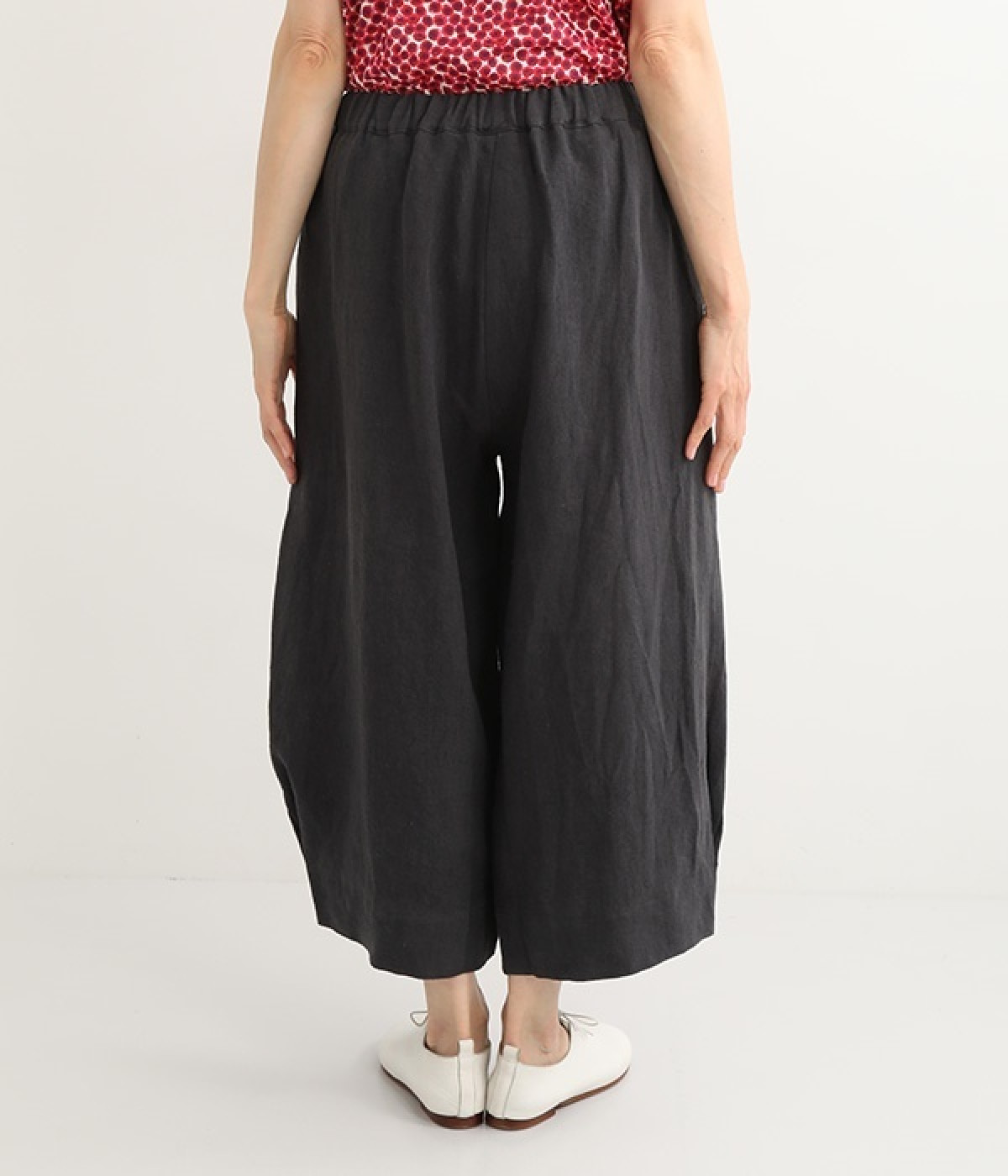サルエルパンツと裾タックを合わせたパンツです。股上はサルエルより浅くなっているので、バックスタイルがもたつかず、ほどよいボリューム感を楽しんでいただけます。裾が少し狭まっていて、サーカスパンツのようになっているので、小柄な方でもバランスがとりやすいのもポイント。リネン100%のくたっとした肌ざわりも心地よいです。