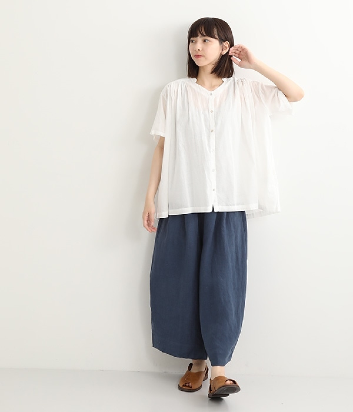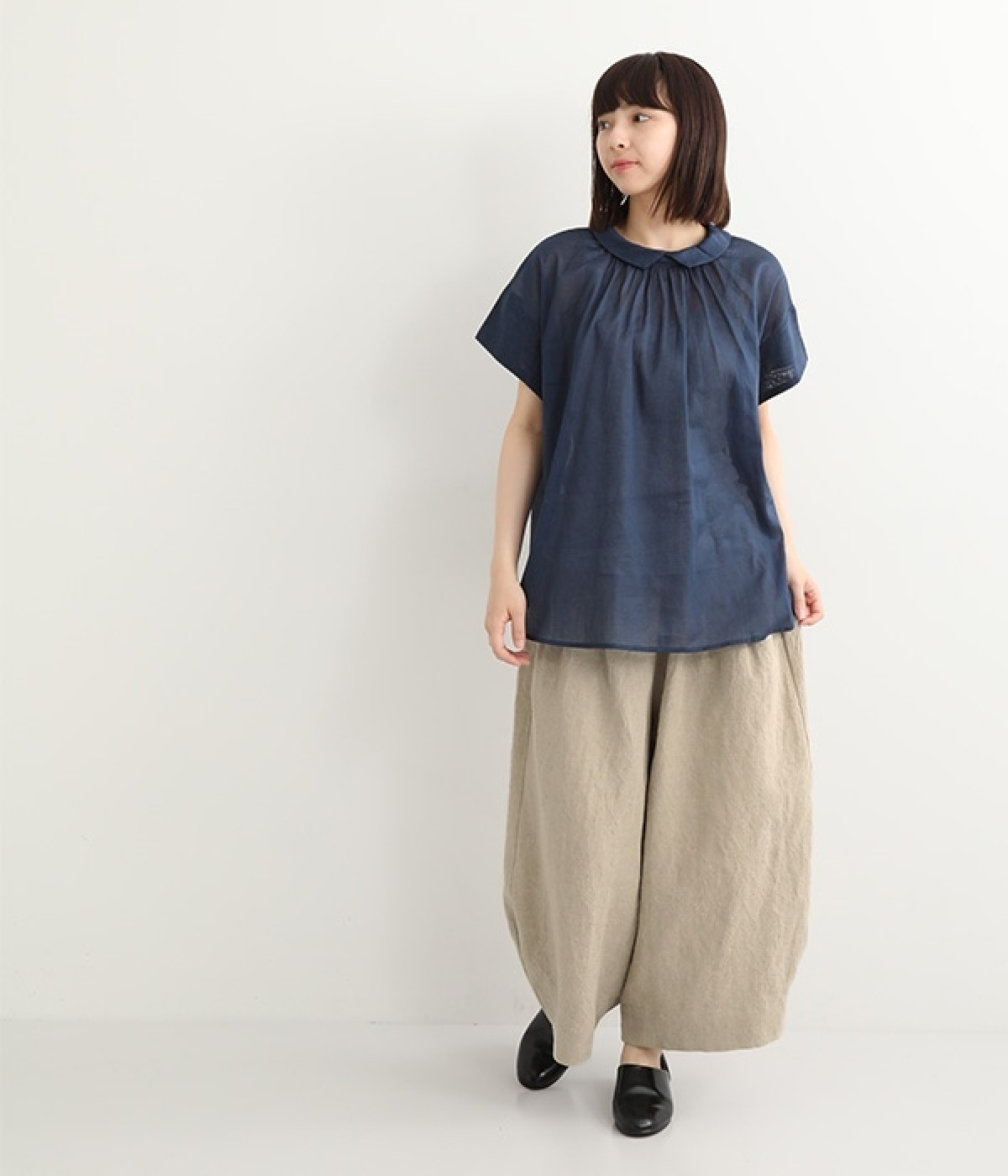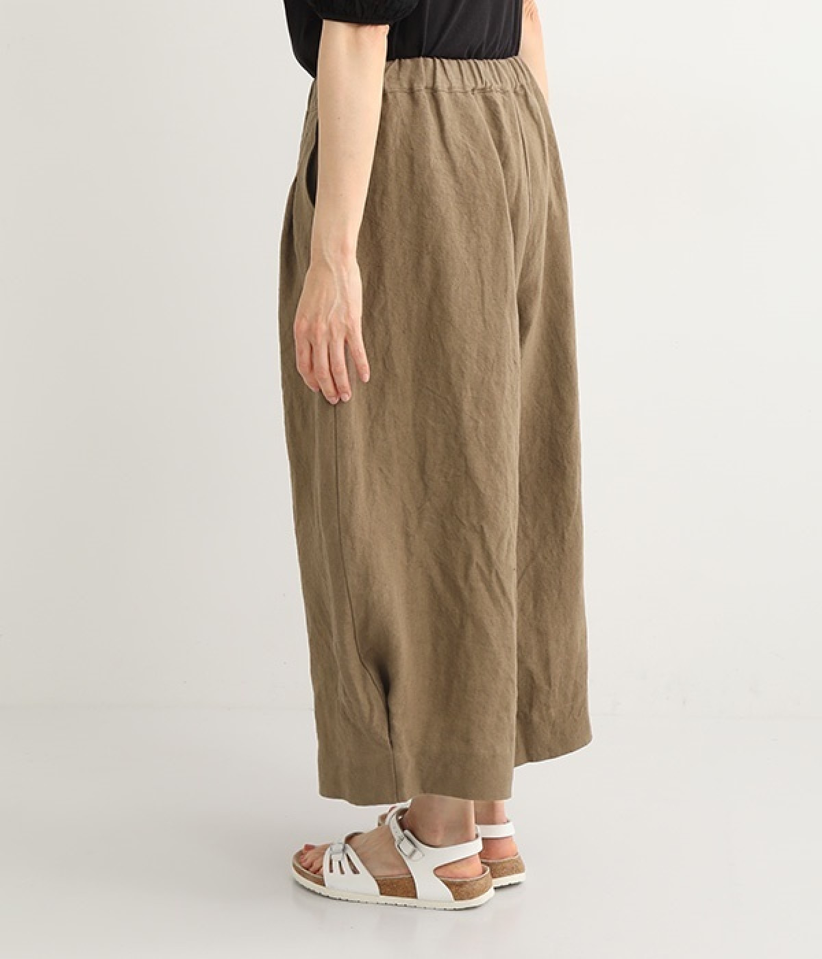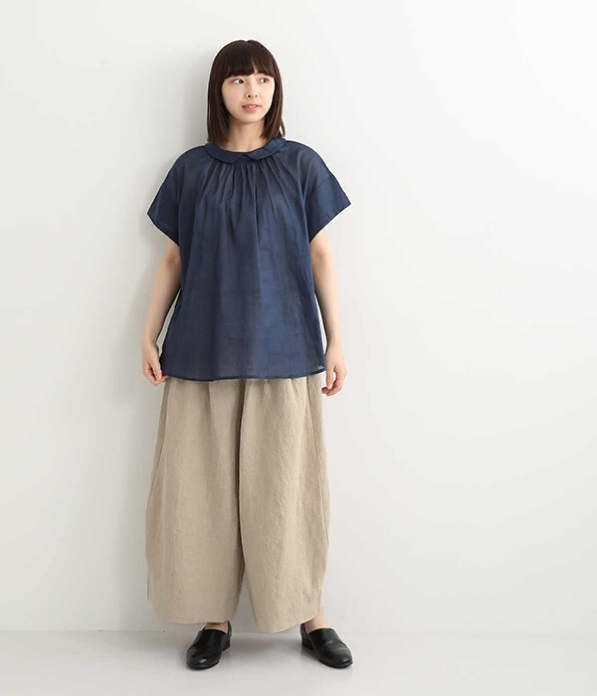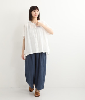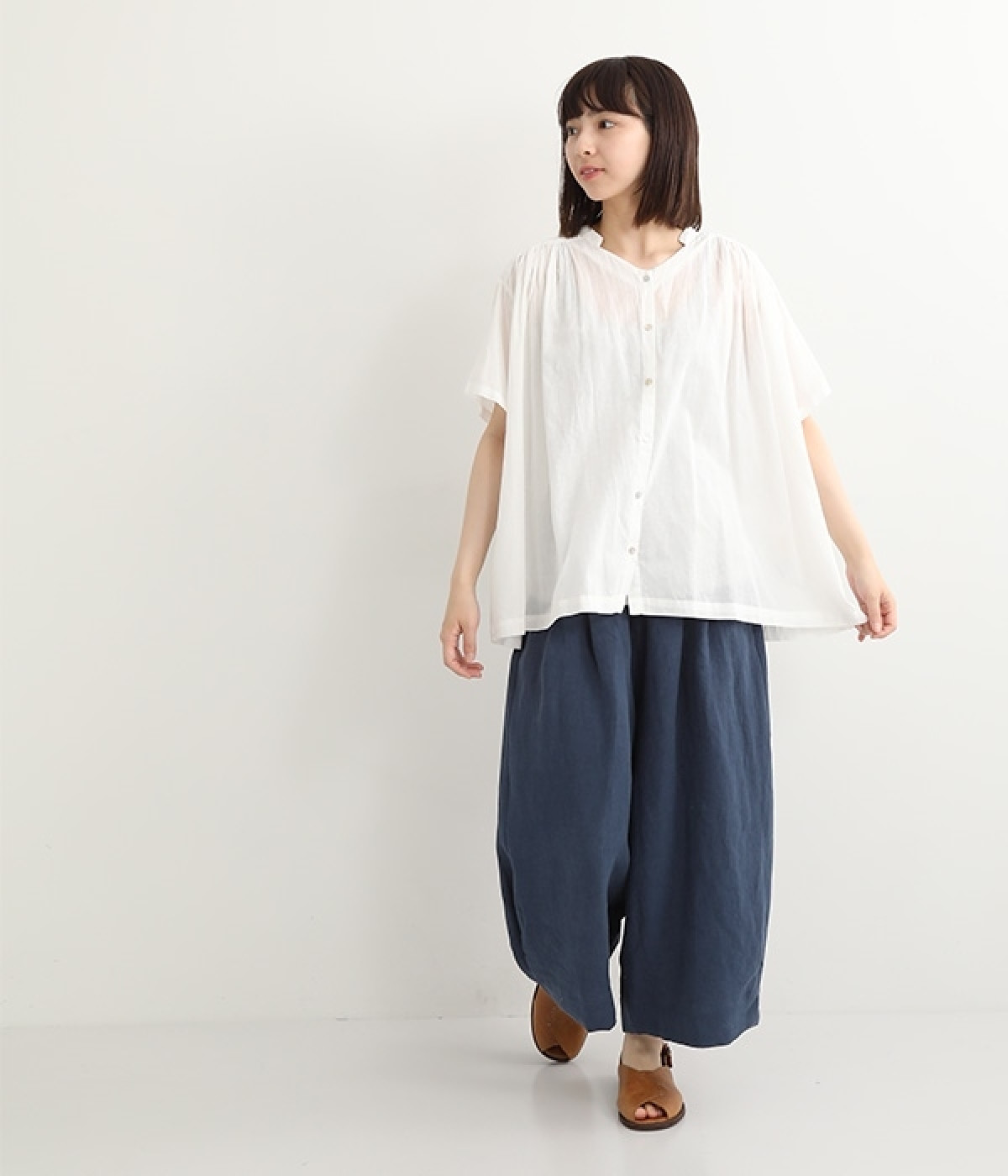 サルエルパンツと裾タックを合わせたパンツです。股上はサルエルより浅くなっているので、バックスタイルがもたつかず、ほどよいボリューム感を楽しんでいただけます。裾が少し狭まっていて、サーカスパンツのようになっているので、小柄な方でもバランスがとりやすいのもポイント。リネン100%のくたっとした肌ざわりも心地よいです。